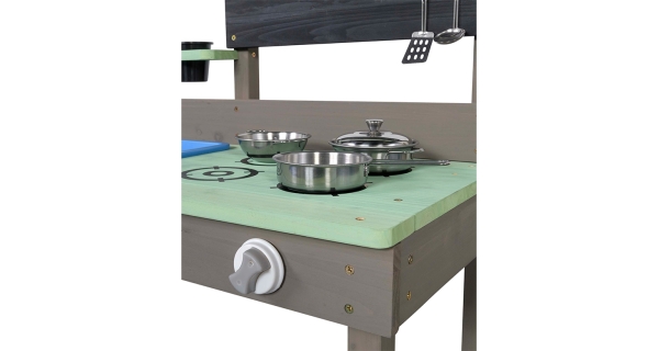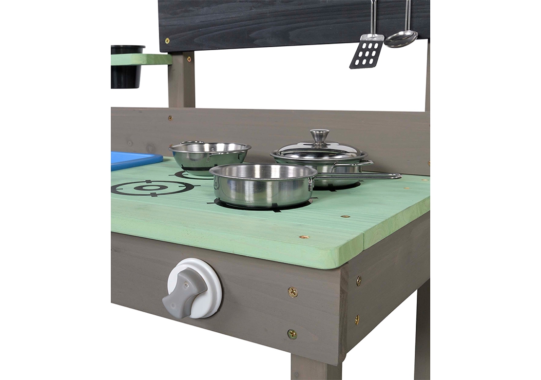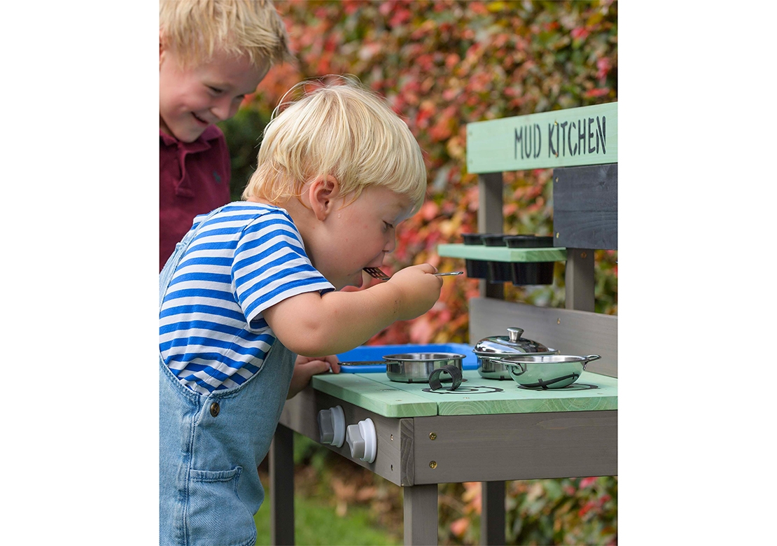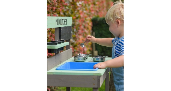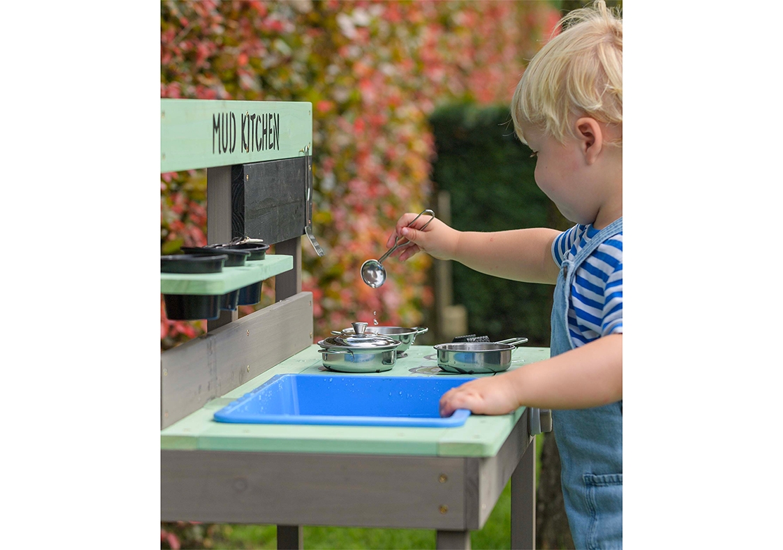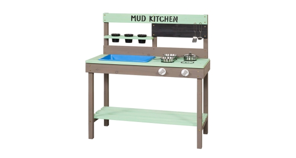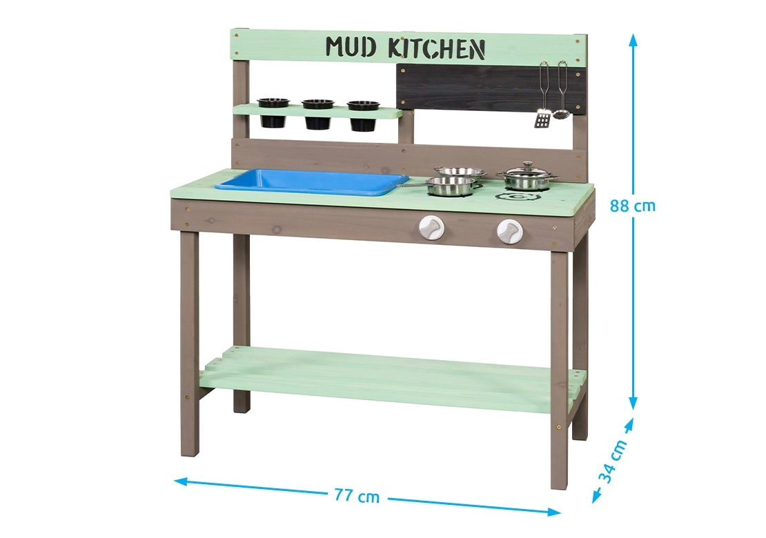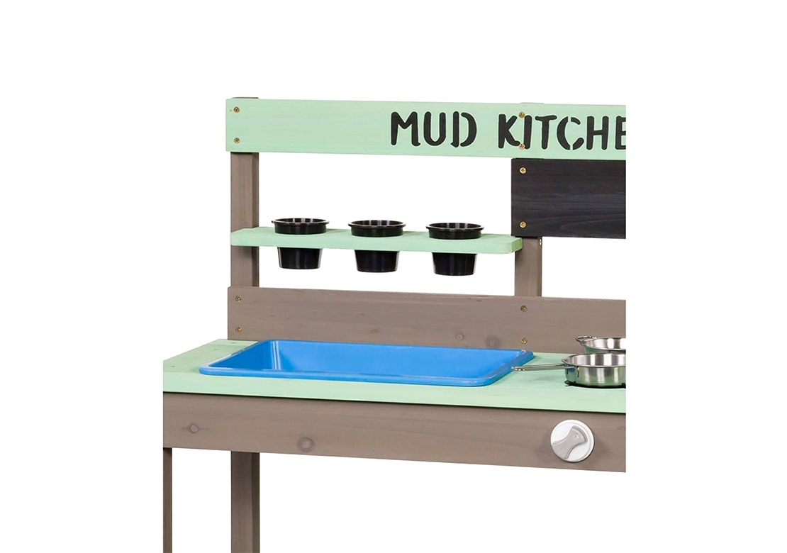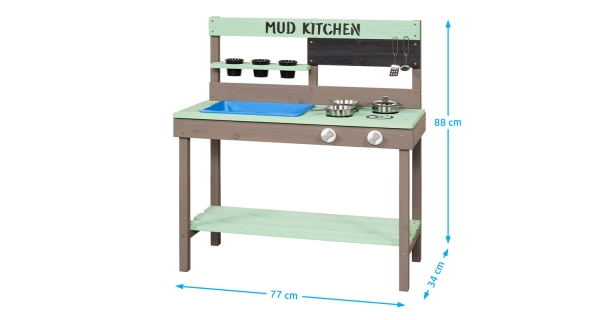 Vonkajšia drevená "bahenná" kuchynka MUD je vyrobená z farebného dreva s ochranným náterom, ktorý nevyžaduje už žiadnu ďalšiu úpravu. Kuchynka má vo výbave kvetináče a riad. Podnos je možné naplniť vodou alebo pieskom, aby sa deti mohli hrať s blatom.