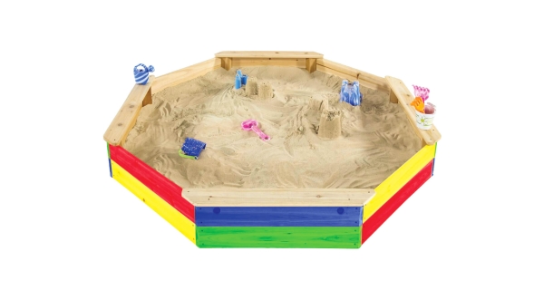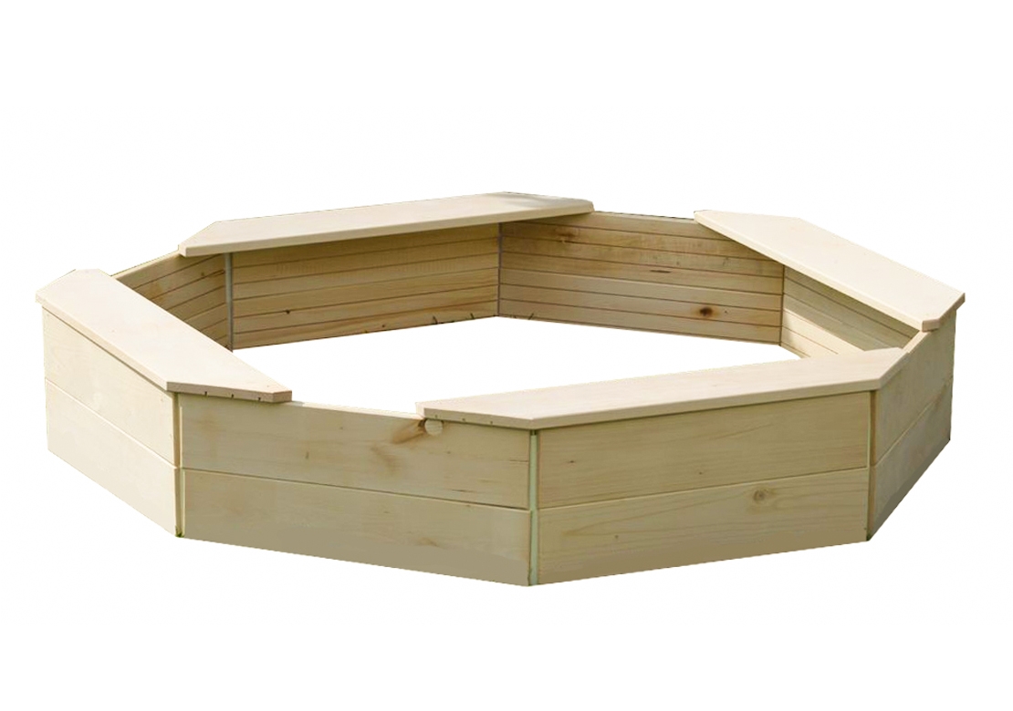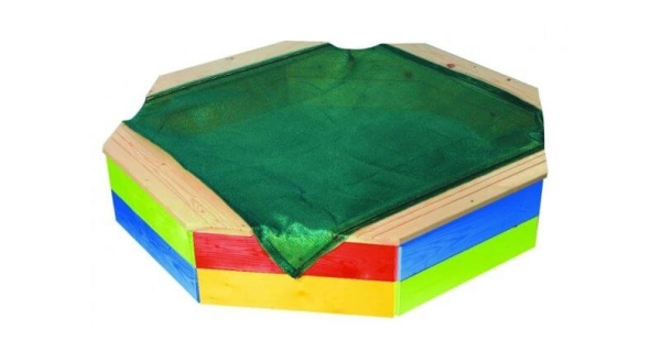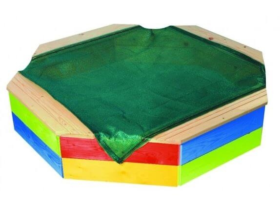Drevené 8 hranné pieskovisko so štyrmi sedadlami a ochrannou sieťou. |