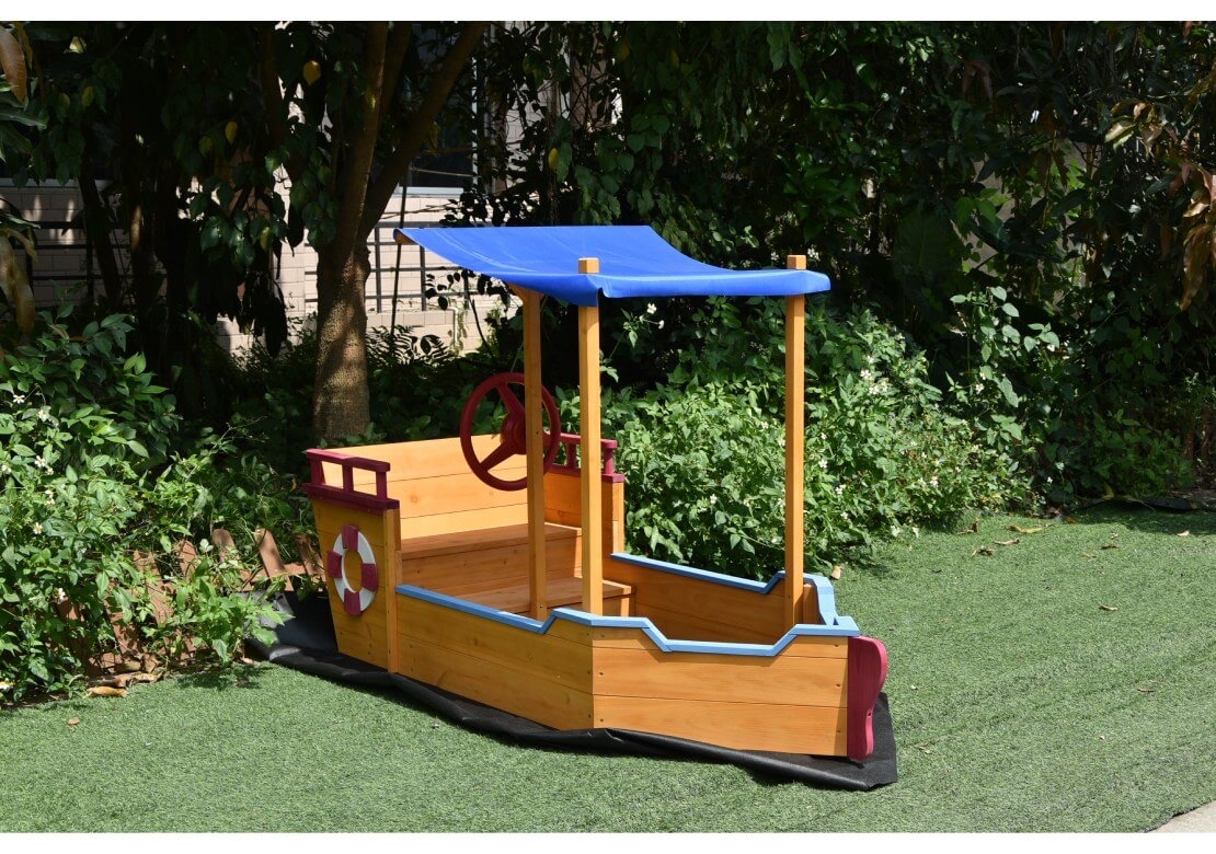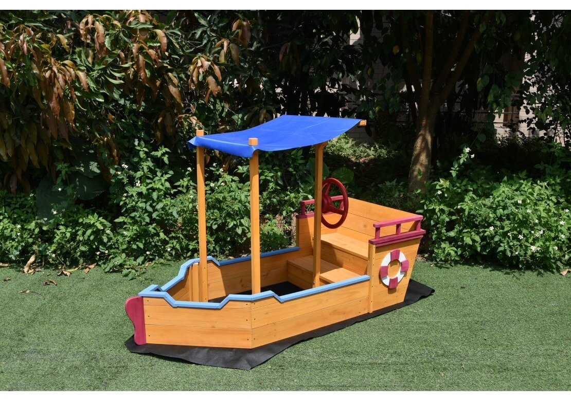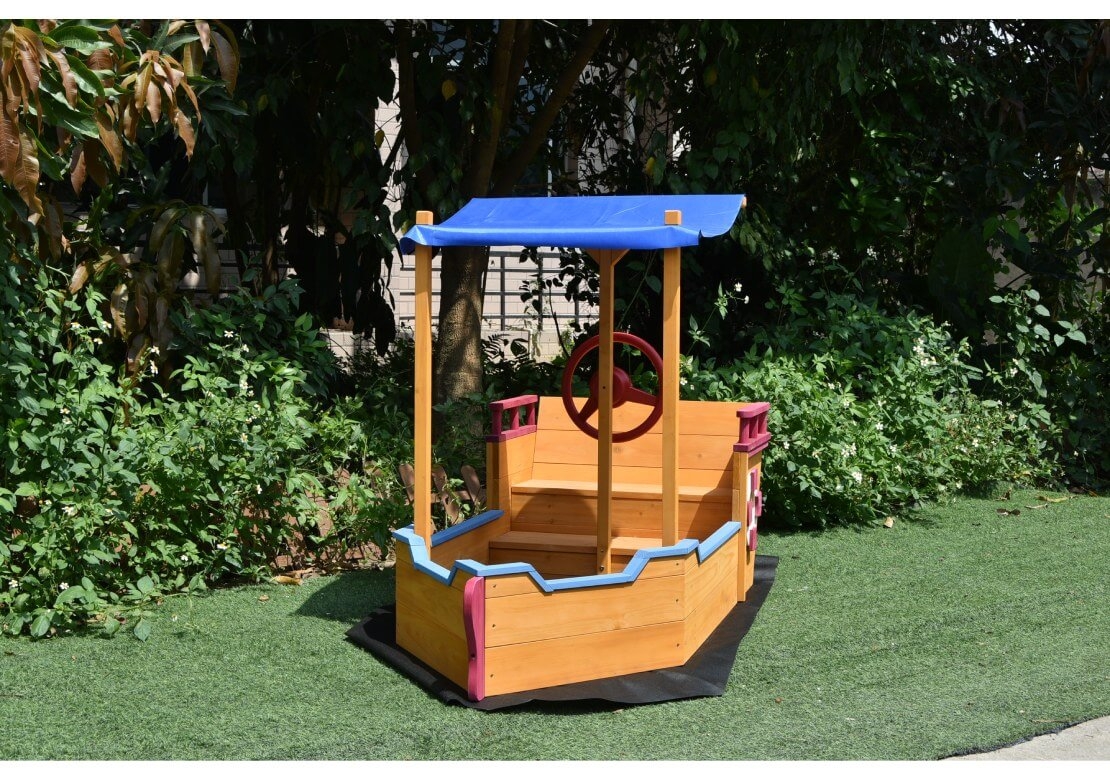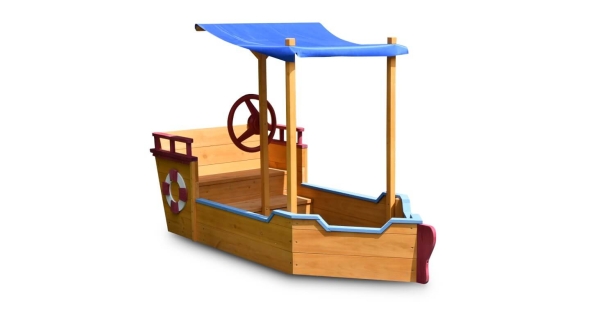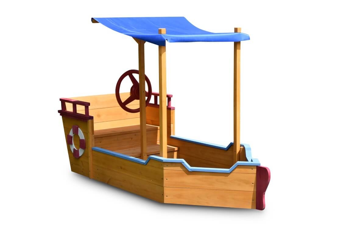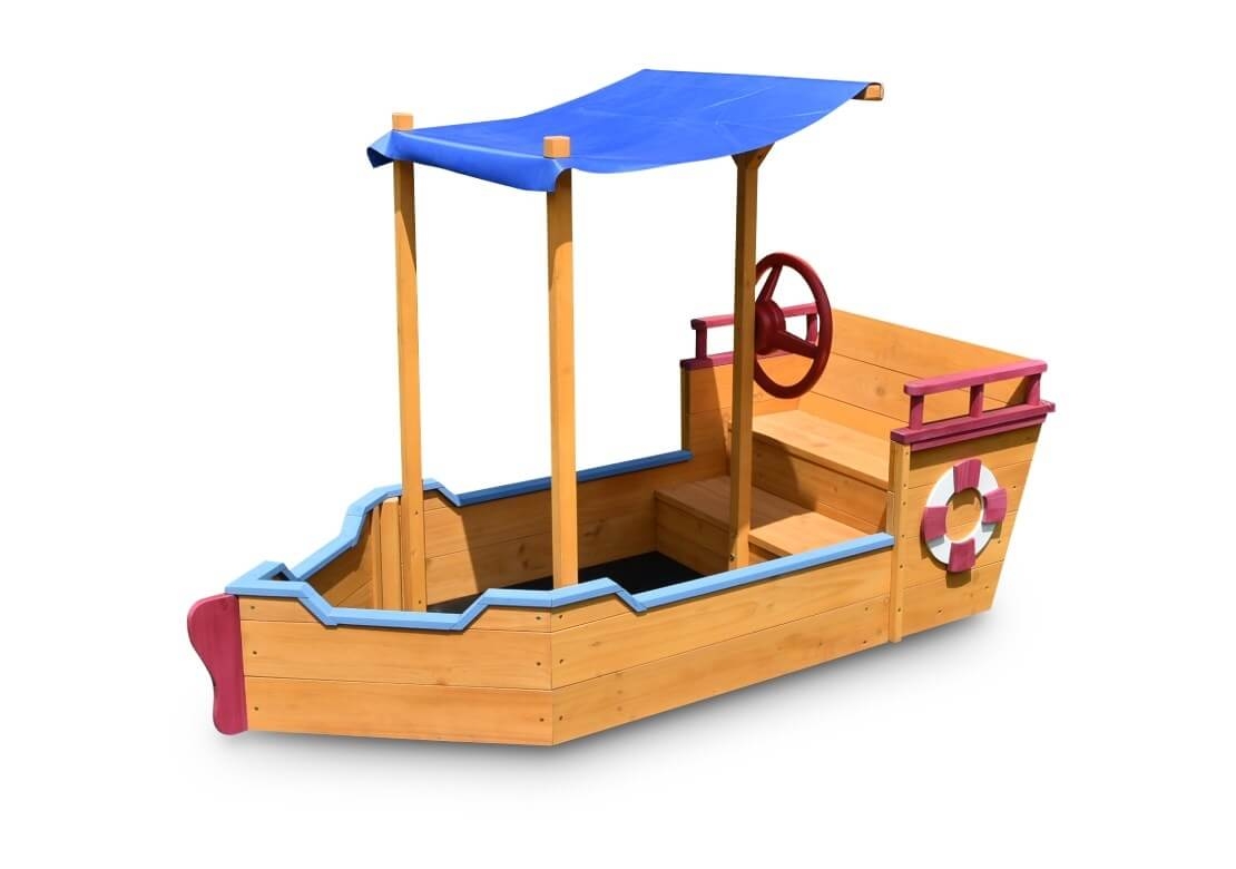 Krycia strieška je vyrobená z nepremokavého materiálu (PE). Súčasťou balenia je aj kormidlové koleso. V lodi je lavička na sedenie so zabudovaným úložným priestorom na hračky. Pieskovisko nemá dno. Dodávané vrátane podložky pod pieskovisko (čierna) Povrchovo ošetrené krycím náterom. Vhodné pre deti od 3 rokov.