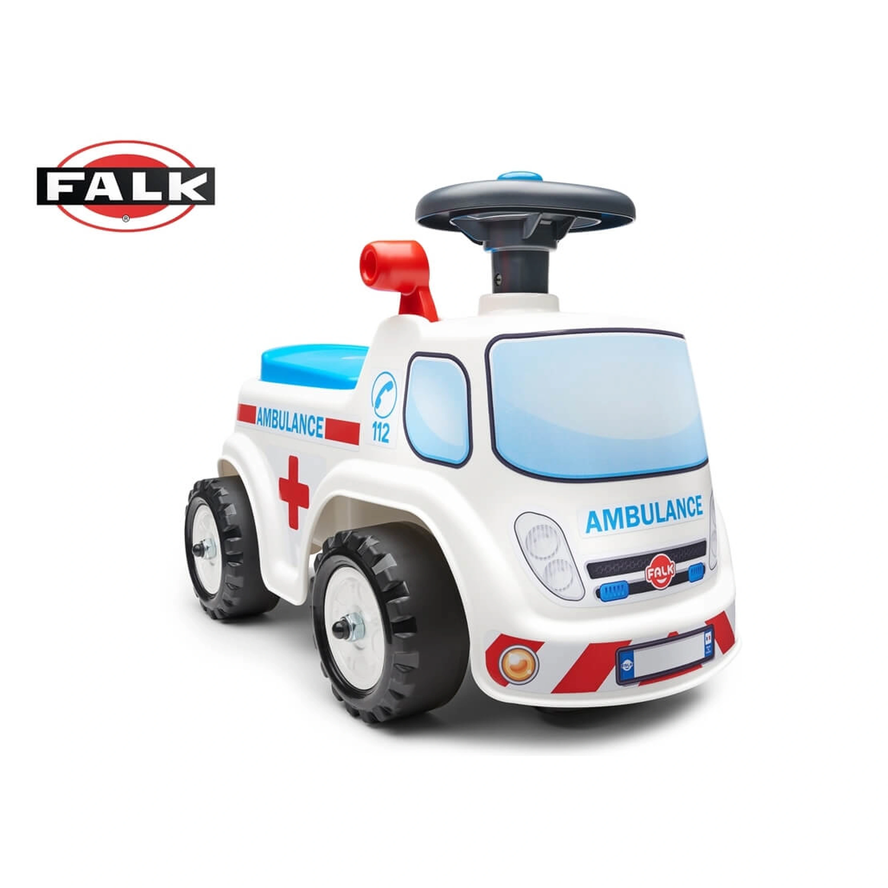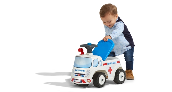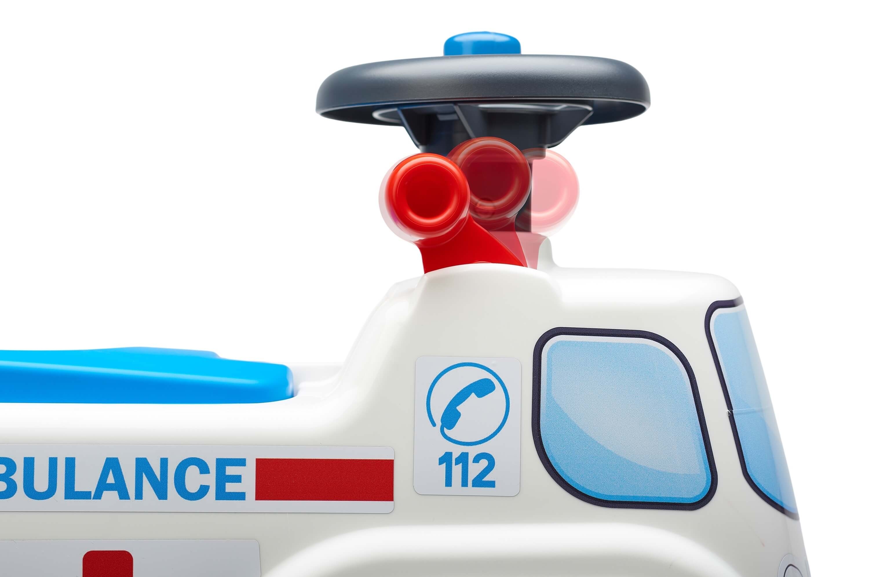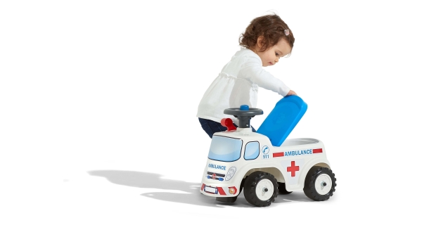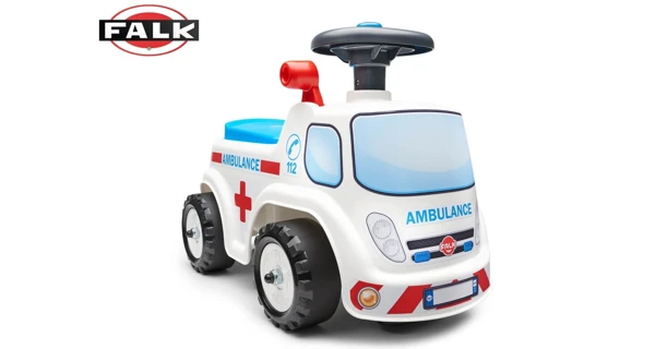 Detské odrážadlo v tvare sanitky, od francúzskeho výrobcu FALK. Vyrobené z vysoko kvalitného a odolného plastu s ohľadom na bezpečnosť detí. Otváracie sedadlo s úložným priestorom vo vnútri. Na volante je umiestnený funkčný klaksón. Odrážadlo má kvalitné nálepky, ktoré dotvárajú podarený, hravý dizajn. Pre deti od 1 roku.