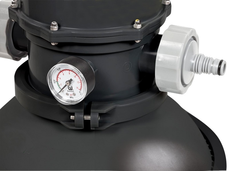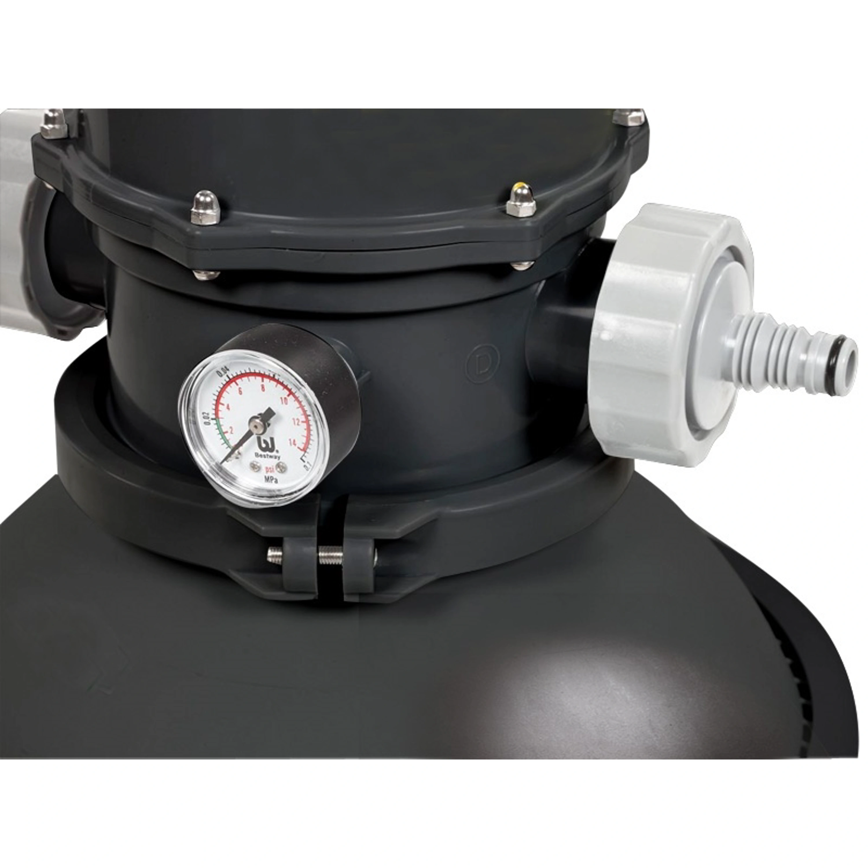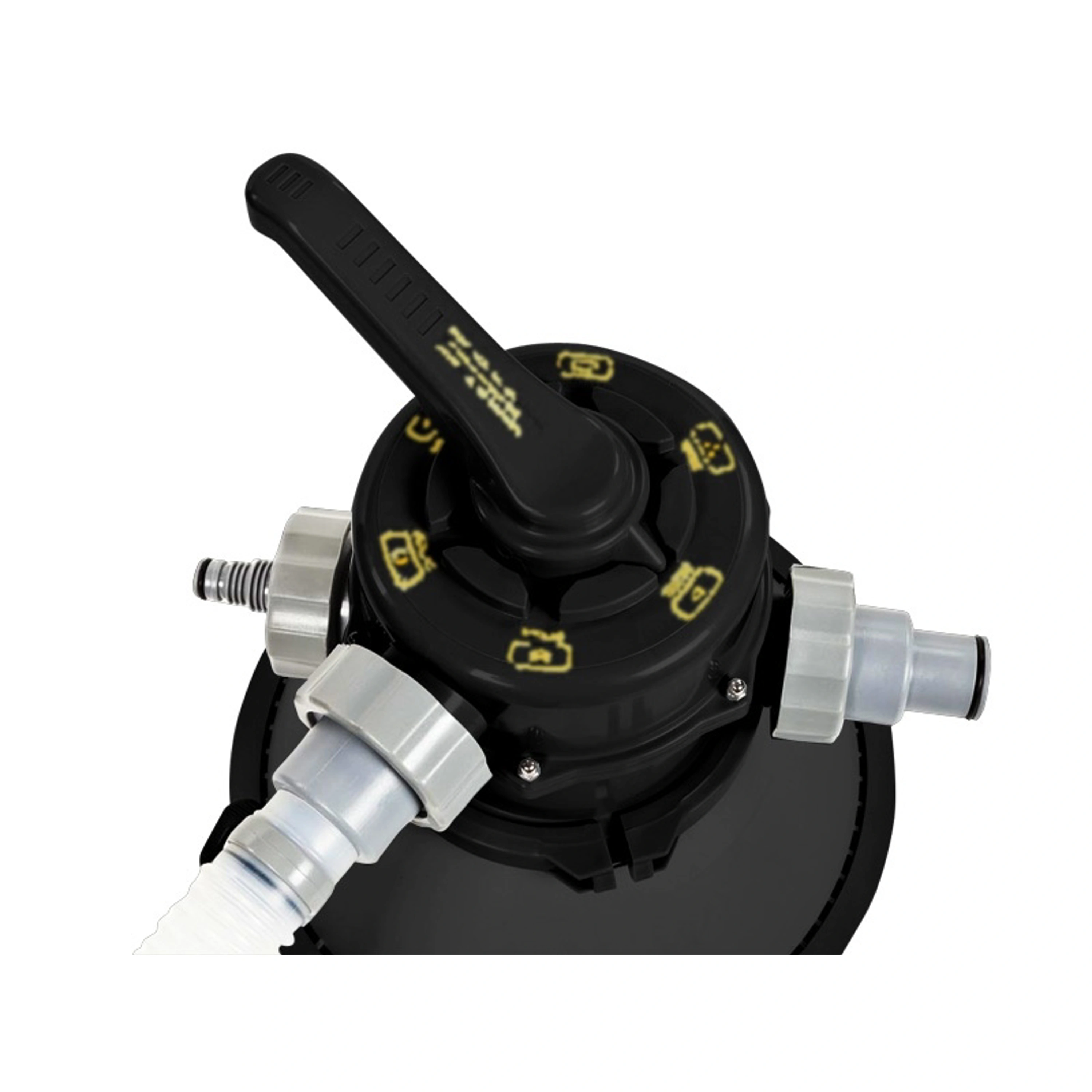Filtrácia je vybavená odvodňovacím ventilom, tlakomerom, vstavanými komponenty filtračnej nádoby vrátane ľahko ovládateľného 6-ti cestného ventilu (ktorý je zabudovaný do veka filtračnej nádoby), motorom čerpadlá s príkonom 90W, plastovou základňou pre montáž v mieste inštalácie. Systém je vyrobený z vysoko kvalitných materiálov pri prísnom dodržiavaní technických noriem a prechádza výstupnou kontrolou.