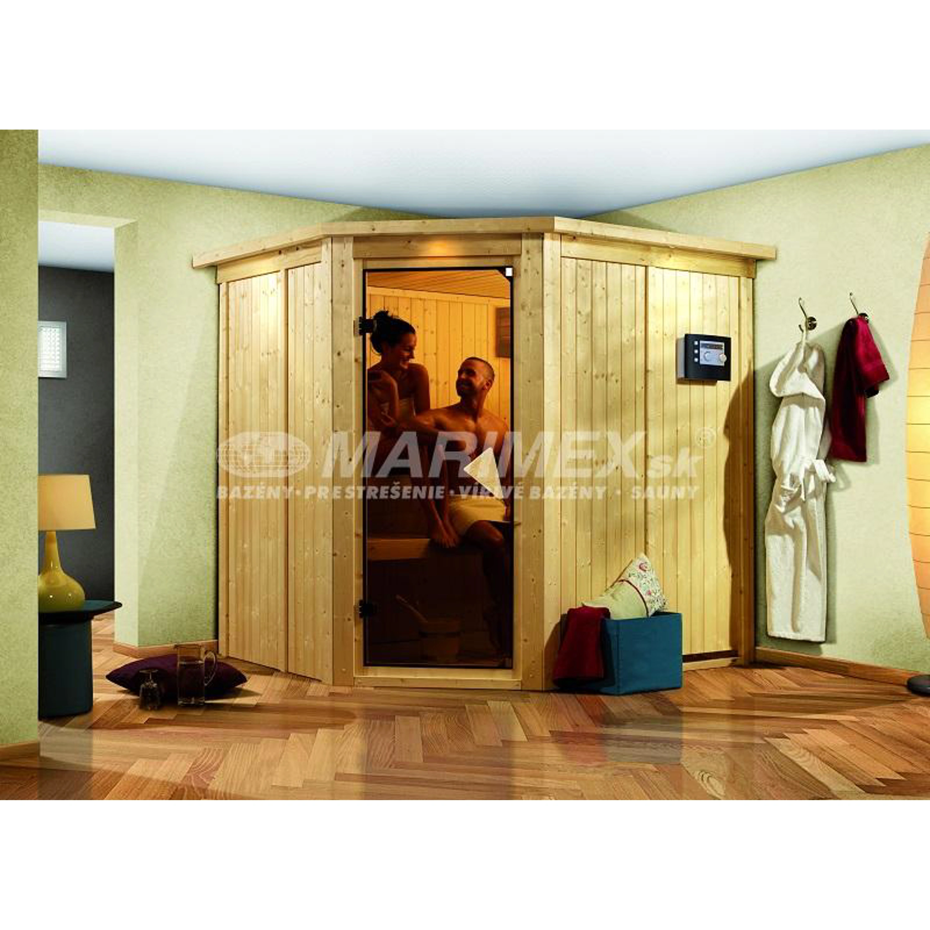 - saunový korpus: materiál severský smrek najvyššej kvality, hrúbka steny 68 mm vrátane 42 mm minerálnej izolácie