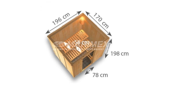 Fínska sauna od európskeho výrobcu Karibu. Nemecký výrobca zaručuje veľmi kvalitné materiály použité pri výrobe a dokonalé dielenské spracovanie. Sauna je pripravená k svojpomocnej montáži. Pôdorys sauny je obdĺžnikový, vstup je uprostred dlhšej steny. K fínskej saune je nutné zakúpiť saunovú piecku!