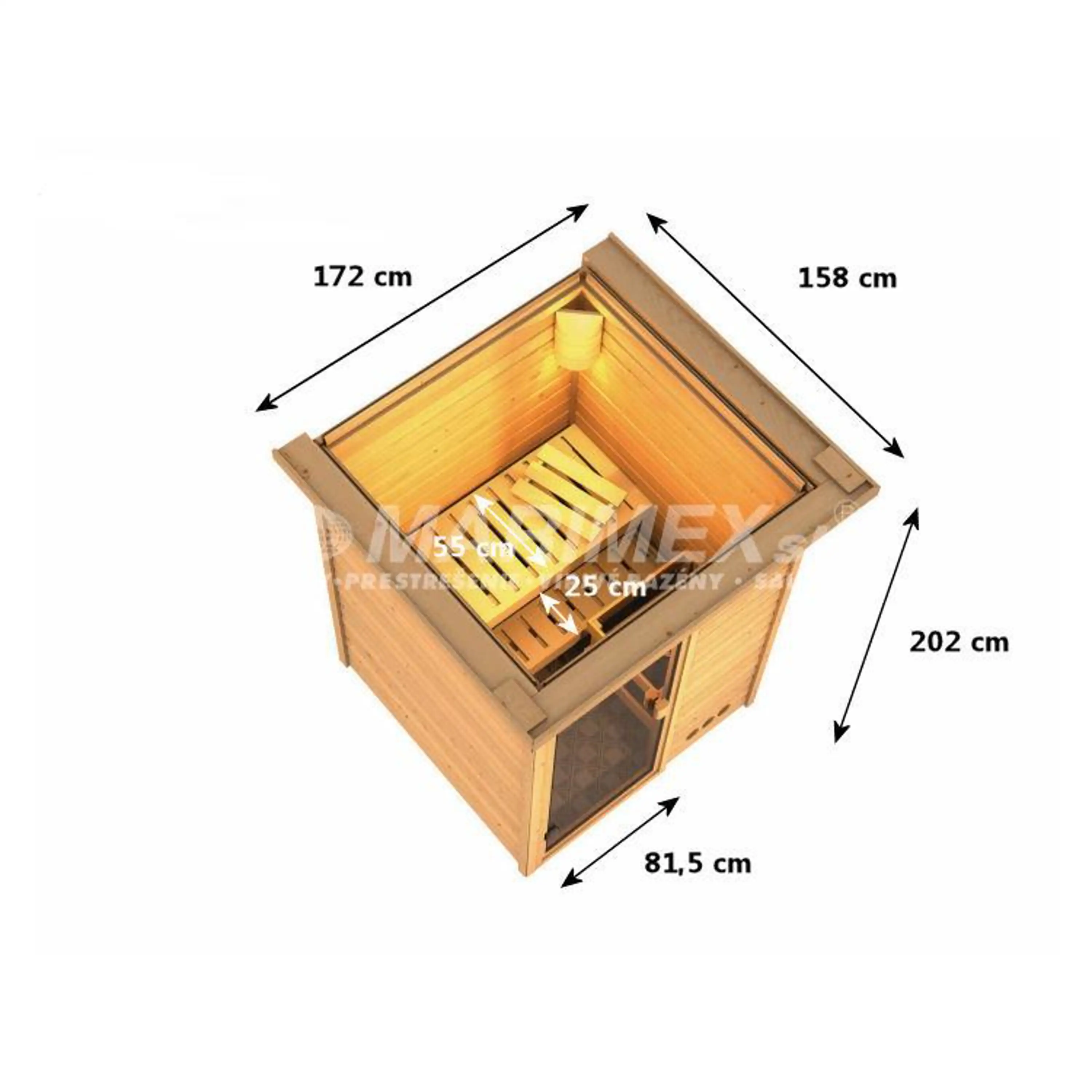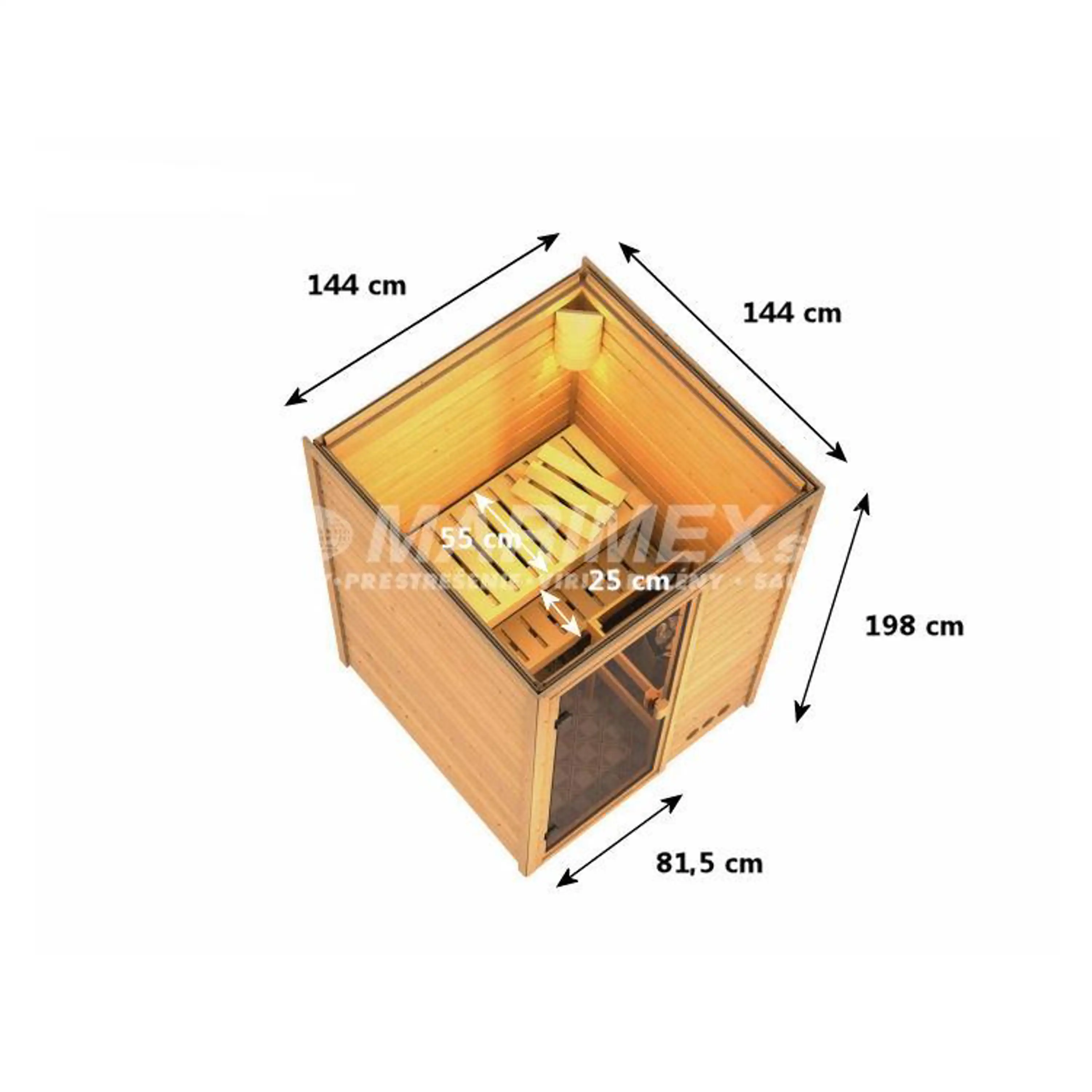 Fínska sauna od európskeho výrobcu Karibu. Nemecký výrobca zaručuje veľmi kvalitné materiály použité pri výrobe a dokonalé dielenské spracovanie. Sauna Svnja je pripravená k svojpomocnej montáži.Pôdorys sauny je štvorcový. Predný vstup. K fínskej saune je nutné zakúpiť saunovú piecku!