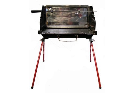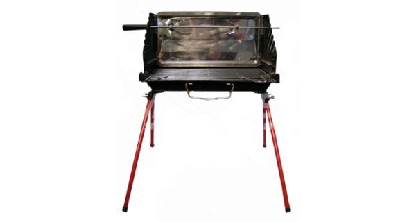 Liatinový oválny gril na drevené uhlie Hacienda s vertikálnou a horizontálnou polohou grilovania. Súčasťou dodávky je otočný ražeň. Rozmery roštu sú 55 x 28 cm a výška grilu je 88 cm.