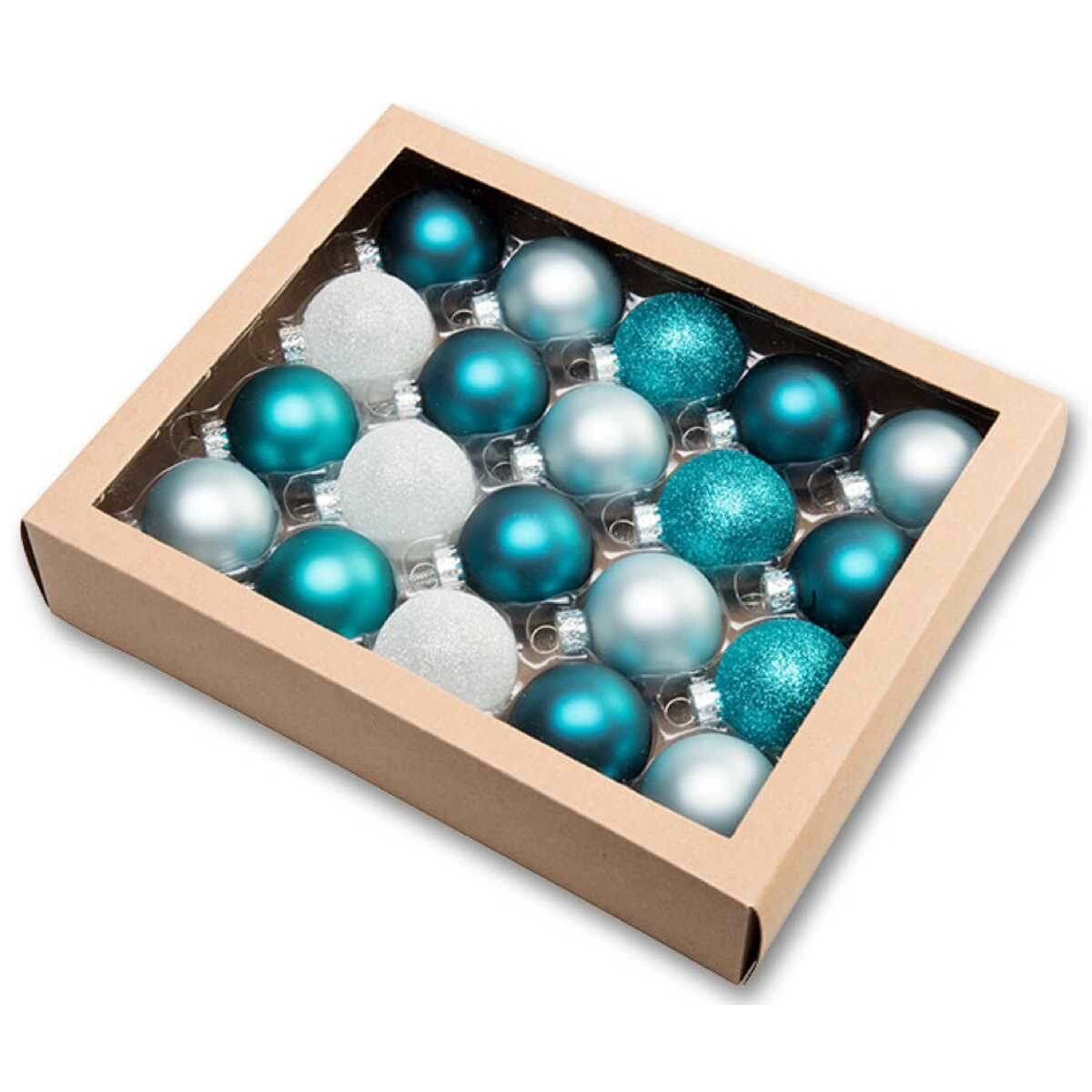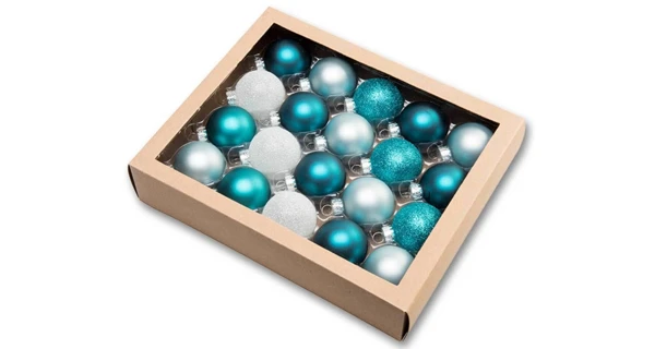 Ozdoby v balení sú v troch prevedeniach - matné, lesklé a posiate trblietakmi. Uchytenie na stromček je strieborné.