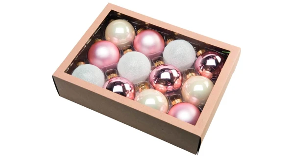 Set obsahuje zlatú, svetlo ružovú a bielu farbu a predstavuje tak zaujímavú kontrastnú kombináciu. Uchytenie na stromček je v zlatom prevedení.