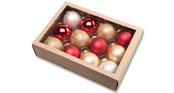Sklenený set obsahuje 12 kusov vianočných gulí v tradičnom farebnom prevedení.