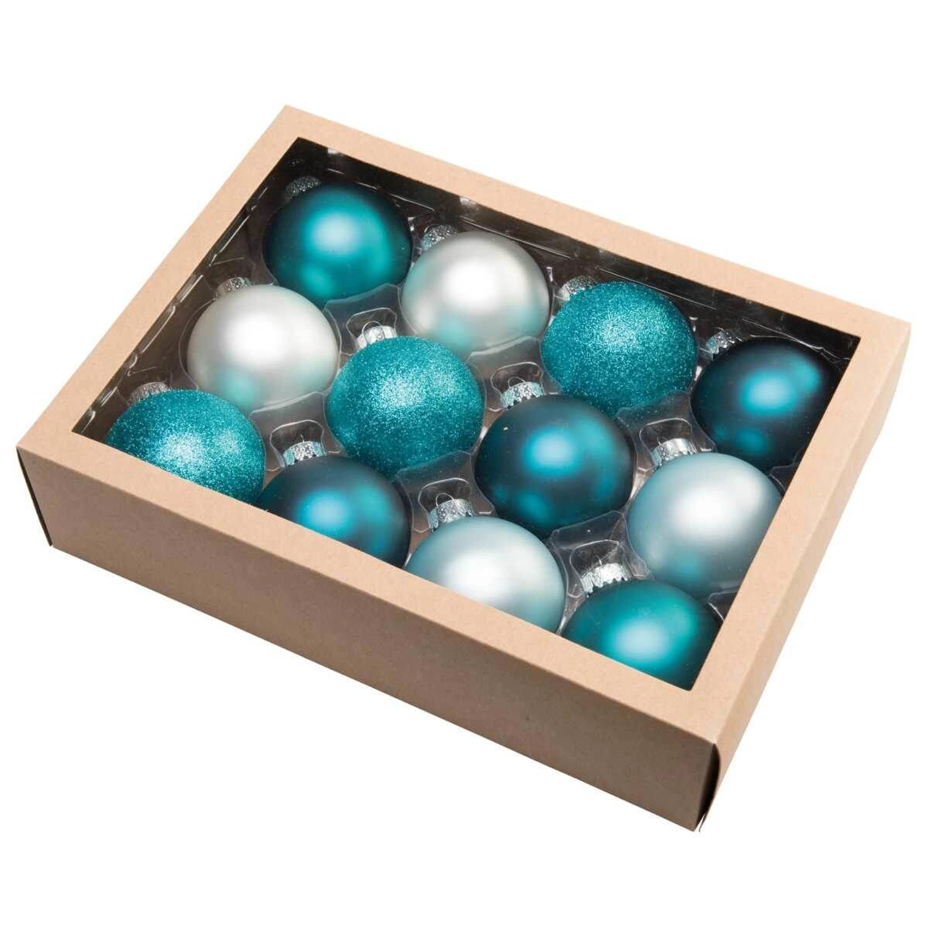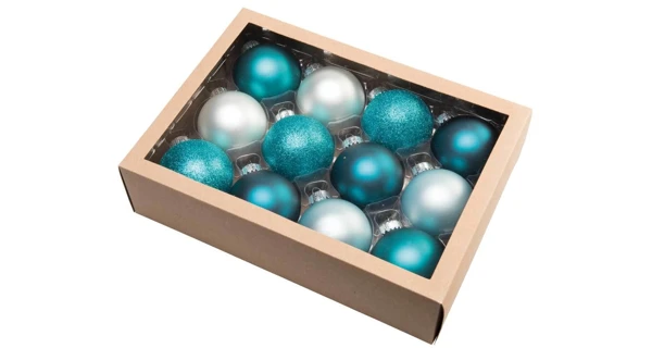 Sklenený set 12 kusov vianočných gulí v netradičnej modrej farbe.