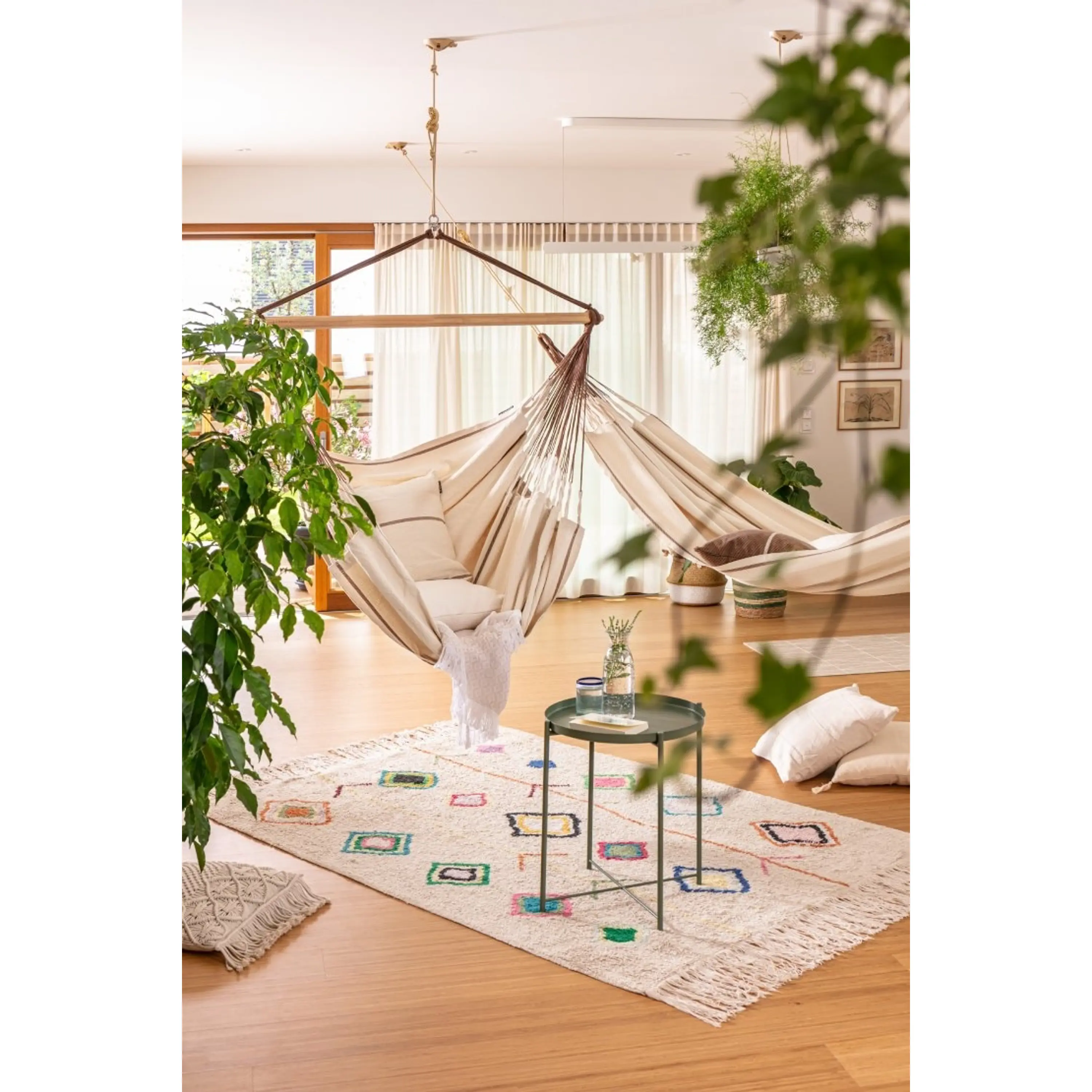 Jej veľkorysé rozmery, 210 cm na dĺžku, pozývajú k odpočinku v sede aj v ľahu a svojim pohodlím sa vyrovná hojdacím sieťam. Kvalitná látka je vďaka dlhým vláknam mimoriadne hebká a výnimočne trvanlivá. Zdvojené útky na jej okrajoch zabraňujú roztrhnutiu. Certifikácia GOTS zase zaručuje, že aj farbivá spĺňajú najprísnejšie environmentálne kritériá. Tiež rozperná tyč je vyrobená z kvalitného bambusového dreva pochádzajúceho z udržateľného lesného hospodárstva. Vďaka špeciálnej technológii spracovania má príjemne hladký povrch a taktiež jej odolnosť proti poveternostným vplyvom je mimoriadna.