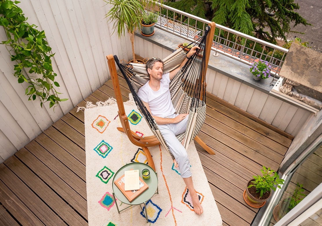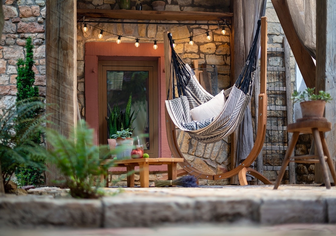 Úžasné kombo – závesná sedačka s dreveným stojanom – pre maximálnu relaxáciu na minimálnom priestore – vaša oáza kedykoľvek a kdekoľvek si budete priať.