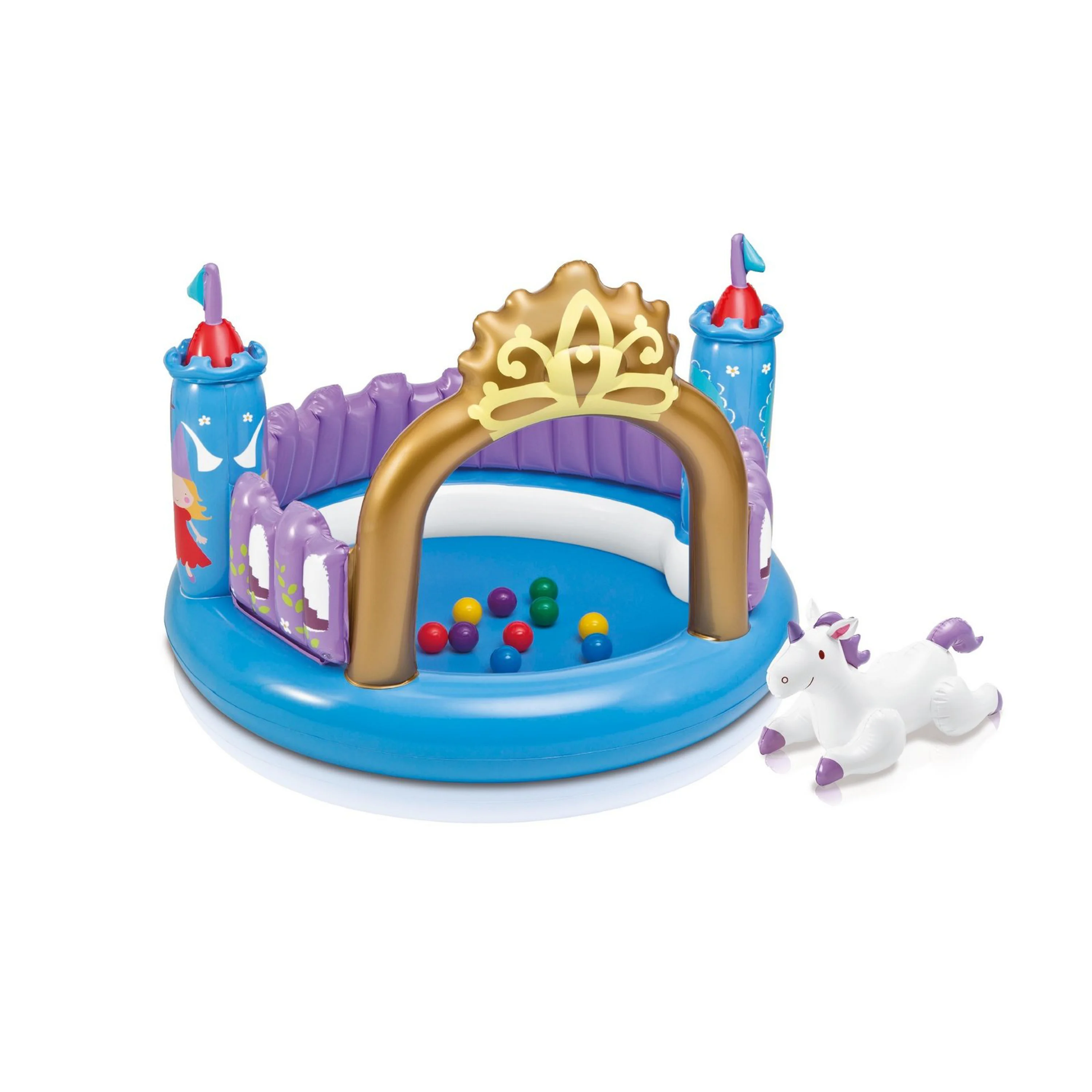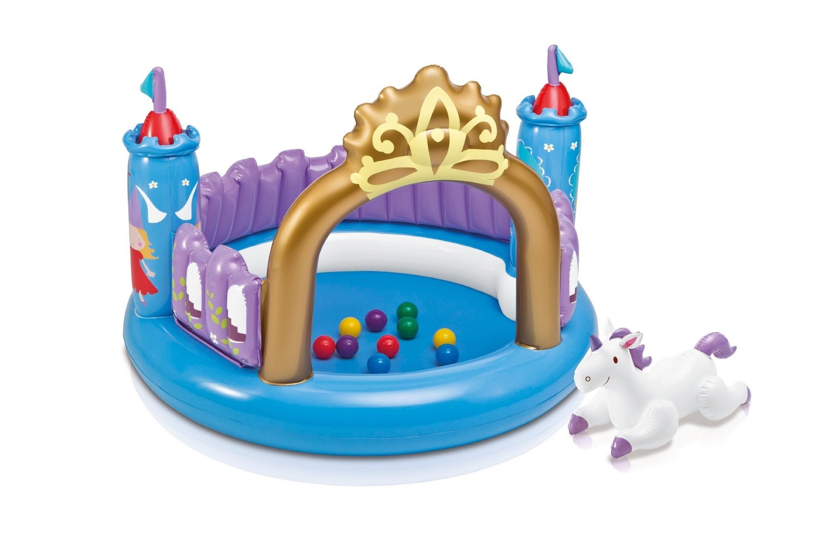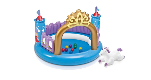 Kúzelný nafukovací hrad s plastovými loptičkami a jednorožcom zaujme každé dieťa.