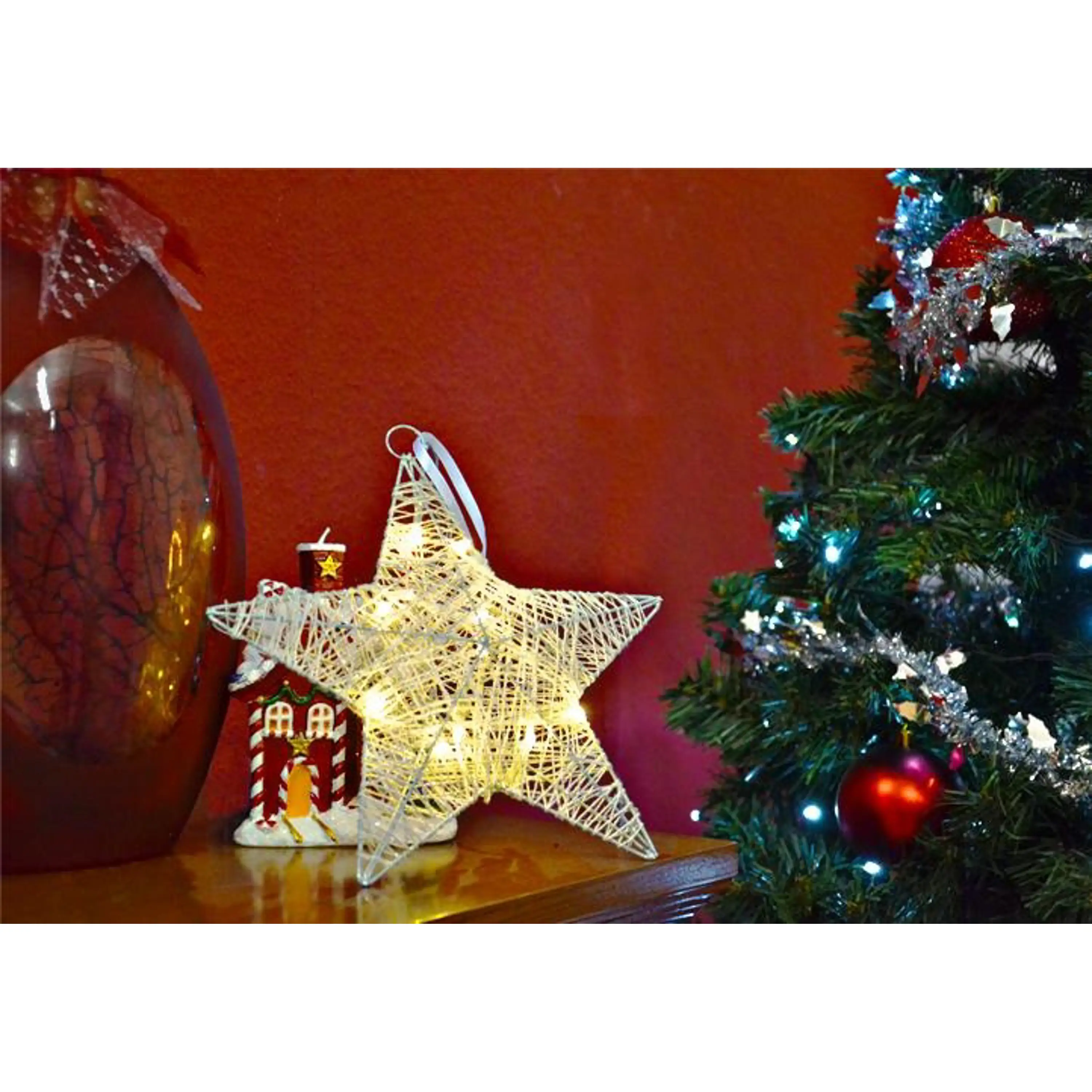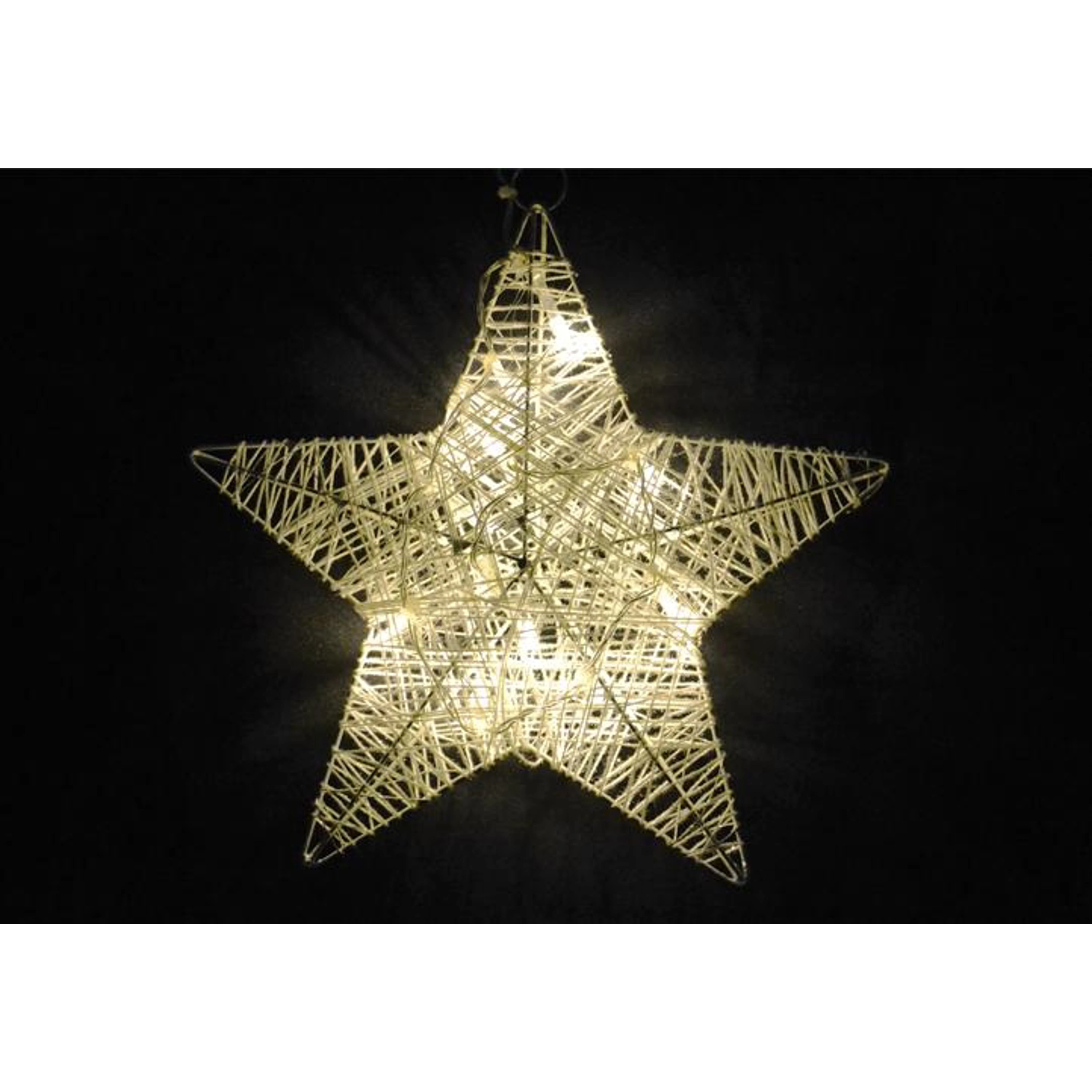 Vianočná hviezda bezpochyby patrí k vianočnej výzdobe a produkt, ktorý vám ponúkame, navyše oslňuje príjemným teplým bielym svetlom. Táto dekorácia ratanového vzhľadu je jemne ozdobená trblietkami, ktoré takisto pritiahnu pozornosť. Hviezda je vybavená malým očkom na zavesenie a praktickým spínačom, napájená je prostredníctvom batérií (pozor, batérie nie sú súčasťou balenia).