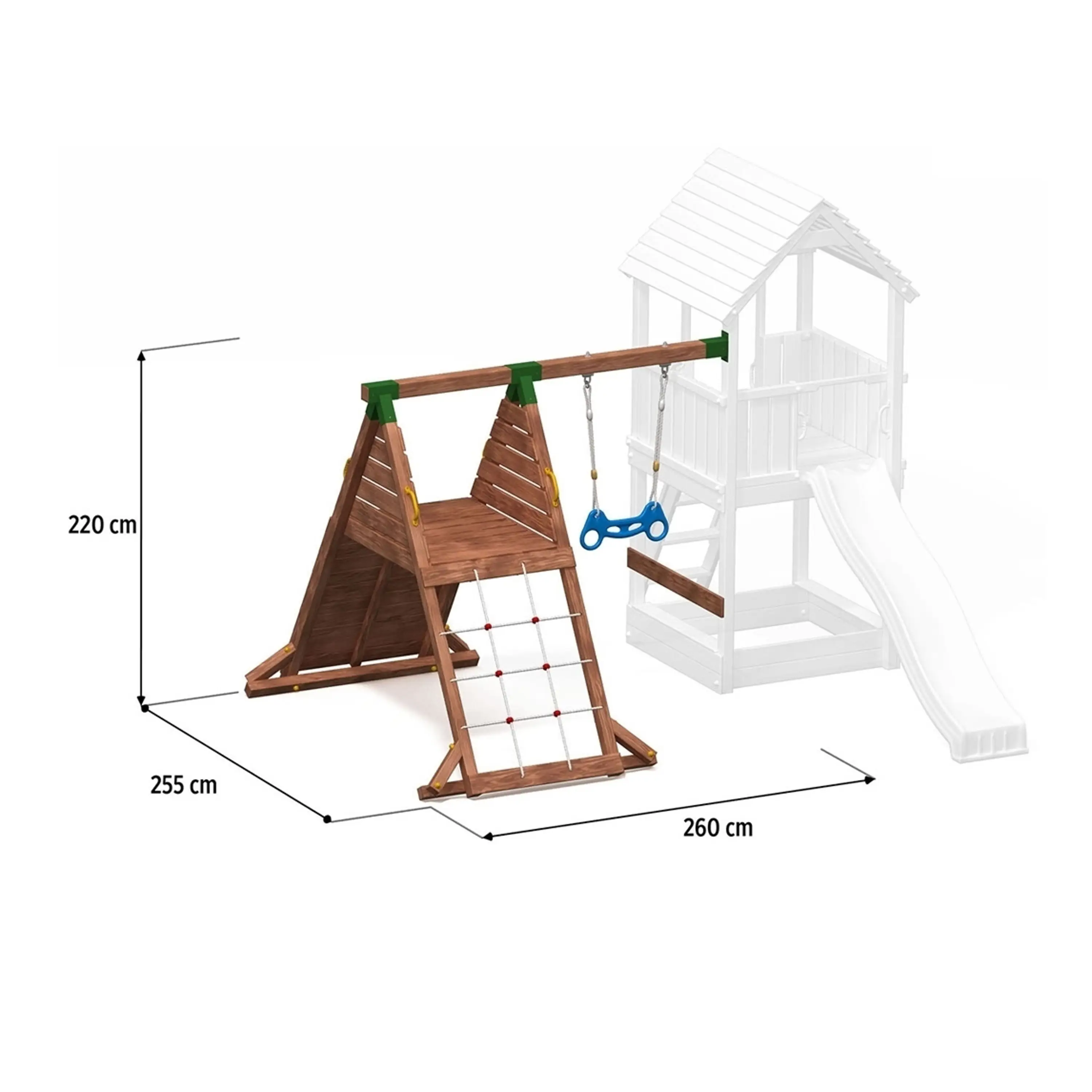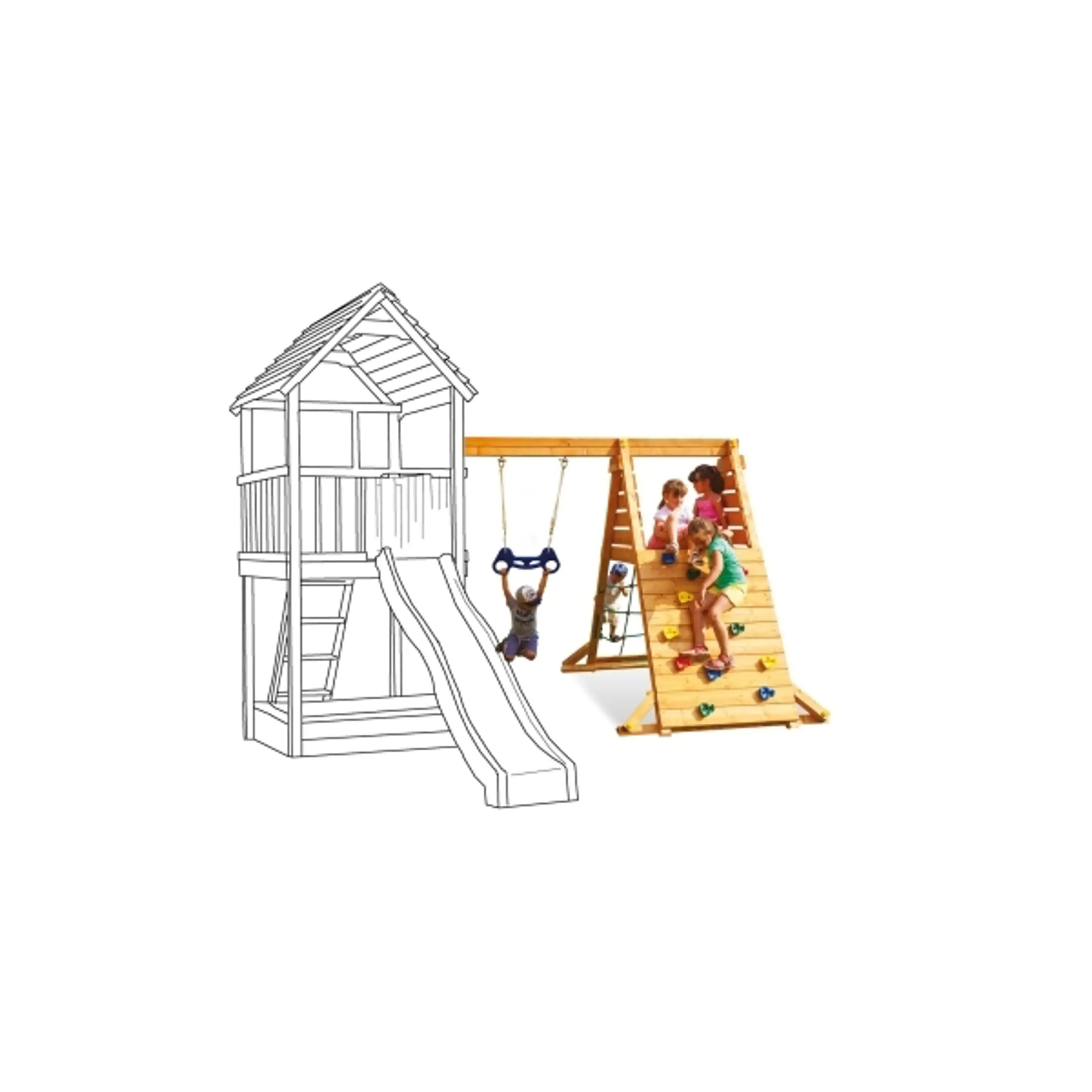 Prídavný modul pridáva k detským ihriskám MARIMEX viac zábavy a hier pre vaše deti. Zábavu si užijú najmä pri hojdaní na trapézovej hrazde, kde sa budú hojdať ako Tarzani. Lanová pavúčia sieť a lezecká stena budú pre deti tiež veľkou výzvou na zlepšenie ich lezeckých zručností. Detské ihrisko spĺňa bezpečnostné normy EN 71 Bezpečnosti hračiek. Použitý drevený materiál je ošetrený tak, aby sa znížilo riziko poranenia detí, a je tiež impregnovaný pre dlhú životnosť a vysokú odolnosť celého ihriska. Hmotnosť 1 dieťaťa sa počíta do maximálnej hmotnosti 50 kg.