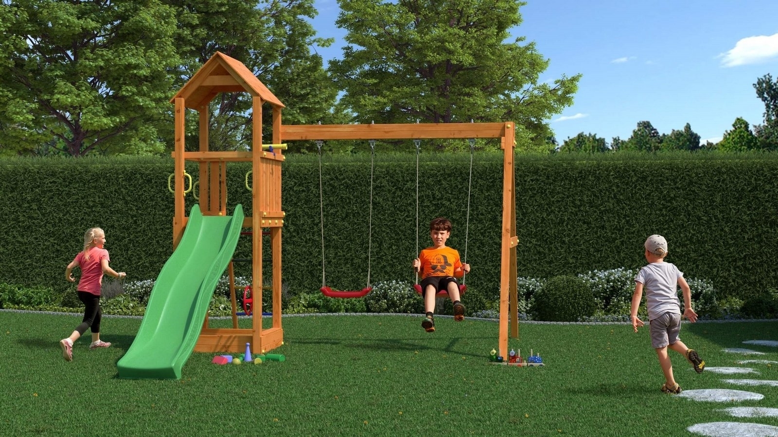 Kvalitné materiályVšetky komponenty sú vyrobené z robustného plastu, odolného kovu a borovicového dreva, ktoré je povrchovo ošetrené proti nepriaznivým vplyvom počasia. |