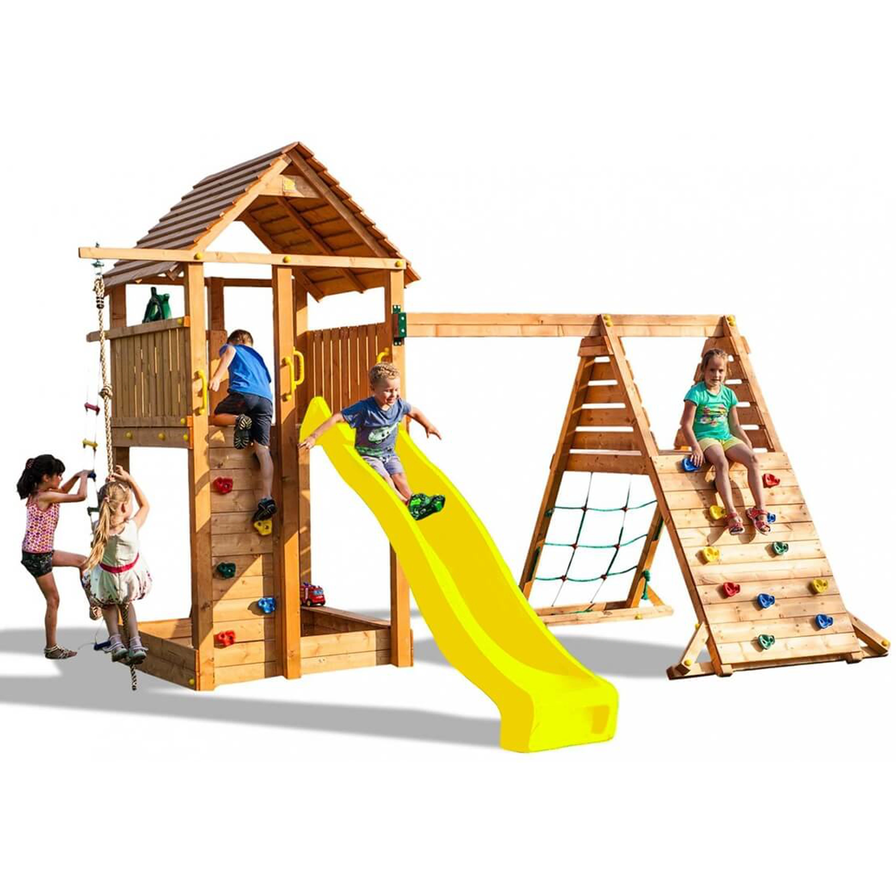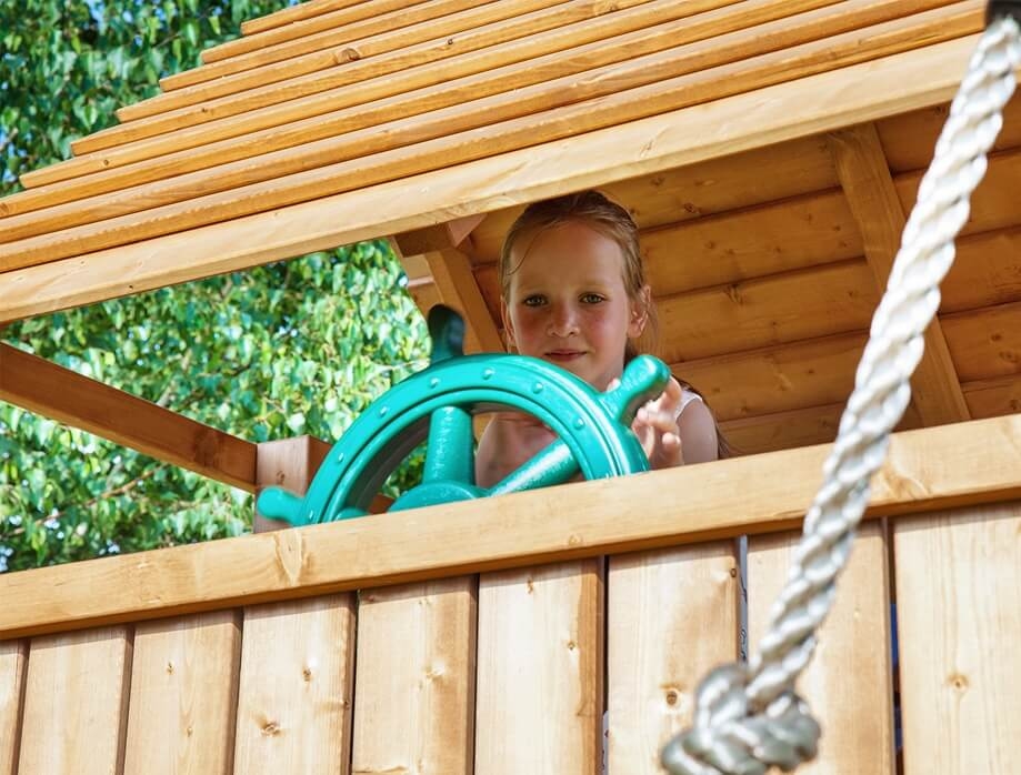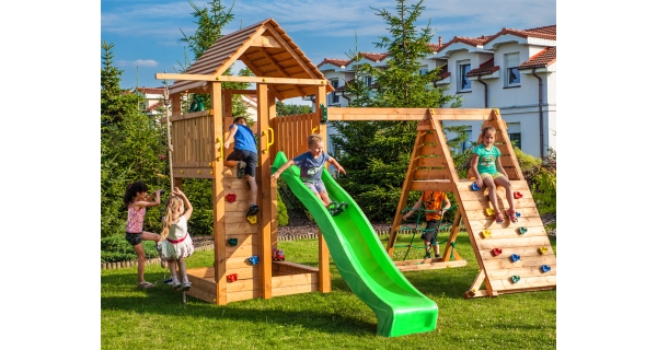 S detským ihriskom Marimex Play 004 si vaše deti užijú veľa zábavy a rozvinú svoju motoriku. Detské ihrisko pozostáva z veže a 3 metre dlhej šmykľavky. Deti môžu vyliezť na vežu po schodoch so zábradlím alebo vyliezť na lezeckú stenu ako horolezci. Deti sa môžu zabaviť aj šplhaním po lane alebo lezením po lanových rebríkoch, ktoré sú pripevnené k veži. Na veži je veľa miesta na hranie a pirátske kormidlo na zábavu. Deti sú na veži chránené zábradlím a pred slnkom a dažďom ich chráni drevená strecha. Pre bezpečnosť vašich detí sú na šmykľavke, lezeckej stene a rebríku zábradlia, ktorých sa môžu držať pri vstupe a výstupe z veže. Pod vežou sa nachádza priestor s dvoma sedadlami, ktorý možno využiť ako pieskovisko. Detské ihrisko je pripevnené k zemi pomocou kotiev, aby sa zabránilo prevráteniu a pádu veže. Detské ihrisko MARIMEX PLAY 04 spĺňa normy EN 71 pre bezpečnosť hračiek. Drevený materiál použitý na detskom ihrisku je ošetrený tak, aby sa znížilo riziko poranenia detí. Je tiež impregnovaný pre dlhú životnosť a vysokú odolnosť celého ihriska. Hmotnosť 1 dieťaťa sa počíta do maximálnej hmotnosti 50 kg. Túto súpravu možno ľahko rozšíriť pomocou dostupných modulov a príslušenstva.