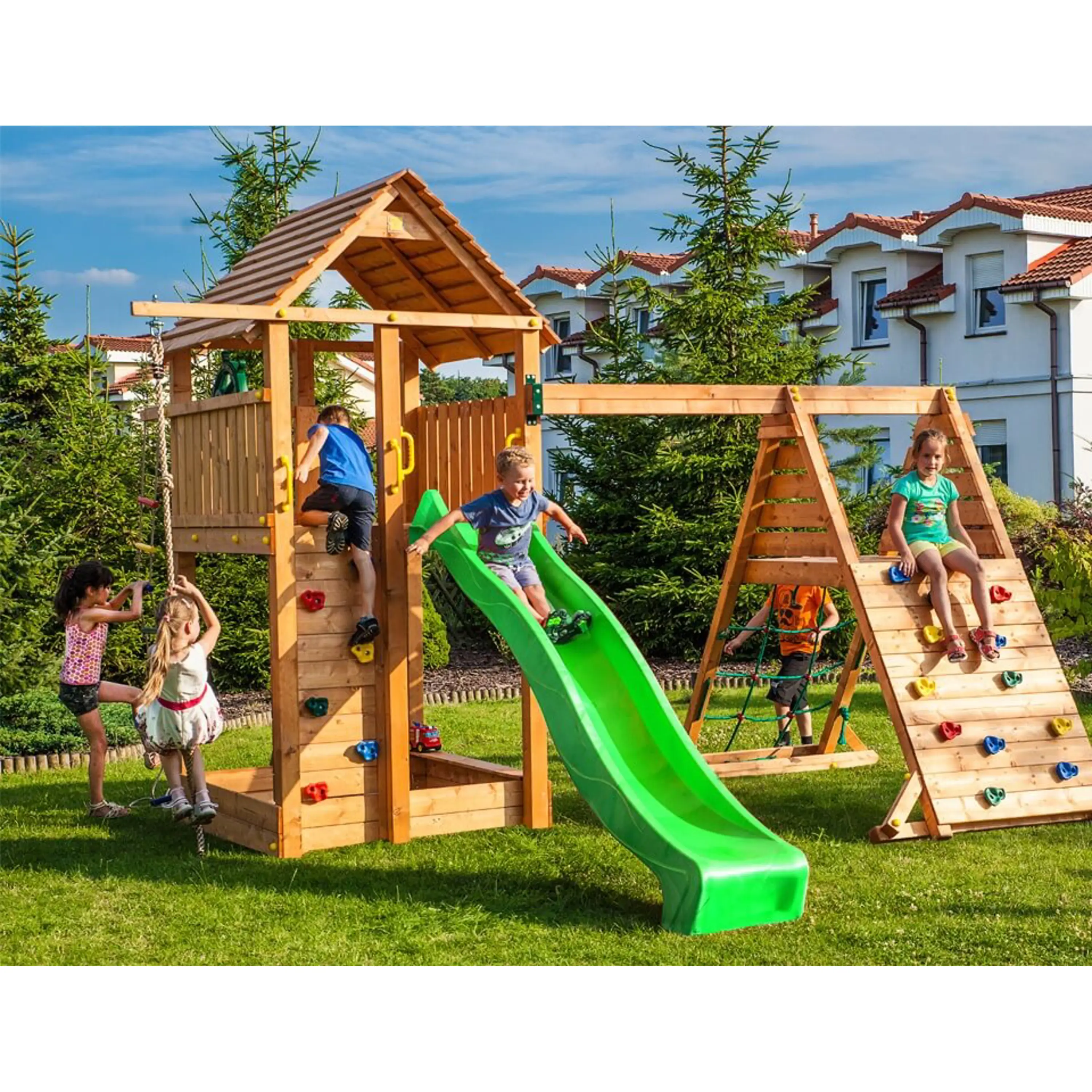 Zábava pre všetkýchDetské ihriská pozostávajú z rôznych prvkov v podobe domčekov, veží, šmýkačiek, hojdačiek, rebríkov, lezeckých stien, lán a hrazd. Jednoducho vyberte vhodnú zostavu pre vek vášho dieťaťa. |