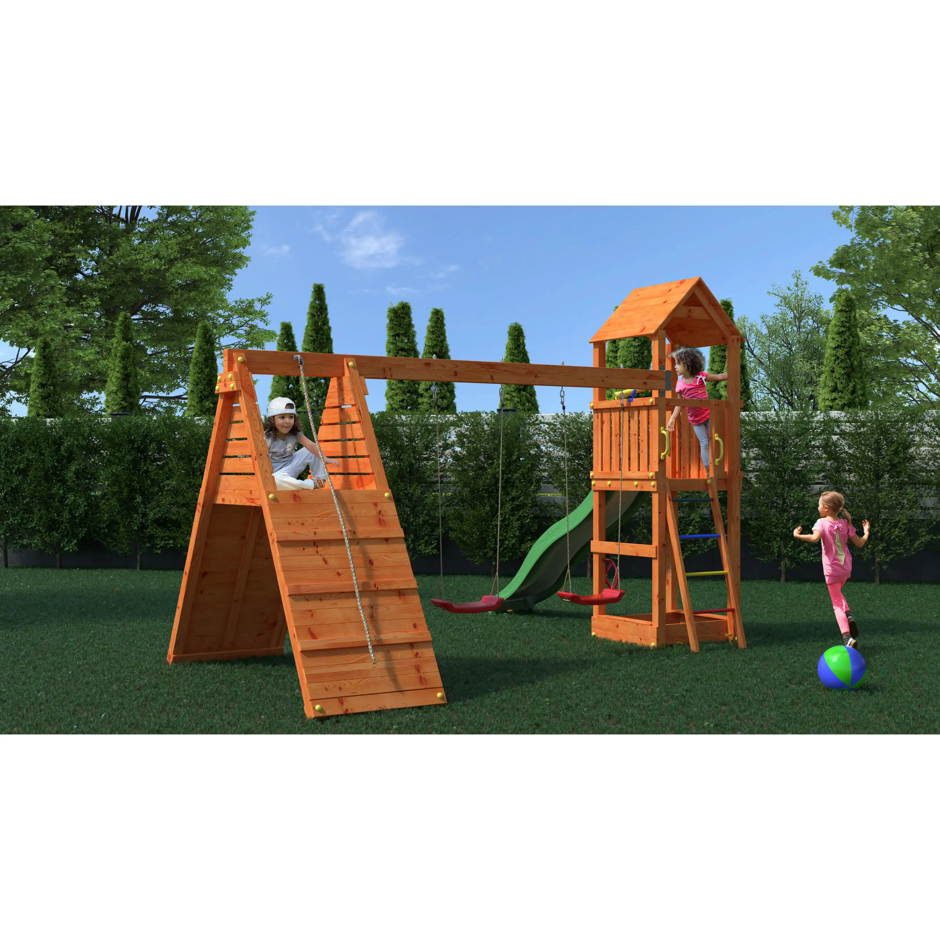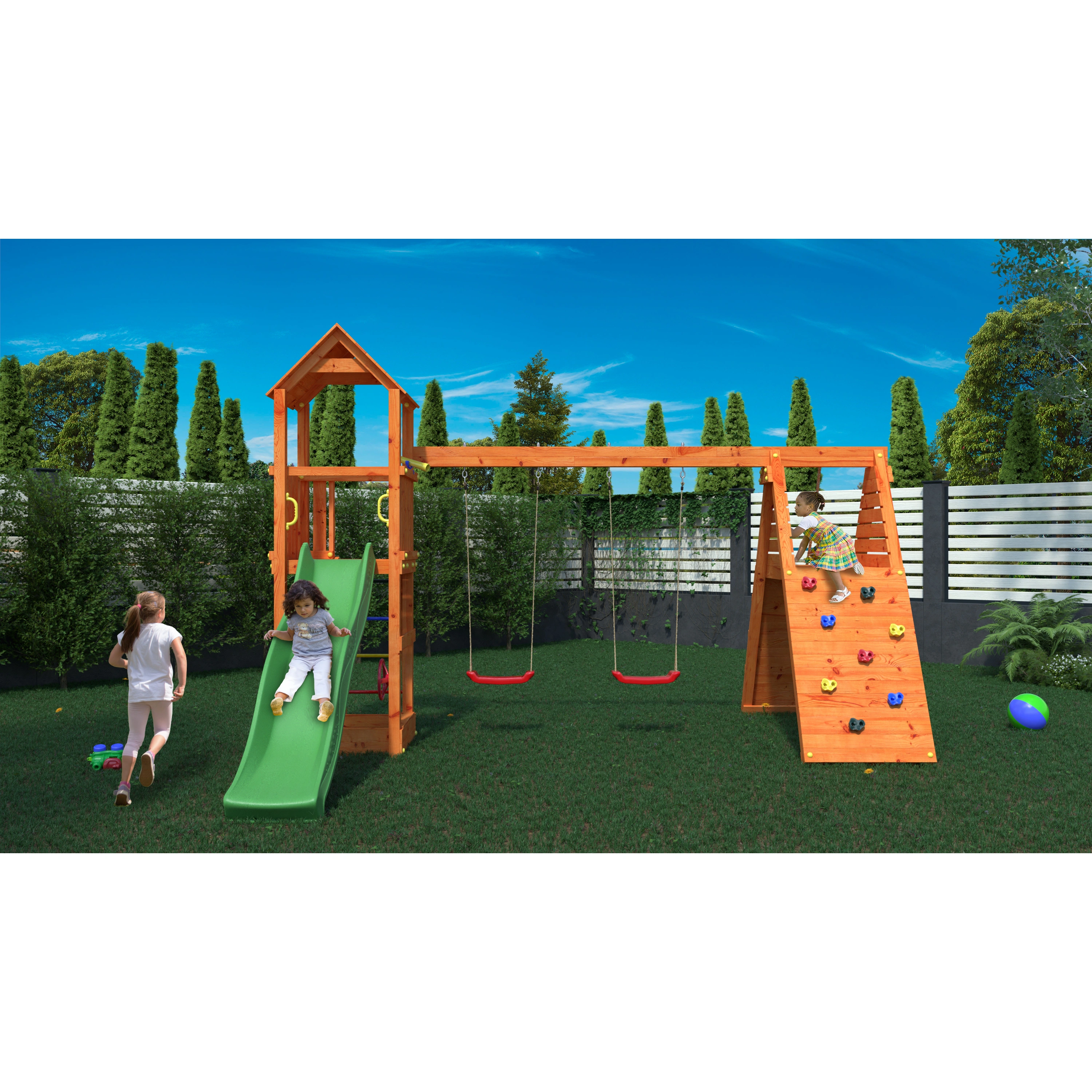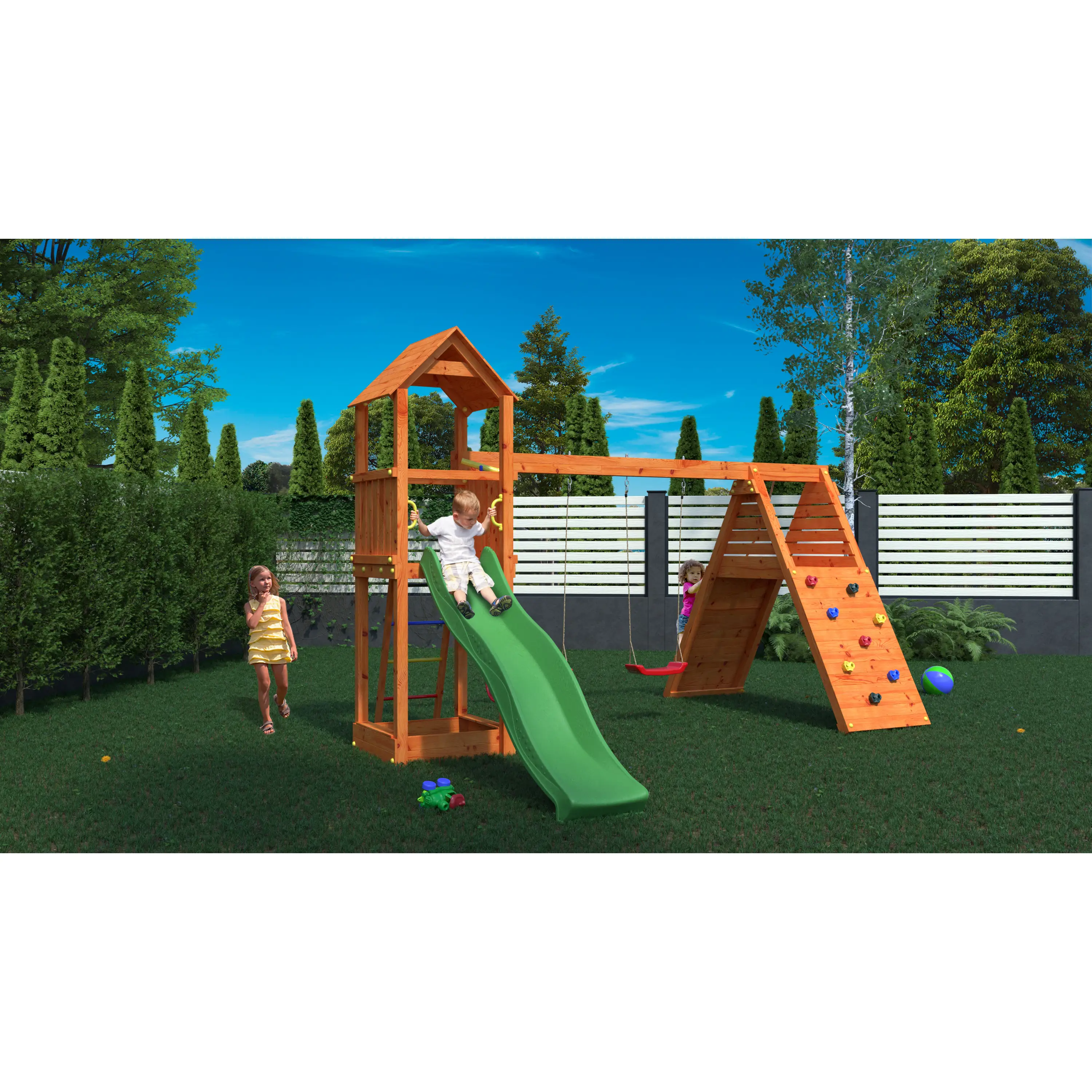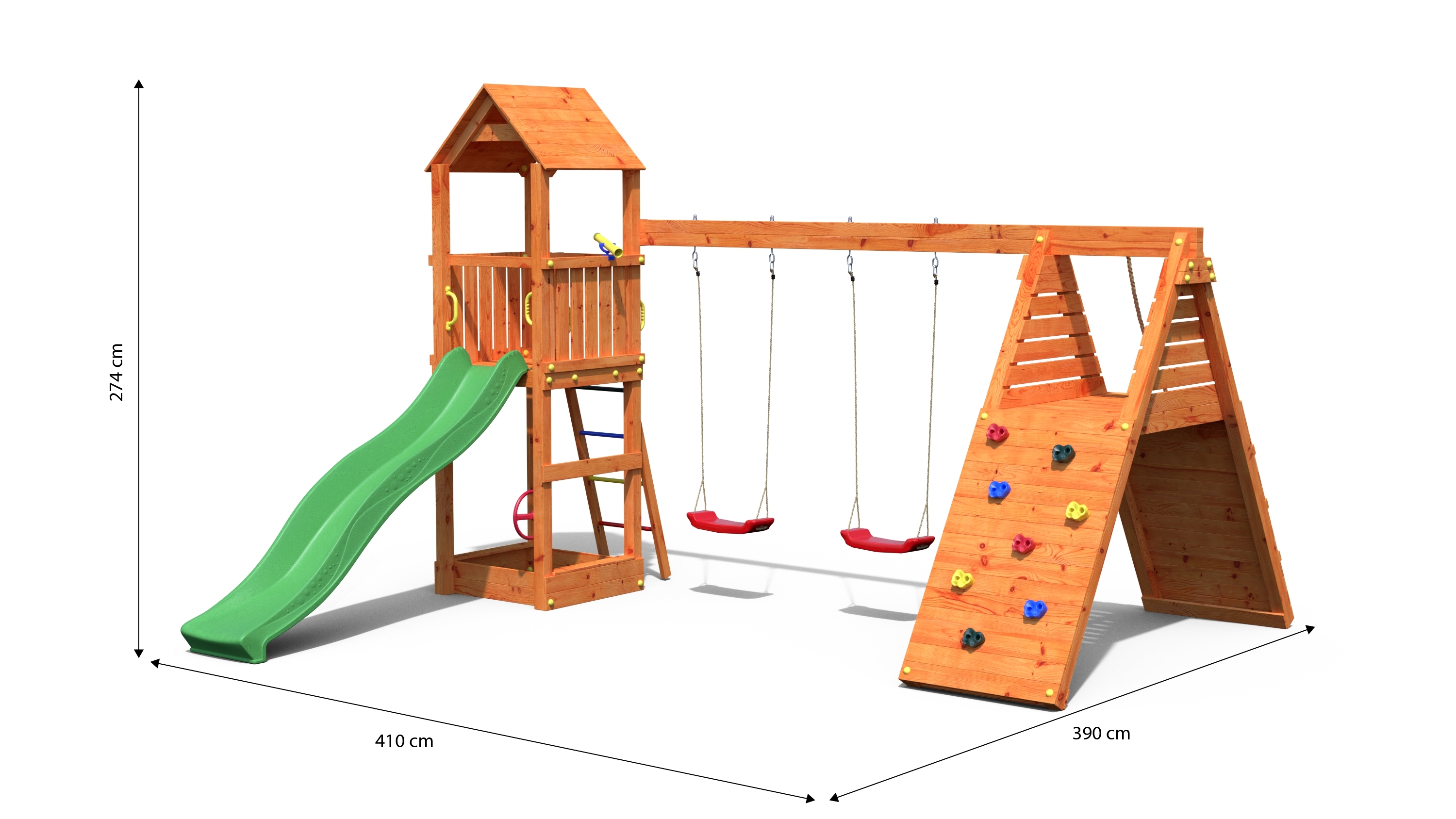 Kvalitné materiályVšetky komponenty sú vyrobené z robustného plastu, odolného kovu a borovicového dreva, ktoré je povrchovo ošetrené proti nepriaznivým vplyvom počasia. |