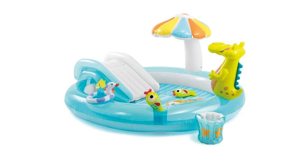 - Príslušenstvo obsahuje: slnečník v tvare hríbu, šmykľavku, striekacieho krokodíla s pripojením k záhradnej hadici, 2 ryby, 1 kačičku, 1 košík na ryby, opravnú sadu a vypúšťací ventil