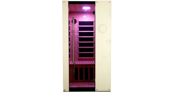 priestrannejšom byte. Sklenené dvere umožňujú pohodlný výhľad do okolia sauny. Súčasťou výbavy je ionizátor a rádio/mp3 prehrávač.