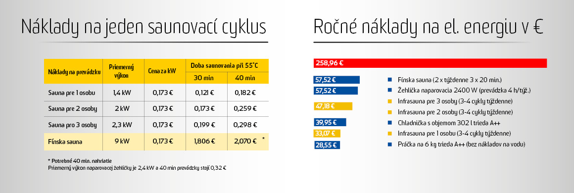 Prevádzka infrasáun je v porovnaní s klasickými saunami výrazne úspornejšia. Hlavným dôvodom je nižšia prevádzková teplota. Infračervené žiarenie preniká hlboko do tkaniva, preto nie je potrebné saunovací procedúru opakovať v niekoľkých cykloch za sebou, ako tomu je u fínskej sane.