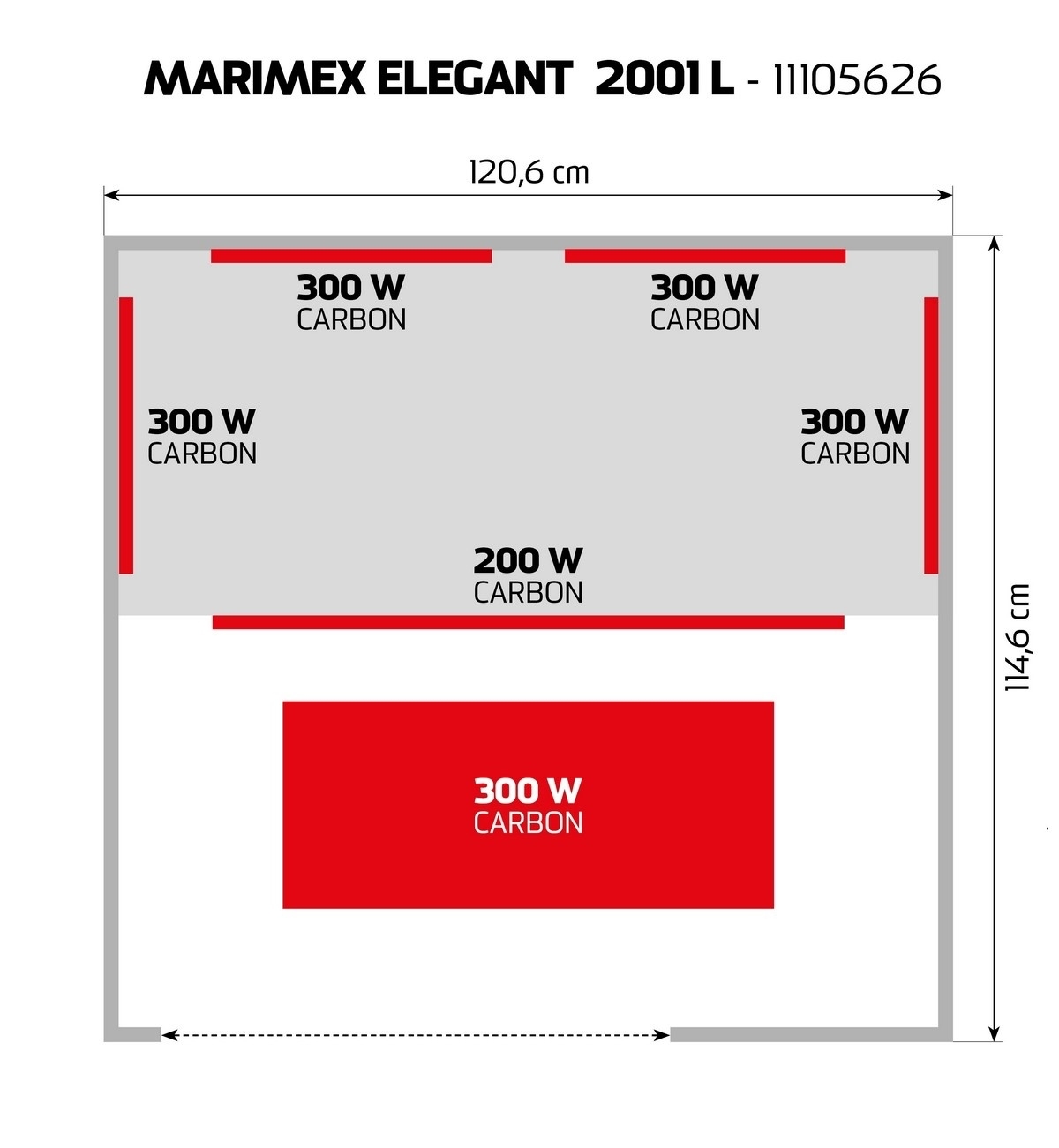 Infrasauna Marimex ELEGANT 2001 L sa vďaka svojmu dizajnu hodí do každého interiéru. Pri výrobe bolo použité kvalitné drevo kanadskej borovice hemlock. Infrasauna Marimex ELEGANT 2001 L umožňuje vychutnať čaro saunovania spoločne dvom osobám. Kompaktné rozmery dovoľujú infrasaunu umiestniť v rodinnom dome i priestornejším byte. Sklenené dvere umožňujú pohodlný výhľad po okolí sauny. Nad vstupnými dverami je