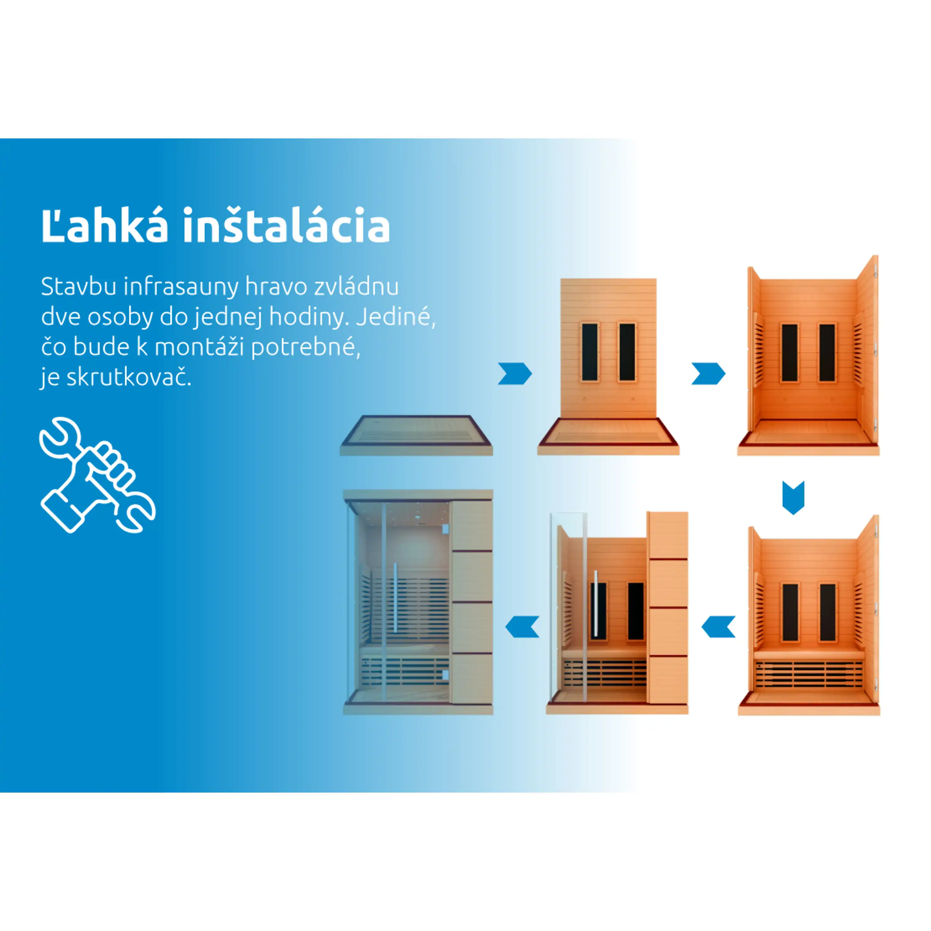 Jednoduchá inštaláciaStavbu infrasauny zvládnu dvaja ľudia v priebehu jednej hodiny. Na montáž budete potrebovať iba skrutkovač. |