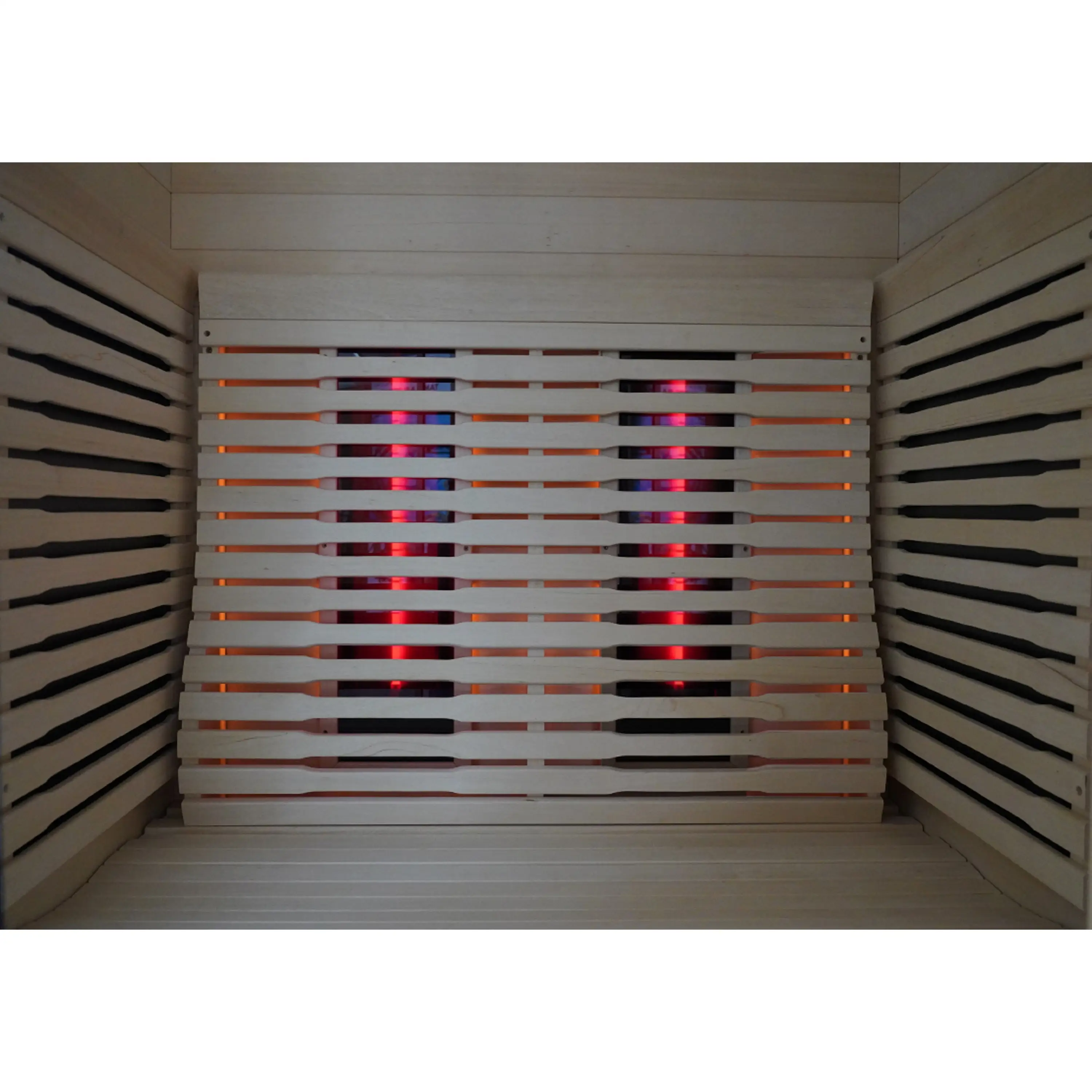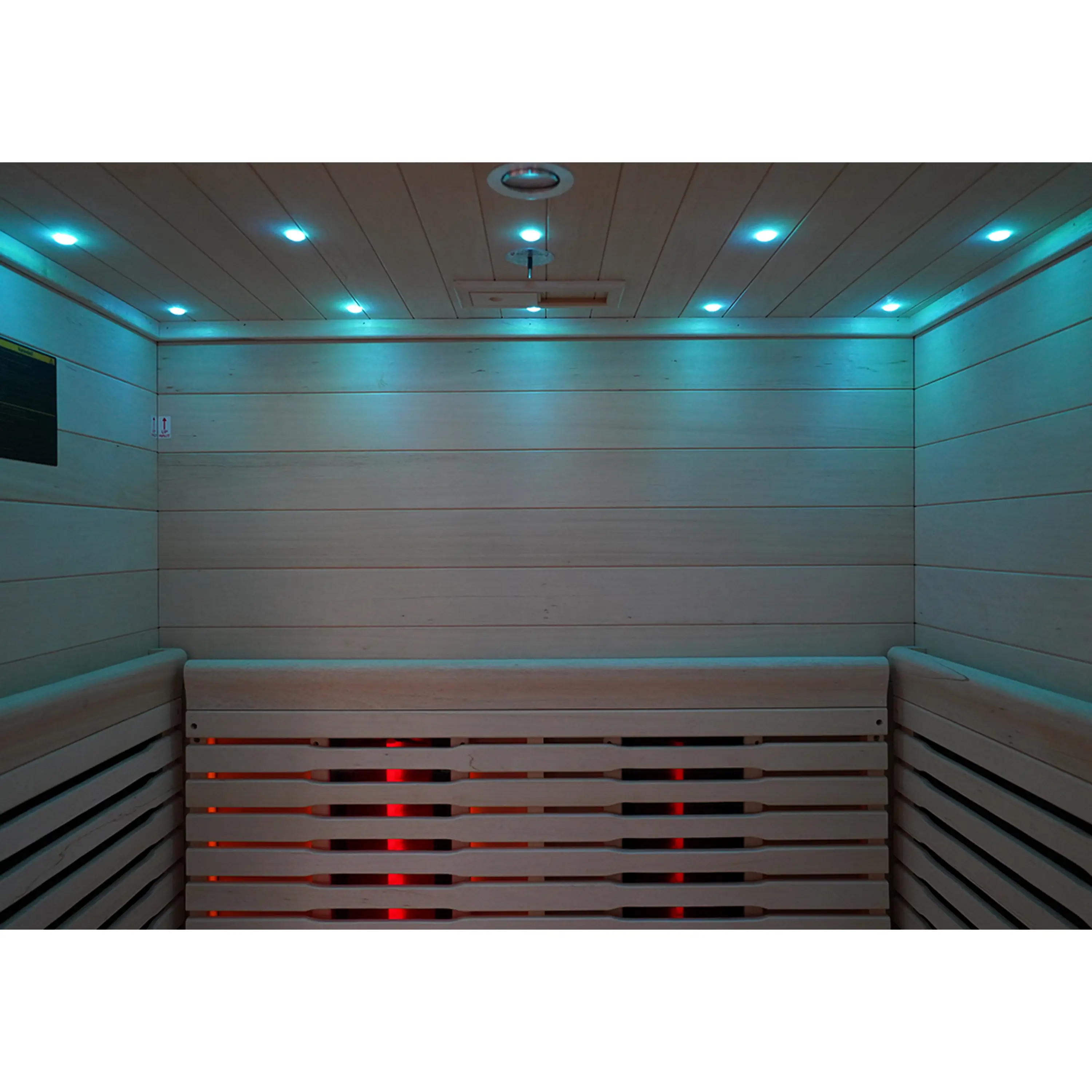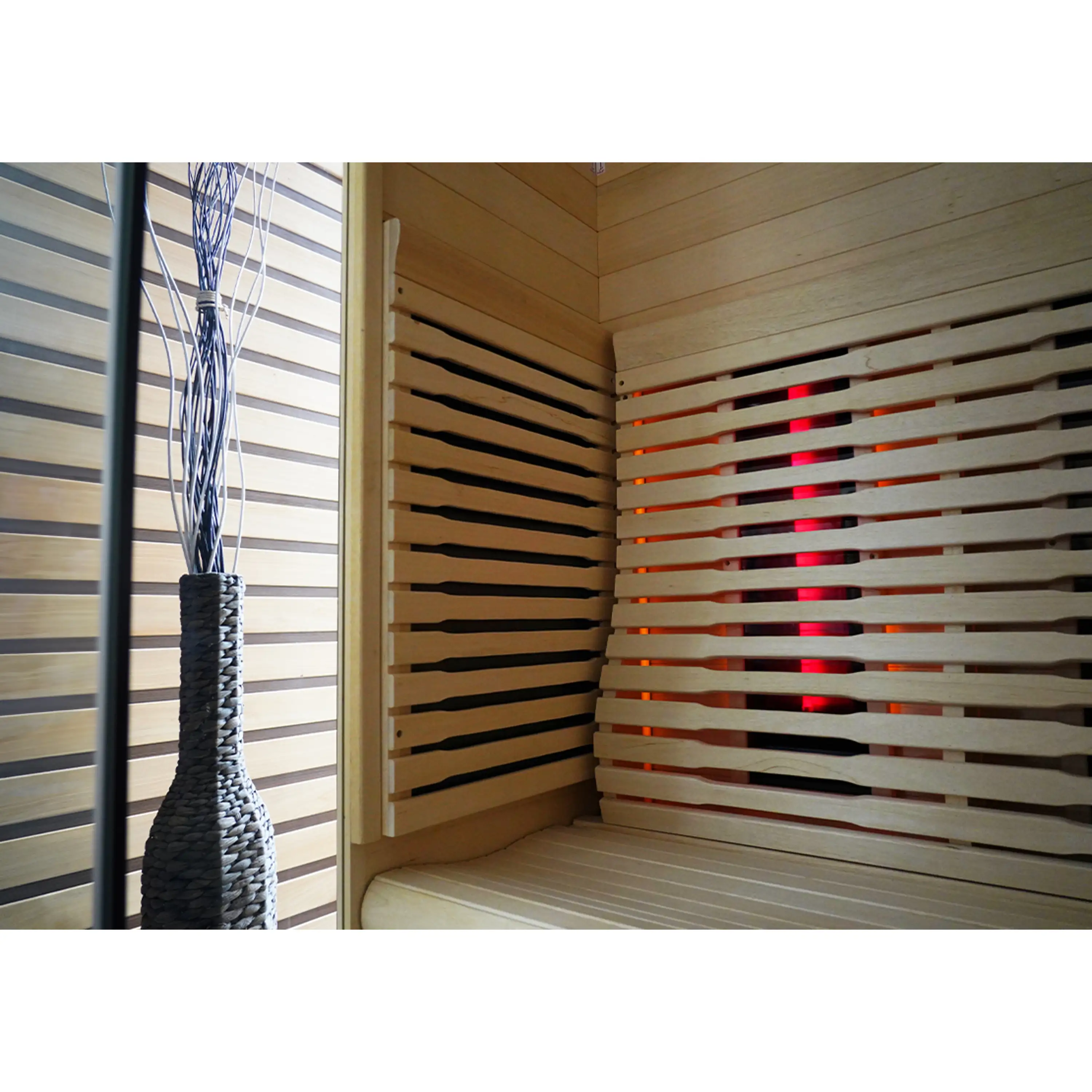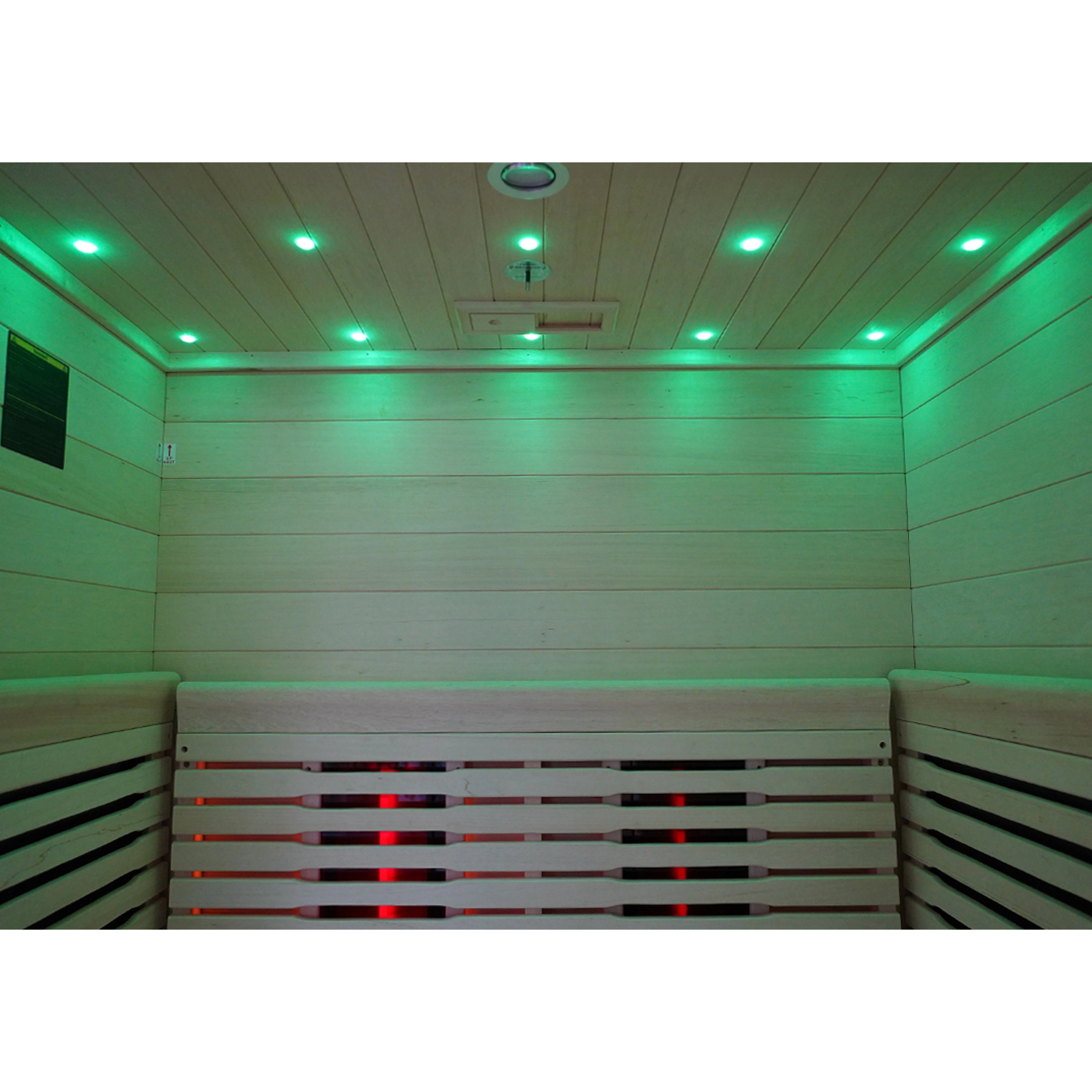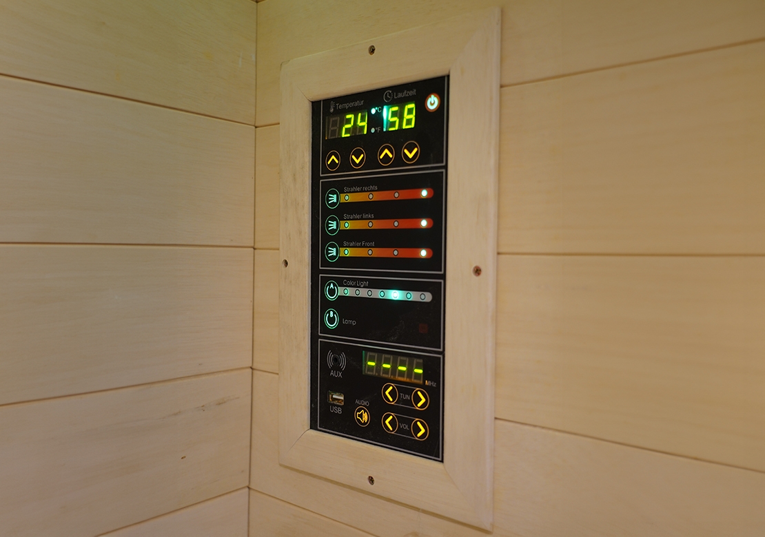 Kombinácia karbónových a redlight žiaričov v stenách, lavici a podlahe zabezpečuje rovnomerné rozloženie infračervených lúčov a takmer okamžité zahriatie na požadovanú teplotu. Nastavenia sa dajú jednoducho ovládať na paneli umiestnenom vo vnútri infrasauny. Infrasauna je vybavená funkciou LED harmónie, ktorá zabezpečuje ešte silnejší pôžitok z relaxácie prostredníctvom svetelnej terapie - tzv. farebnej terapie. Atmosféru umocňuje aj možnosť zapnúť si rádio s prehrávačom mp3. Súčasťou infrasauny je aj snímač teploty a strešné vetranie.