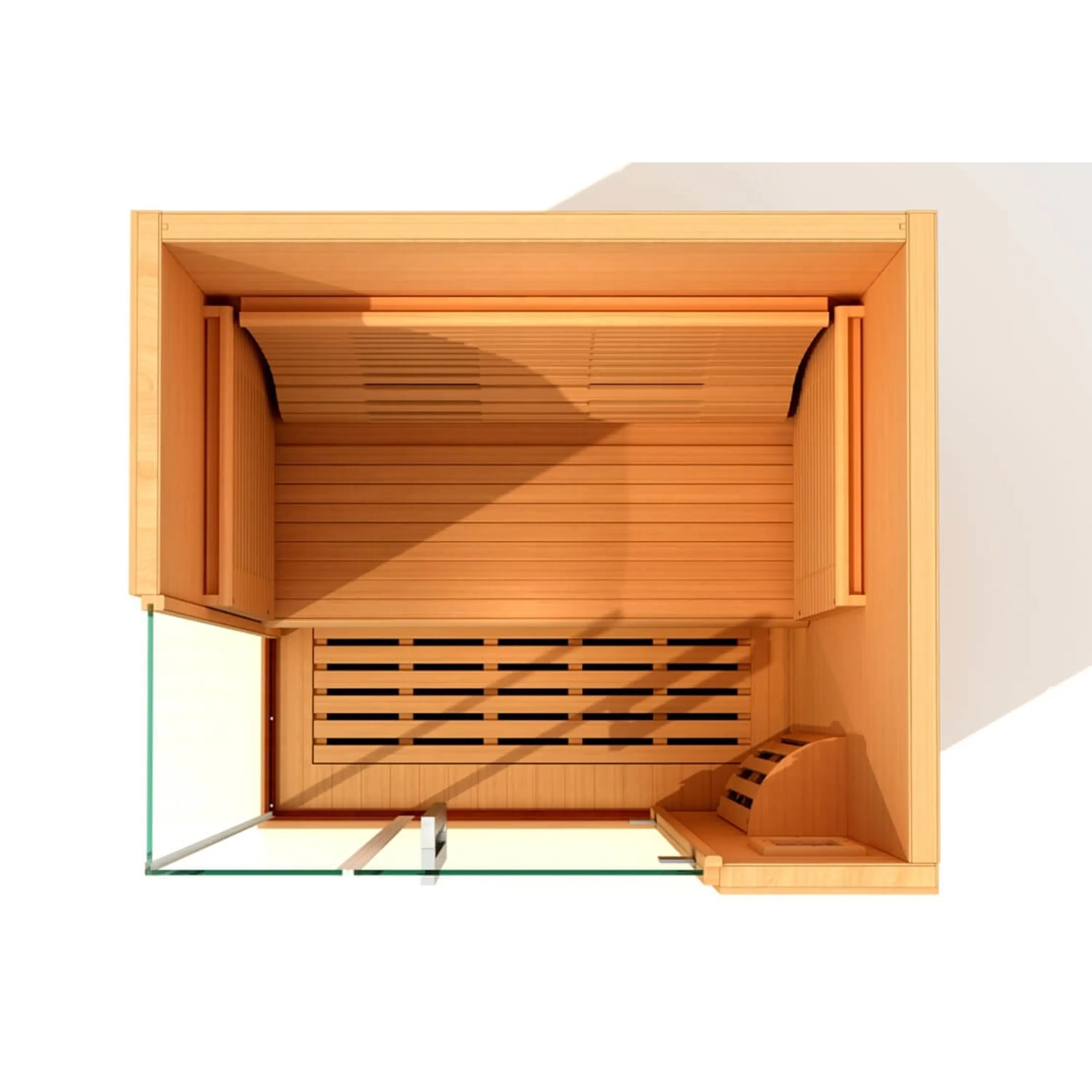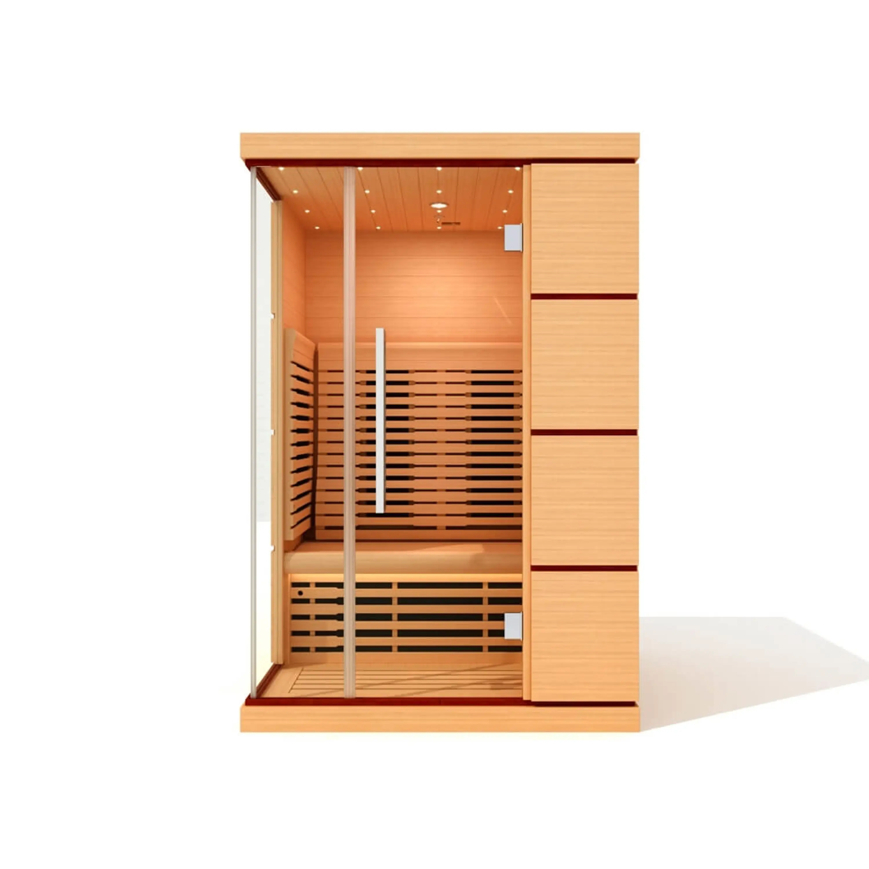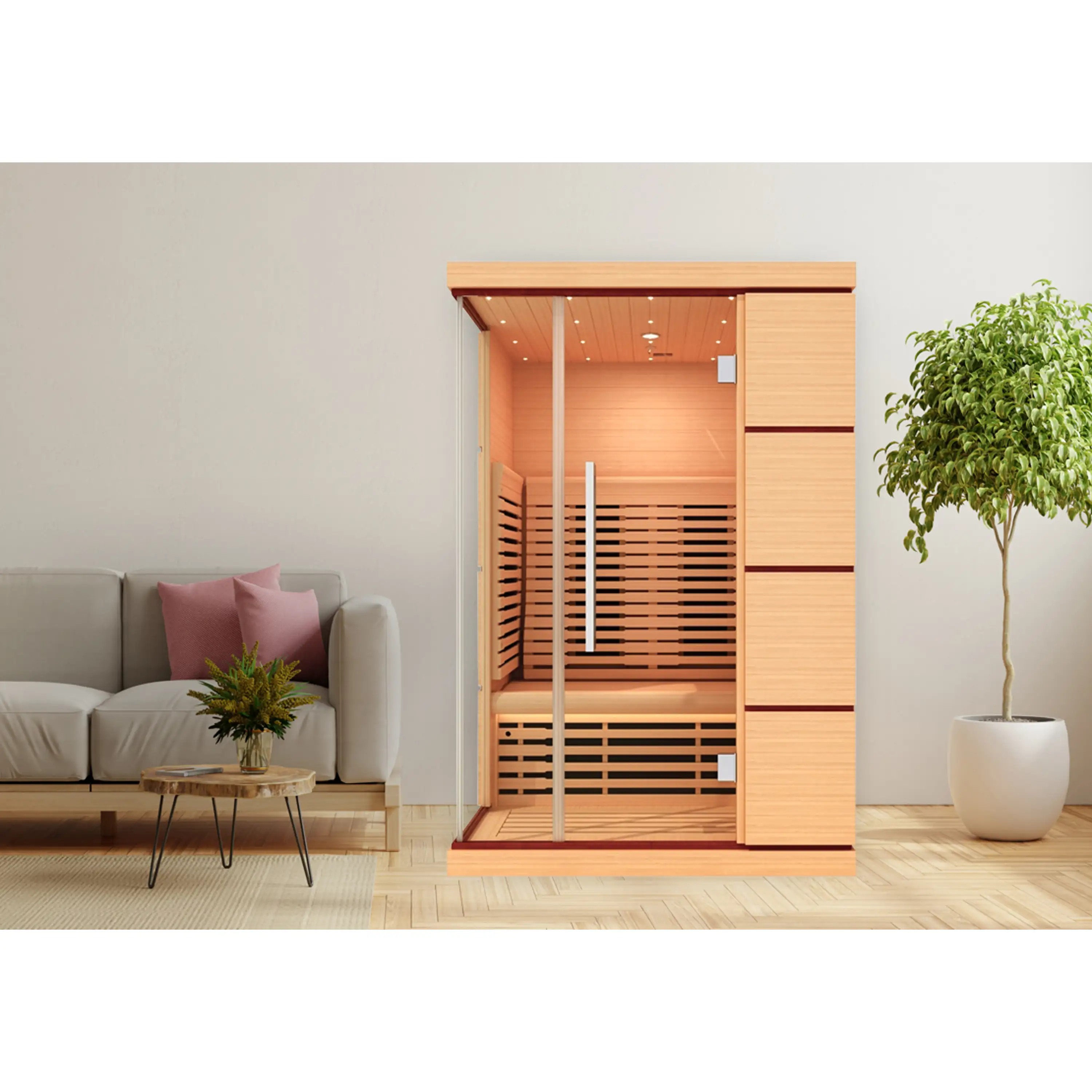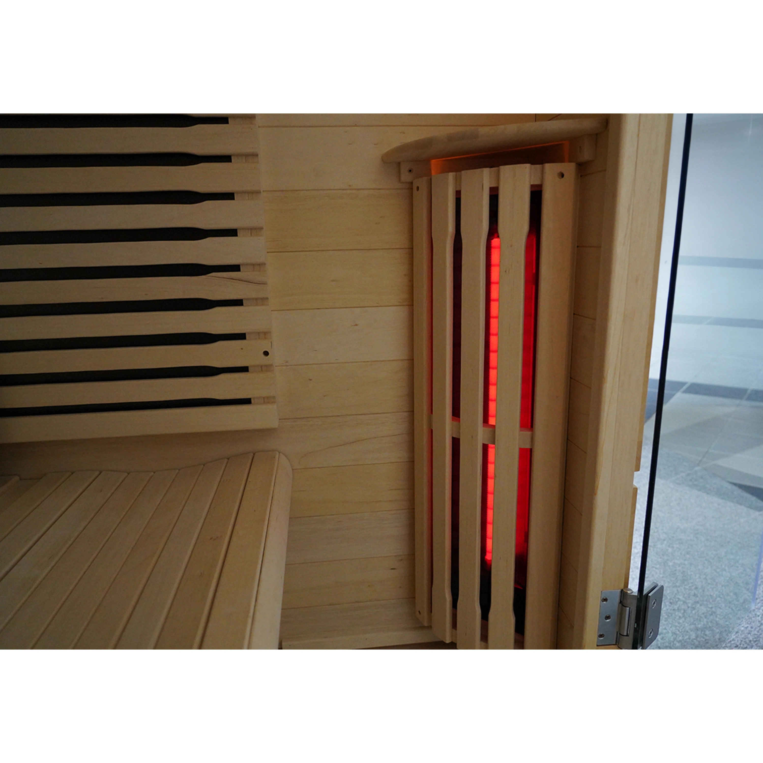Kombinácia karbónových a redlight žiaričov v stenách, lavici a podlahe zabezpečuje rovnomerné rozloženie infračervených lúčov a takmer okamžité zahriatie na požadovanú teplotu. Nastavenia sa dajú jednoducho ovládať na paneli umiestnenom vo vnútri infrasauny. Infrasauna je vybavená funkciou LED harmónie, ktorá zabezpečuje ešte silnejší pôžitok z relaxácie prostredníctvom svetelnej terapie - tzv. farebnej terapie. Atmosféru umocňuje aj možnosť zapnúť si rádio s prehrávačom mp3. Súčasťou infrasauny je aj snímač teploty a strešné vetranie.