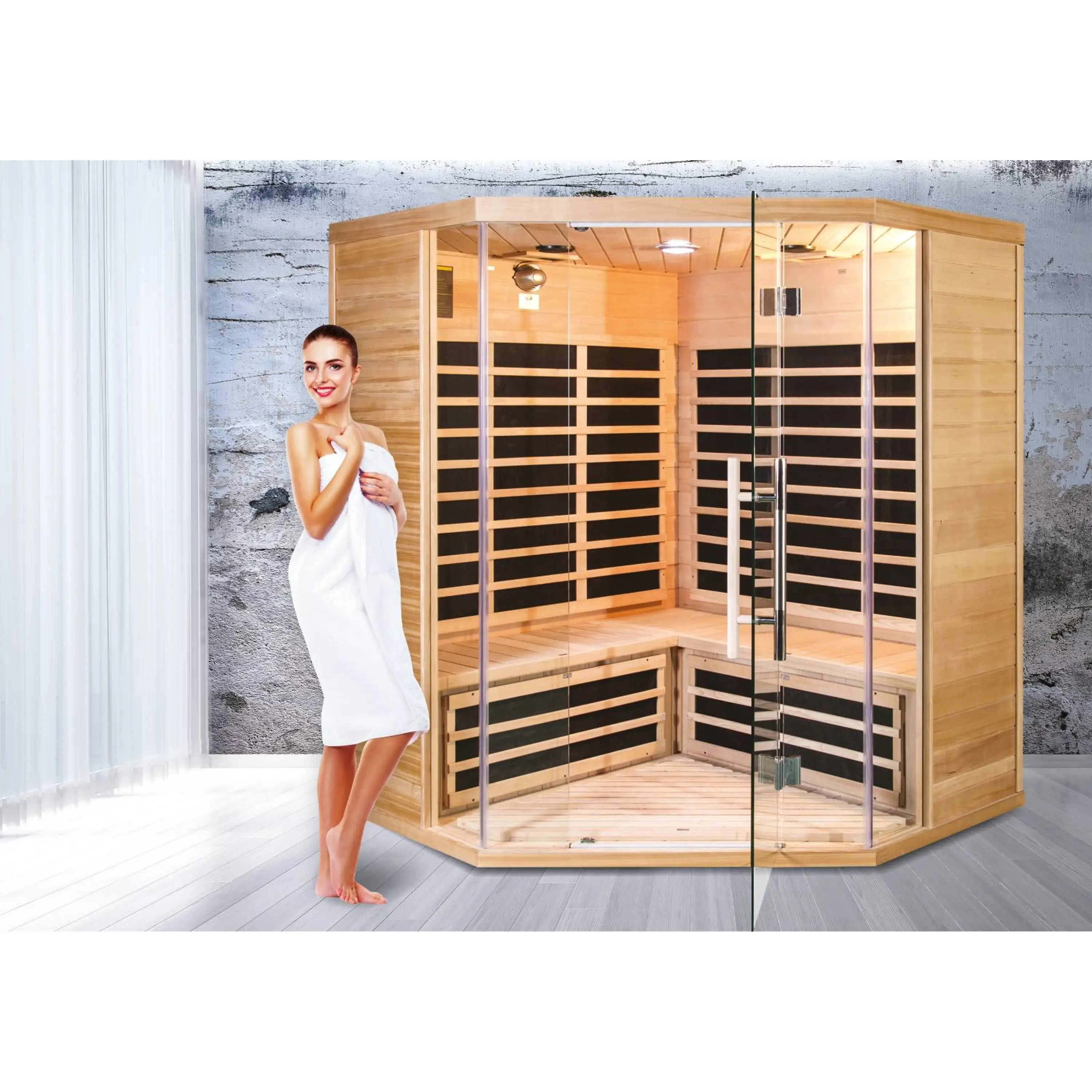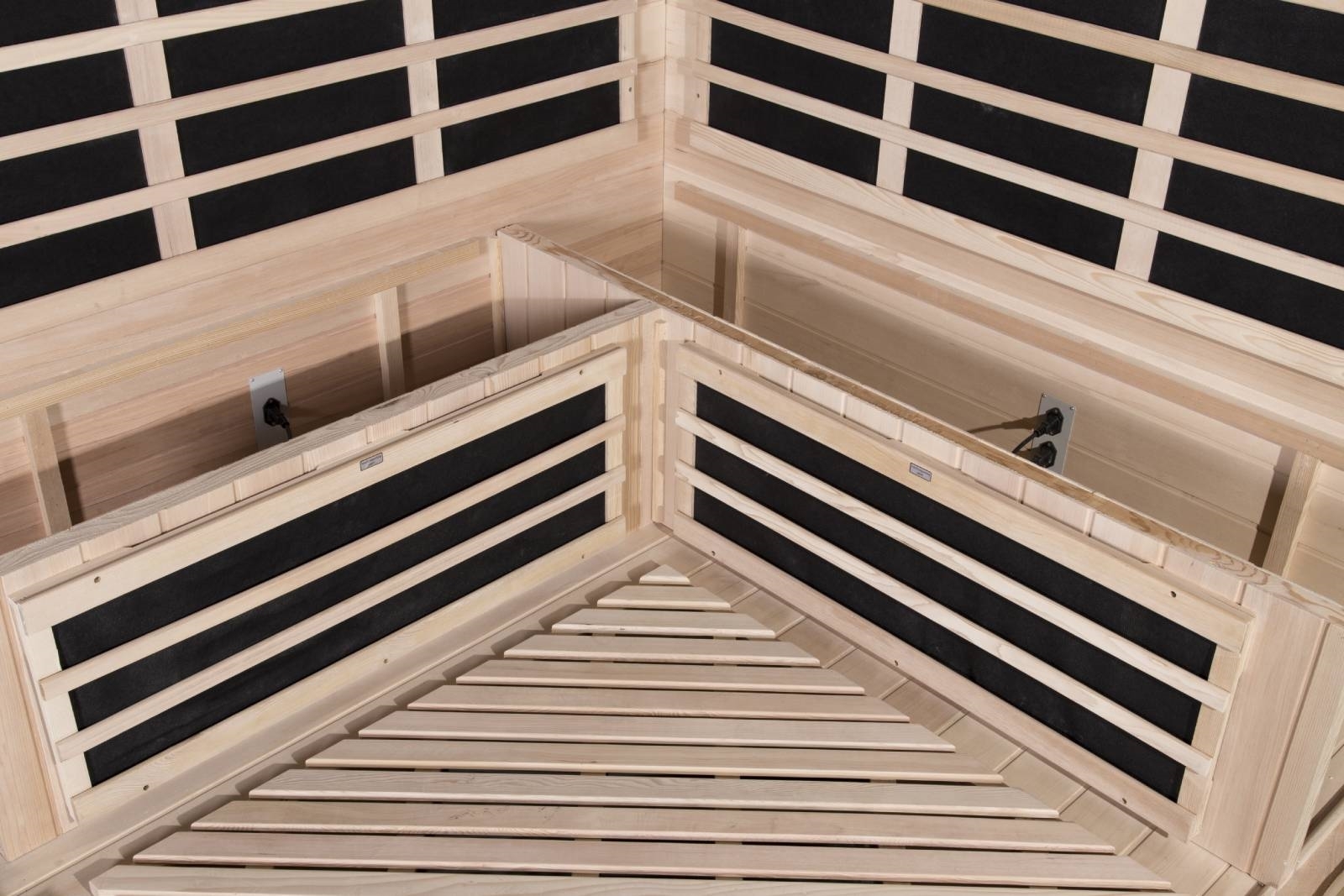 Marimex FAMILY 2001 XXL je veľmi priestranná a dômyselne usporiadaná infrasauna. Ako jedna z mála je určená na umiestnenie v rohu miestnosti. Strop, boky, podlaha a celý interiér infrasauny sú vyrobené z kanadského hemlocku - veľmi odolného a stabilného dreva. Celá predná časť infrasauny je sklenená a poskytuje široký uhol pohľadu von. Vo vnútri nájdete dve lavice v tvare písmena L. V sede sa na nich zmestia 4 a viac osôb a v polosede sa pohodlne zmestia dve osoby. Ak sa saunujete sami, môžete si blahodarné účinky vychutnať aj v ľahu. Veľký priestor však nie je jedinou výhodou infrasauny.
