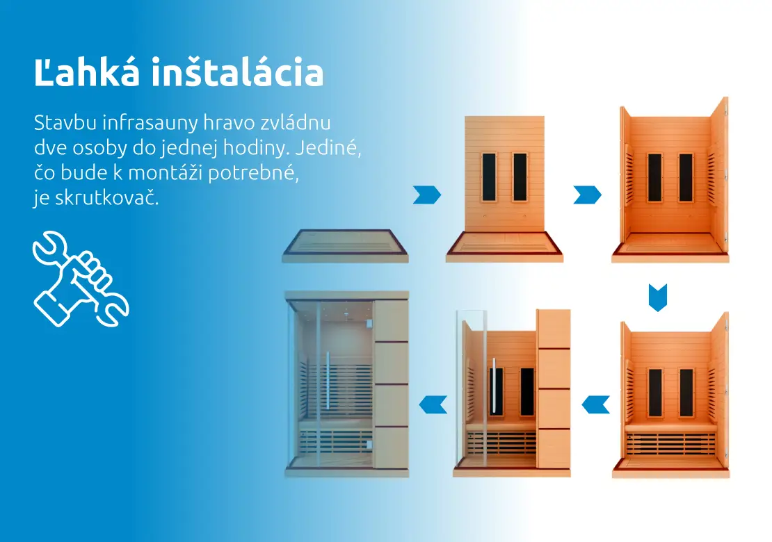Jednoduchá inštaláciaStavbu infrasauny hravo zvládnu dve osoby do jednej hodiny. Jediné, čo bude k montáži potrebné, je skrutkovač. |