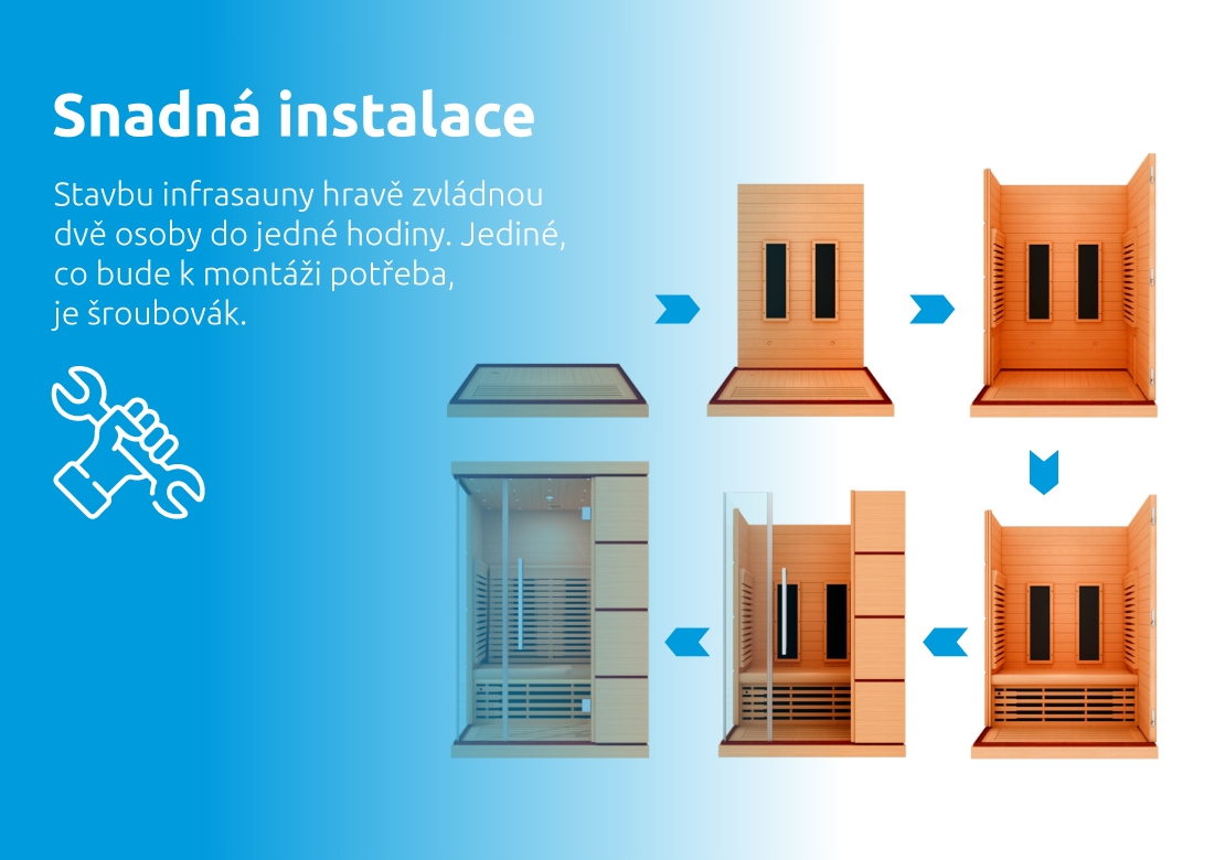 Stavbu infrasauny zvládnu dvaja ľudia v priebehu jednej hodiny. Na montáž budete potrebovať iba skrutkovač.