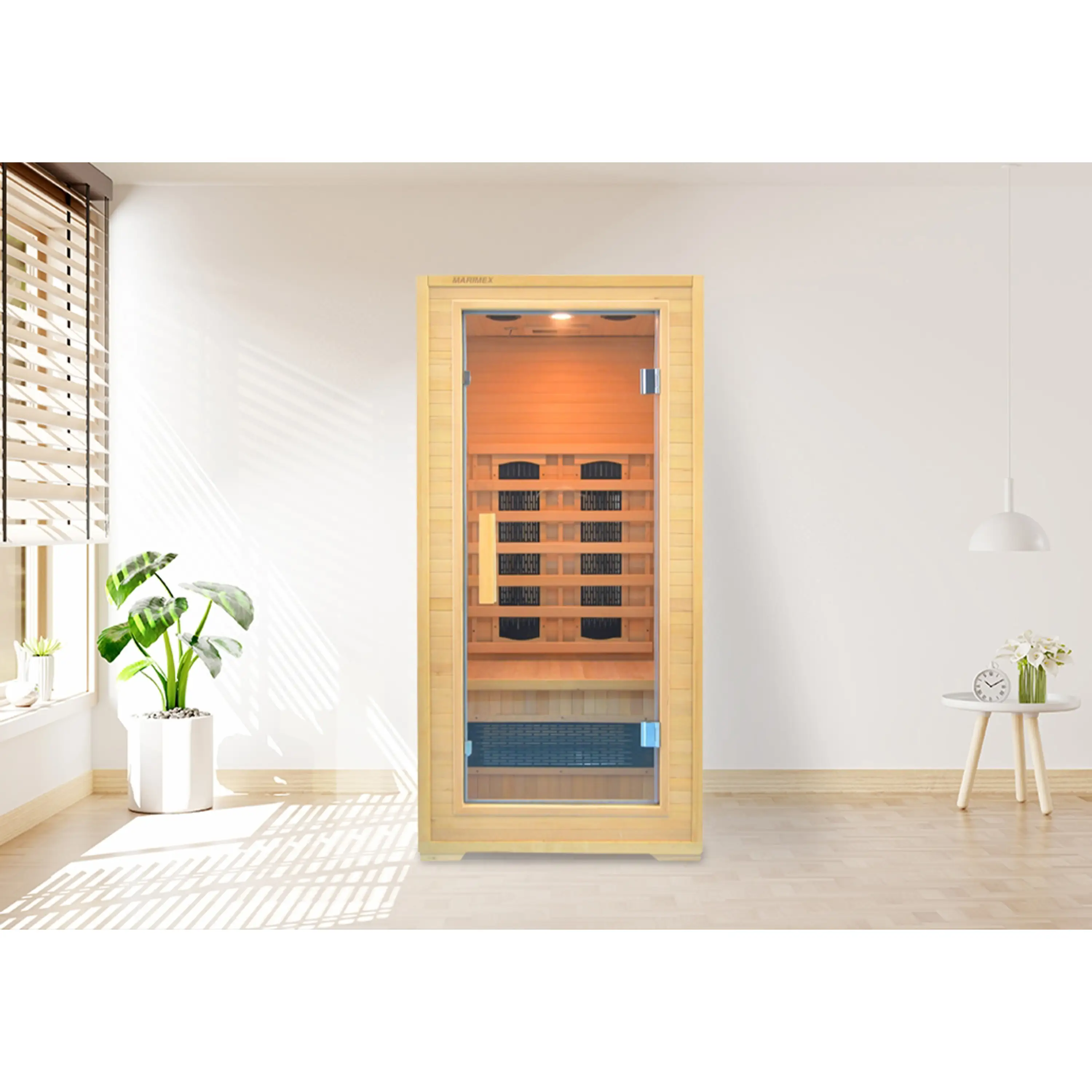 Infrasauna Marimex SMART 1000 M sa vďaka svojmu univerzálnemu dizajnu hodí do každého interiéru. Pri výrobe bolo použité kvalitné drevo kanadského jedľovca - hemlocku. Infrasauna Marimex SMART 1000 M umožňuje vychutnať si kúzlo saunovania jednej osobe. Malé rozmery dovoľujú infrasaunu umiestniť v rodinnom dome aj priestrannejšom byte. Sklenené dvere umožňujú pohodlný výhľad po okolí sauny. Konštrukcia infrasauny nedovoľuje zmeniť smer otvárania dverí.
