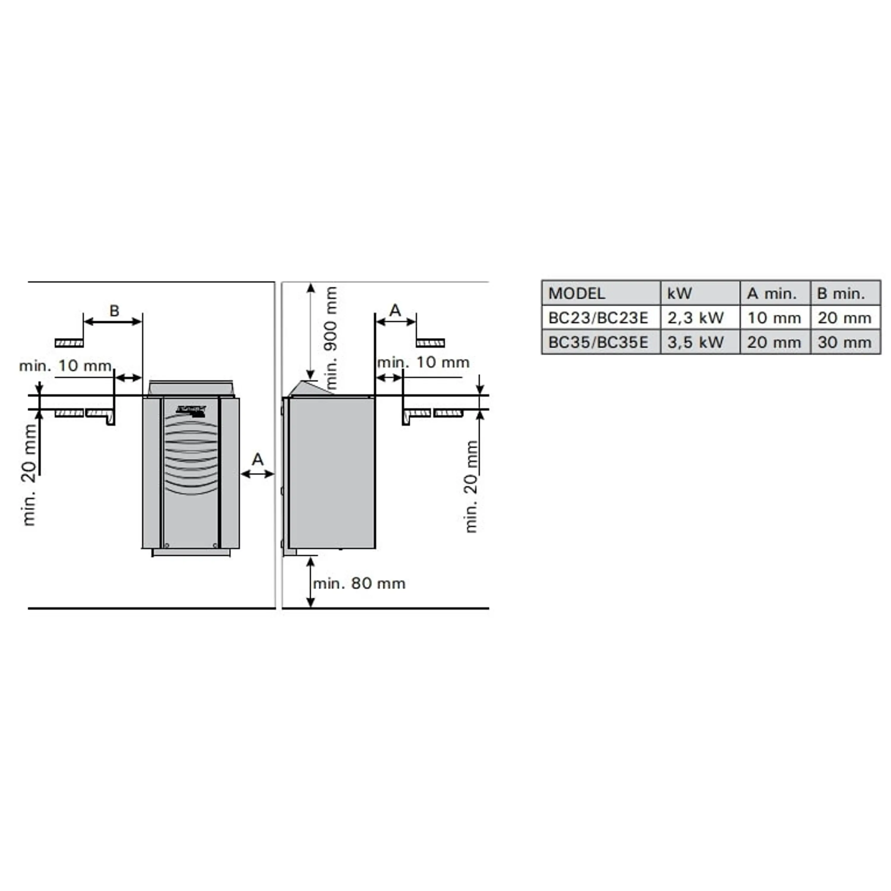 - Bezpečnostná vzdialenosť A k stene: 20 mm