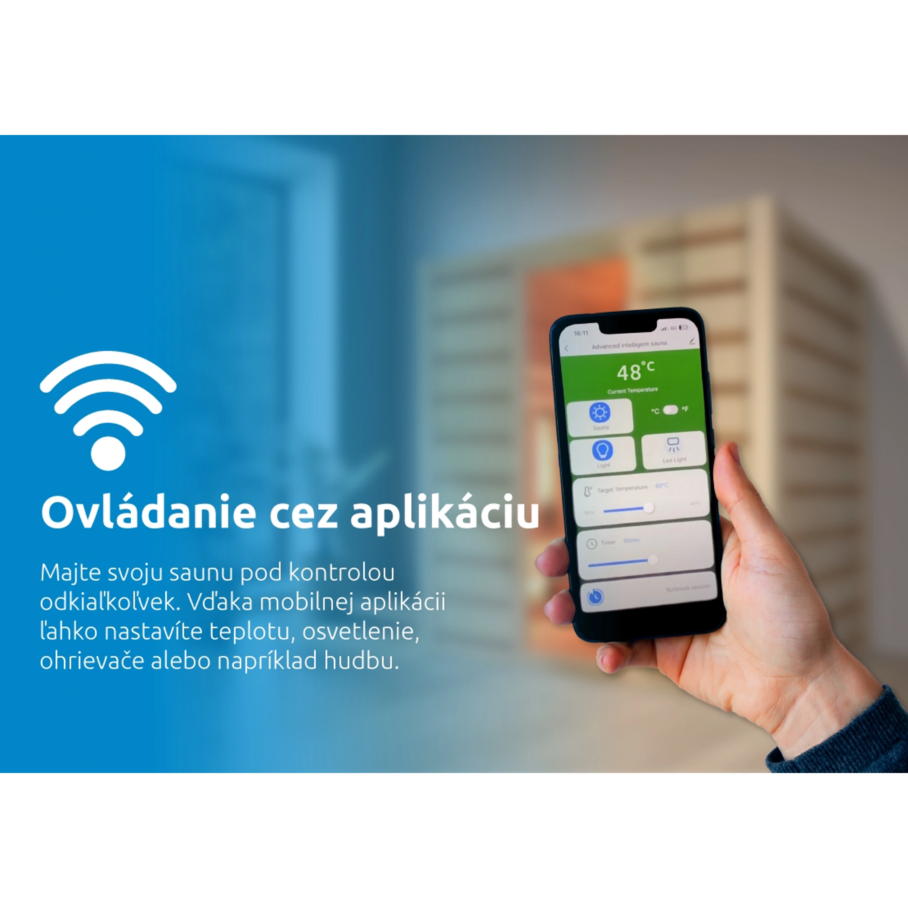 Majte svoju saunu pod kontrolou odkiaľkoľvek. Vďaka integrovanému Wi-Fi modulu môžete vzdialene meniť nastavenia cez mobilnú aplikáciu. Ľahko nastavíte teplotu, osvetlenie, ohrievače alebo hudbu – všetko, čo by ste bežne ovládali na displeji sauny. Aplikáciu je možné prepojiť aj so šikovnými domácnosťami, takže ovládanie sa stane súčasťou vášho bežného komfortu.