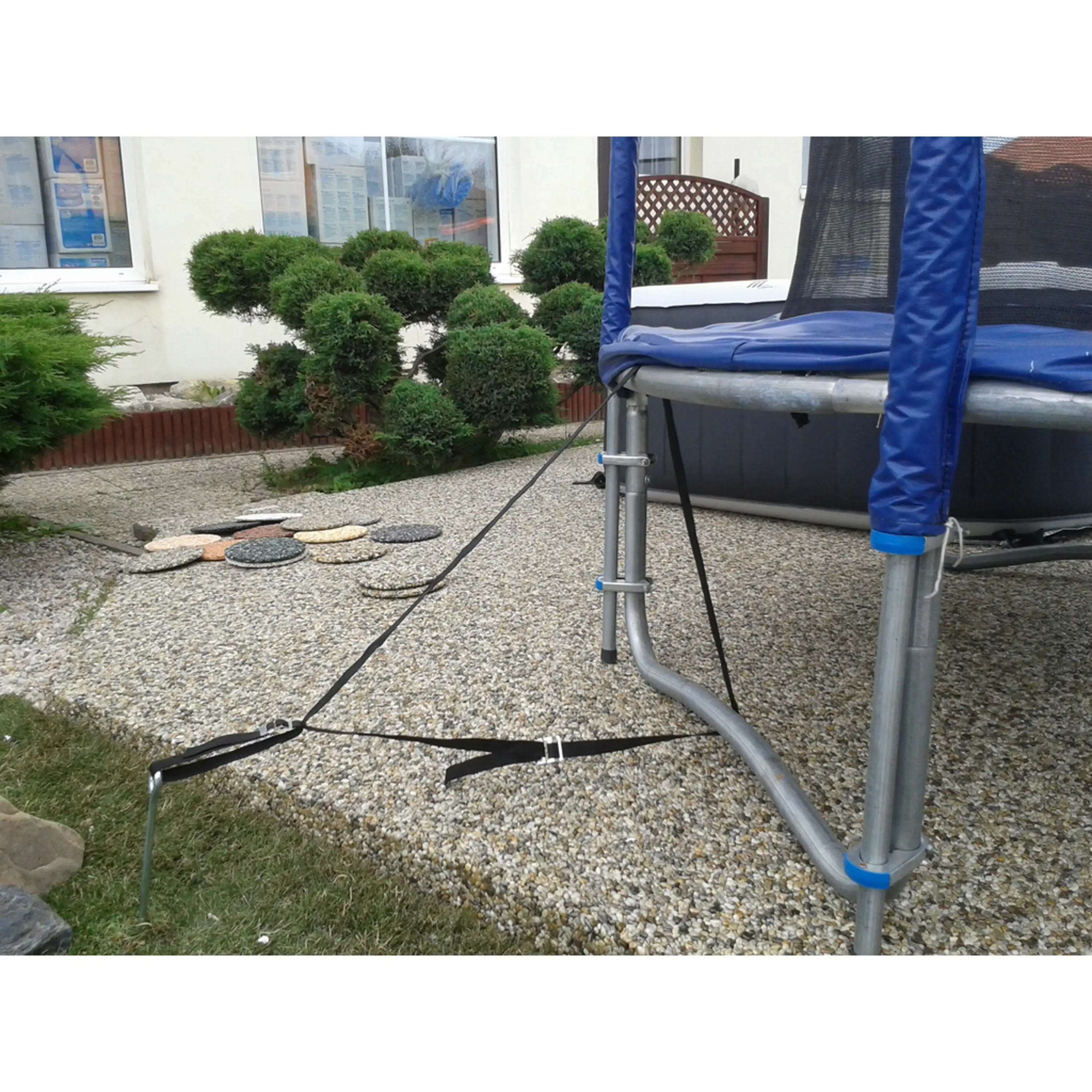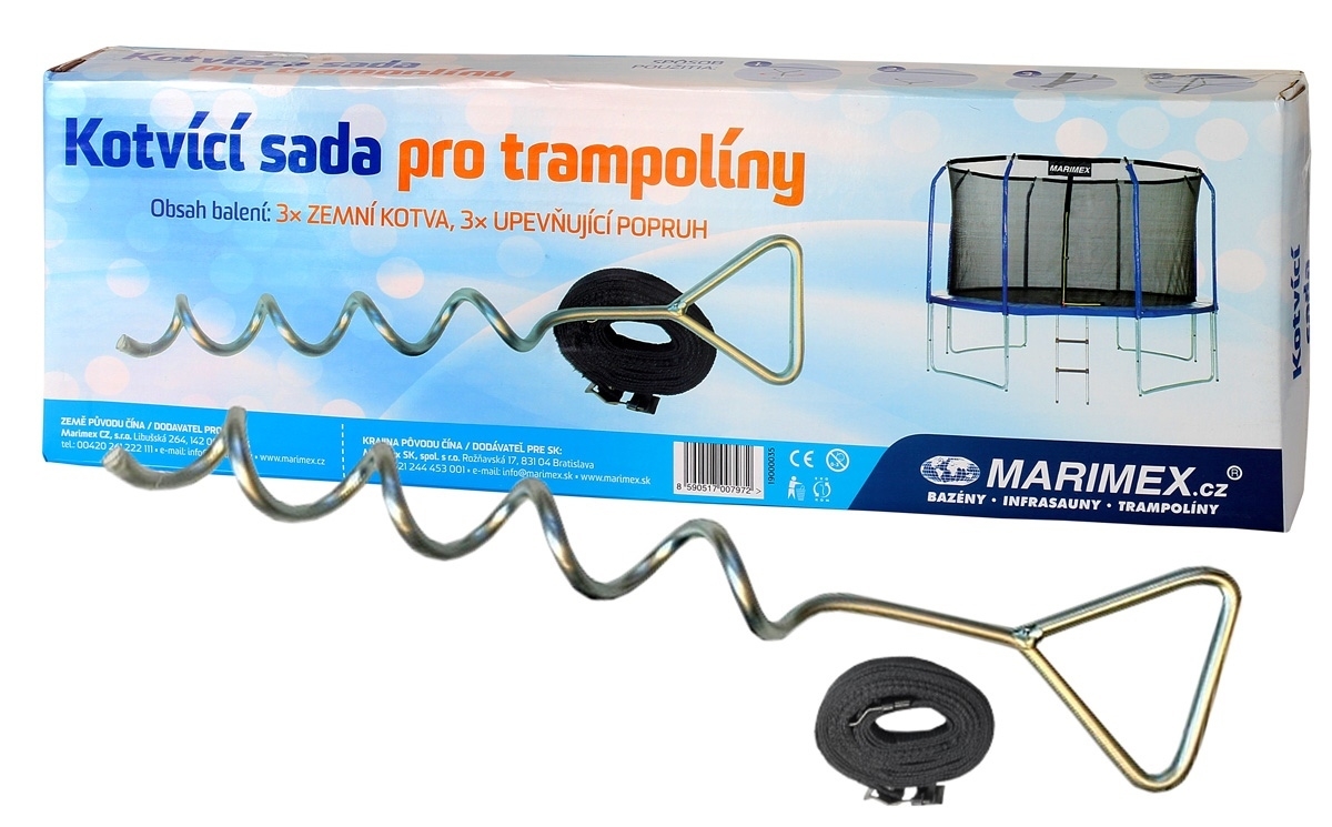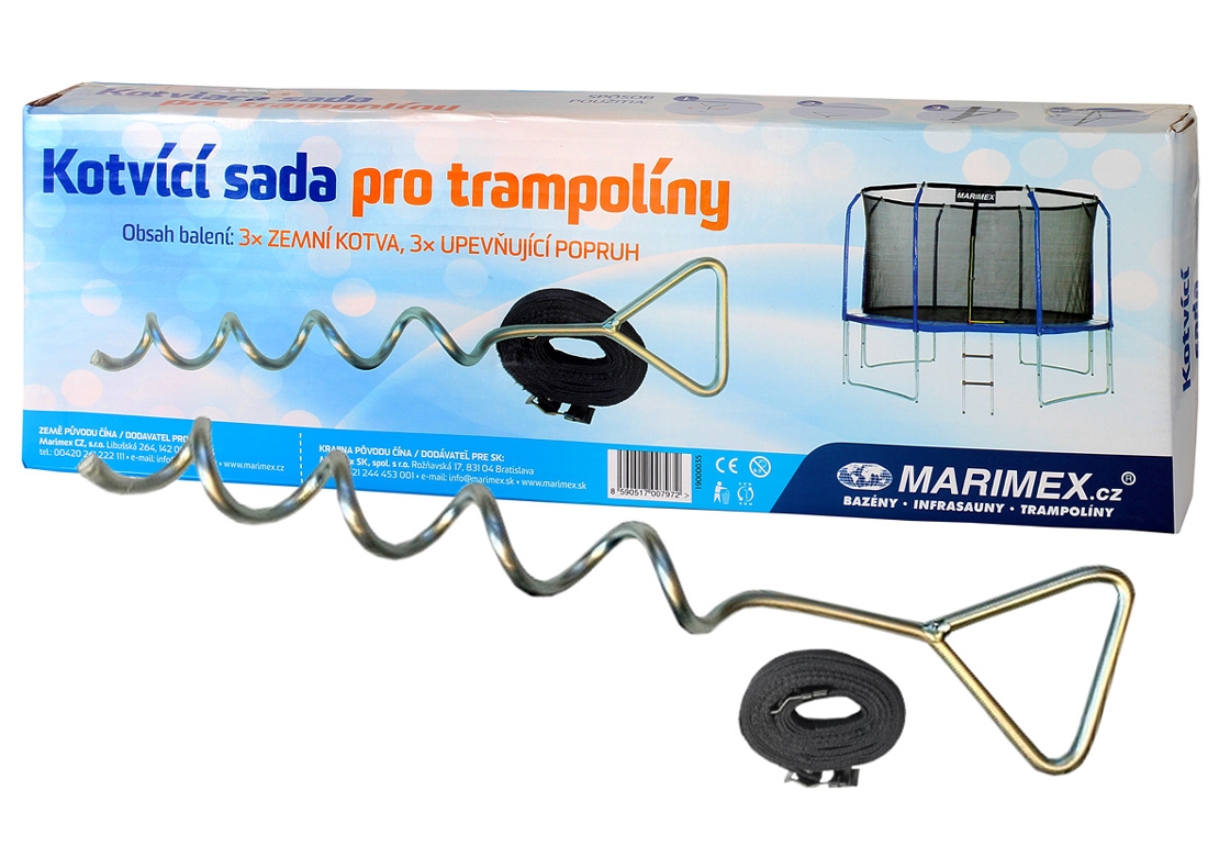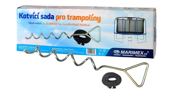 S kotviacou sadou je možné rýchlo a jednoducho pripevnit trampolínu k zemi a zaistiť tak jej dokonalú stabilitu. Sada sa skladá zo spojovacích pásov s prackami a bodákmi s protihrotom. Po zaistení kotviacou sadou trampolína odolá aj silnému vetru. Sadu je možné použiť na zpevnenie všetkých typov trampolín Marimex.