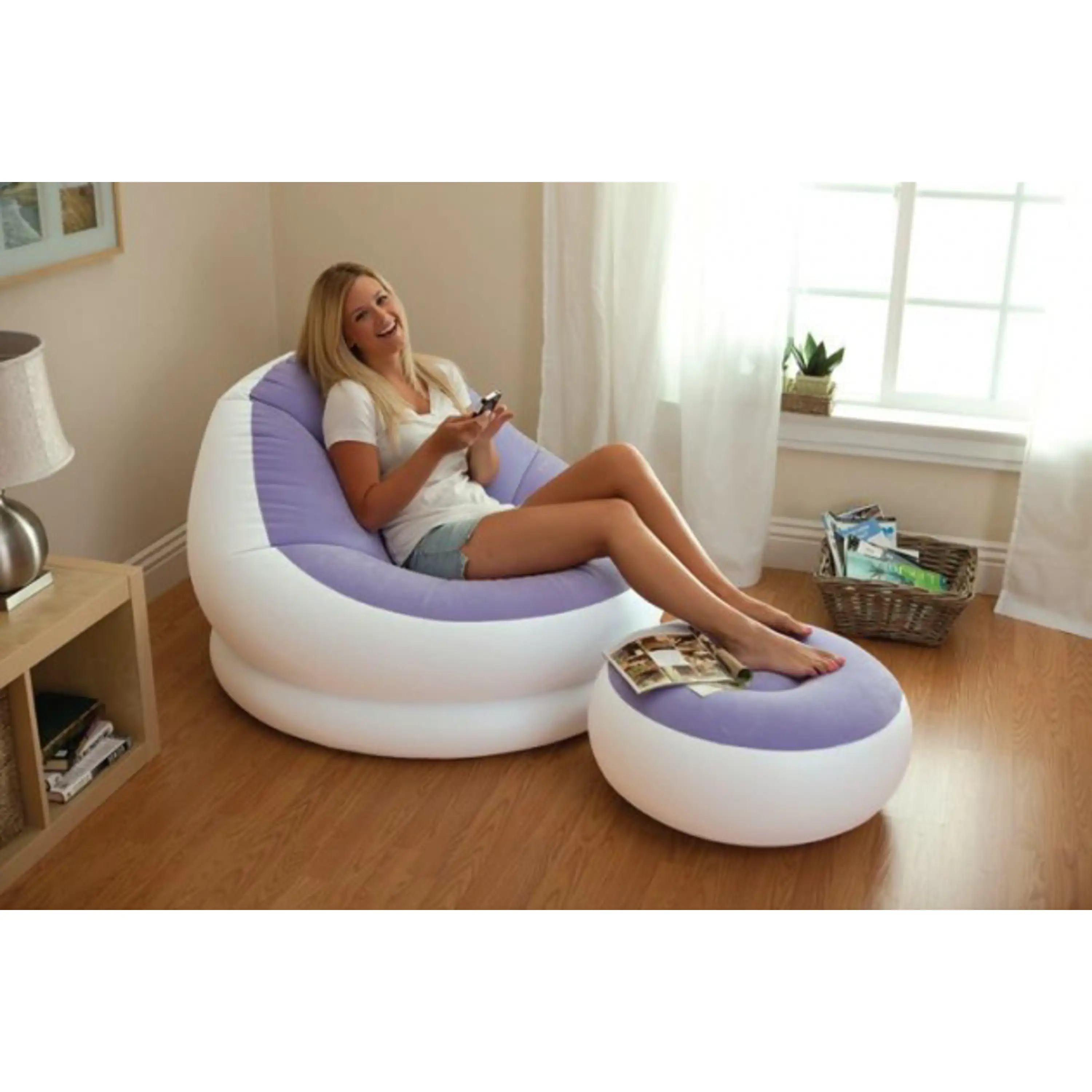 Stačí pripojiť pumpu a nábytok nafúknuť. Ľahko sa presúva a je možné ho zbaliť, bez toho aby zaberal miesto.