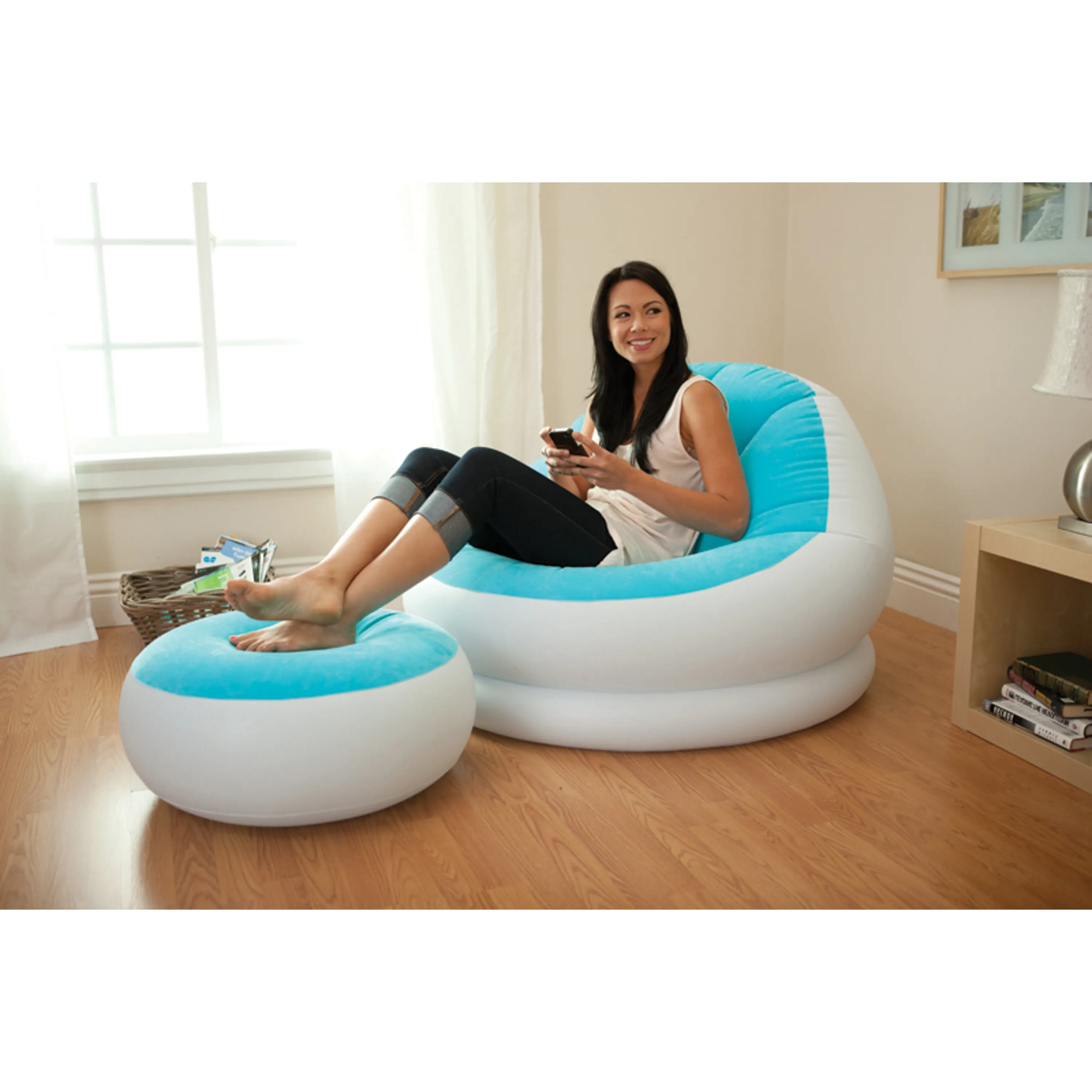 Stačí pripojiť pumpu a nábytok nafúknuť. Ľahko sa presúva a je možné ho zbaliť, bez toho aby zaberal miesto.