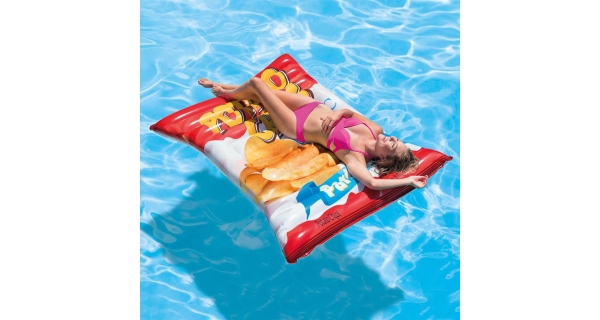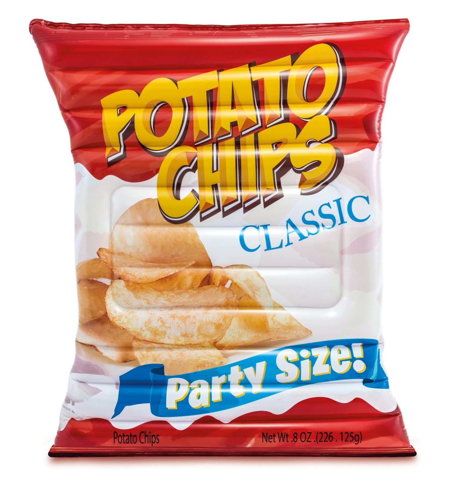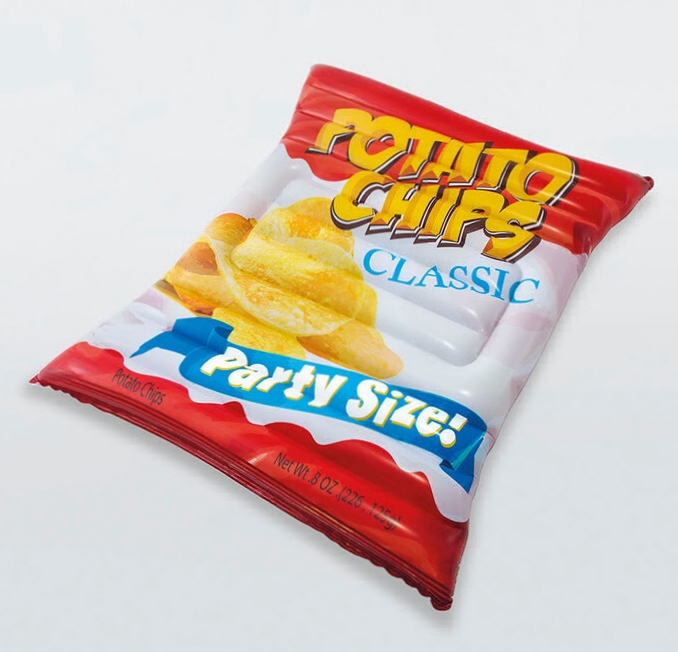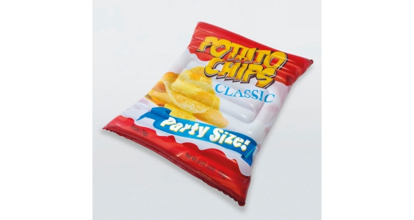 Krásne nafukovacie lehátko v tvare vrecka chipsov, realistická potlač.