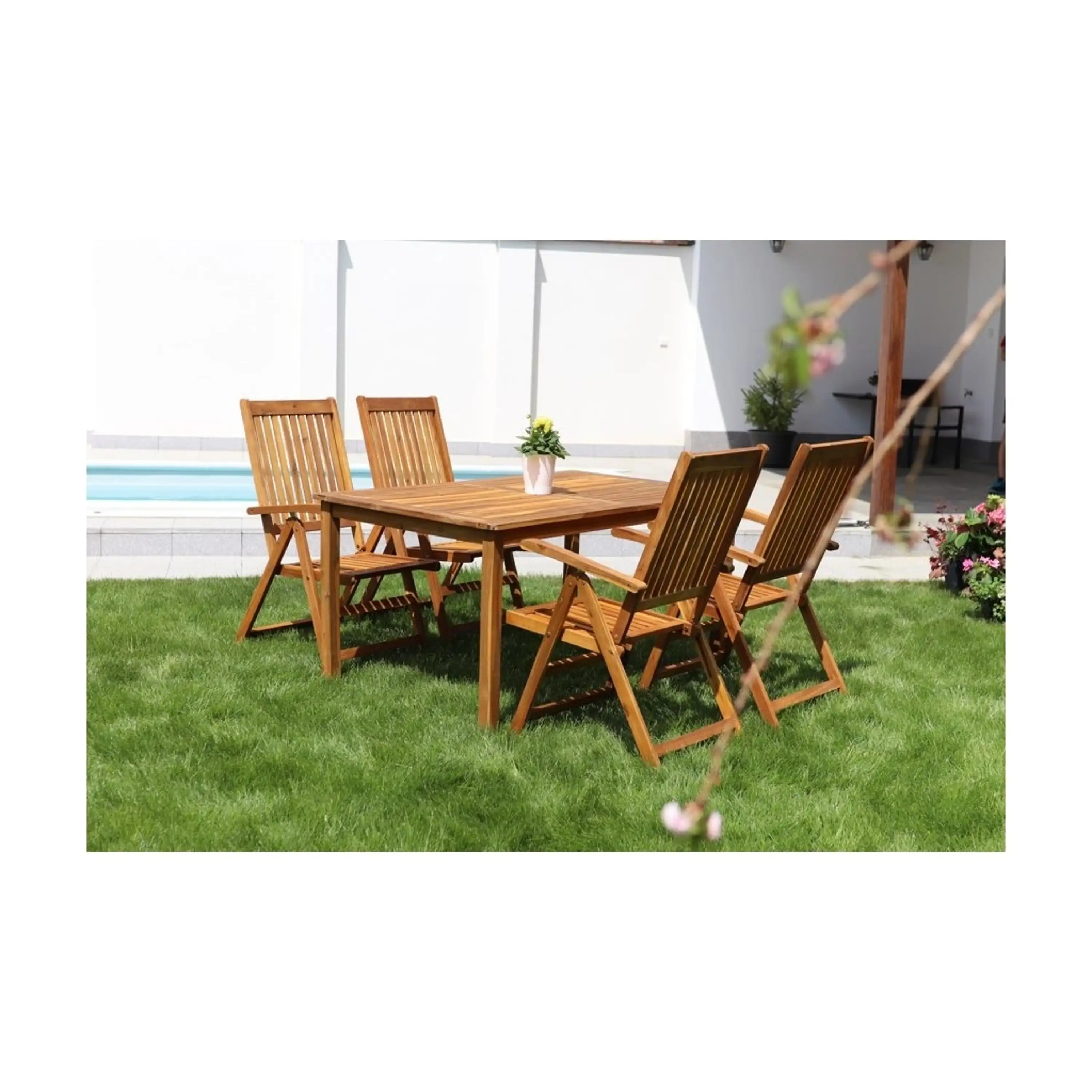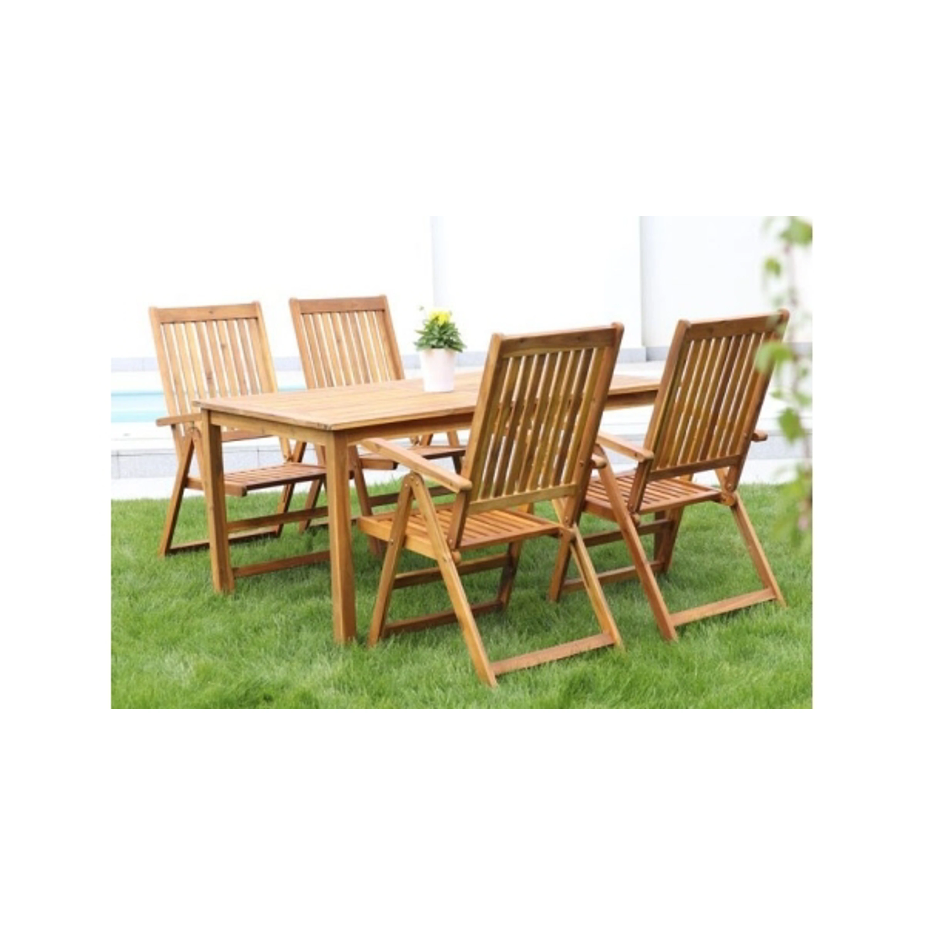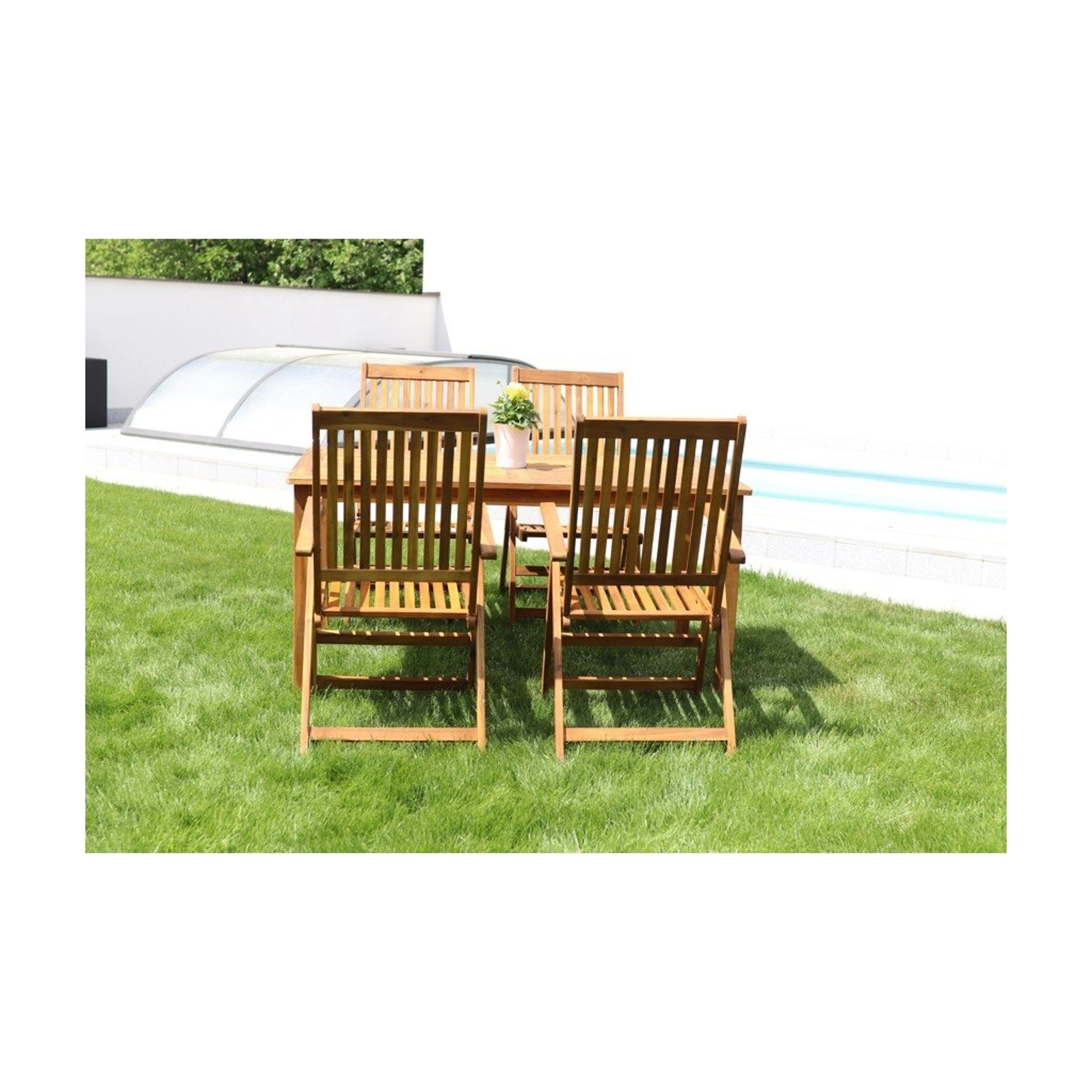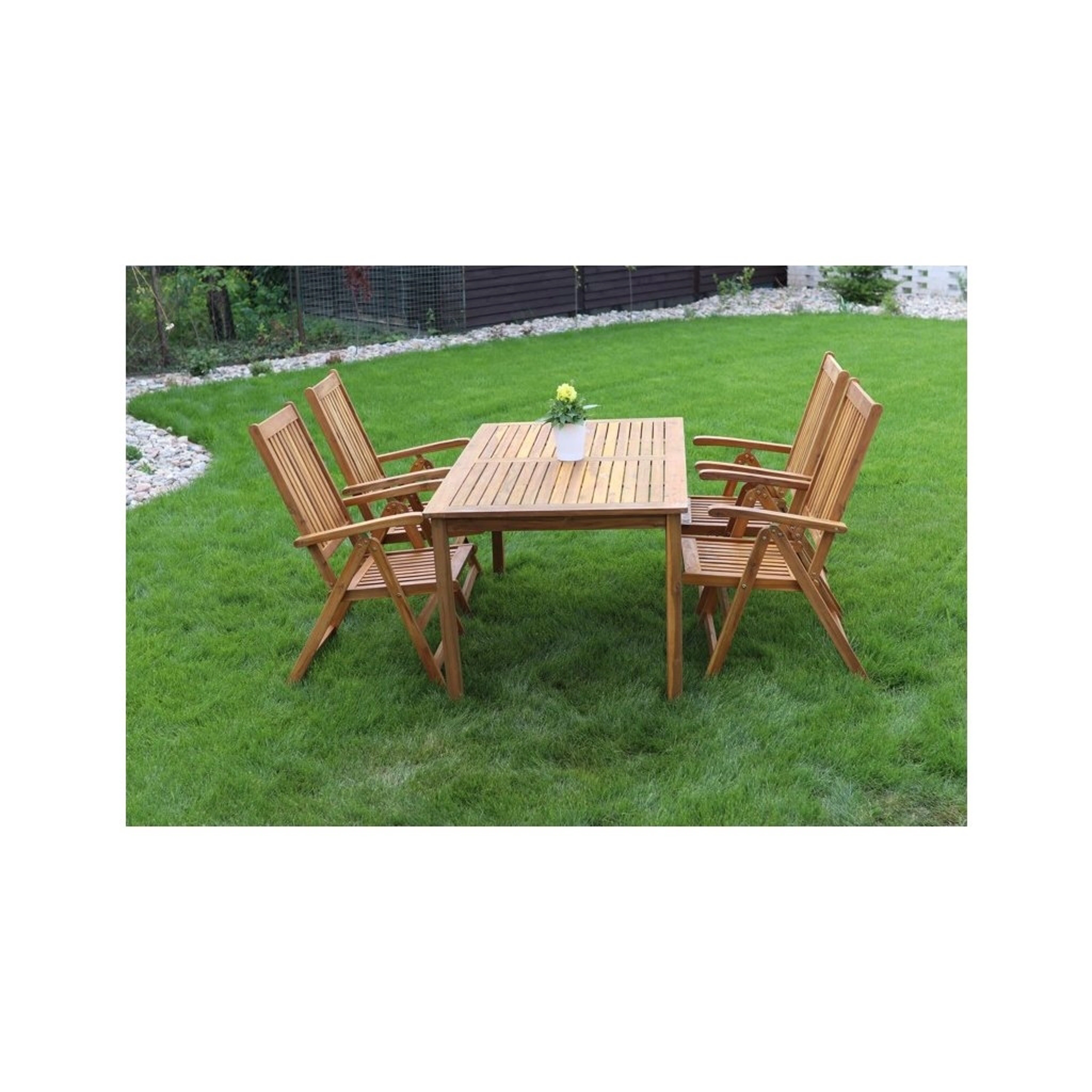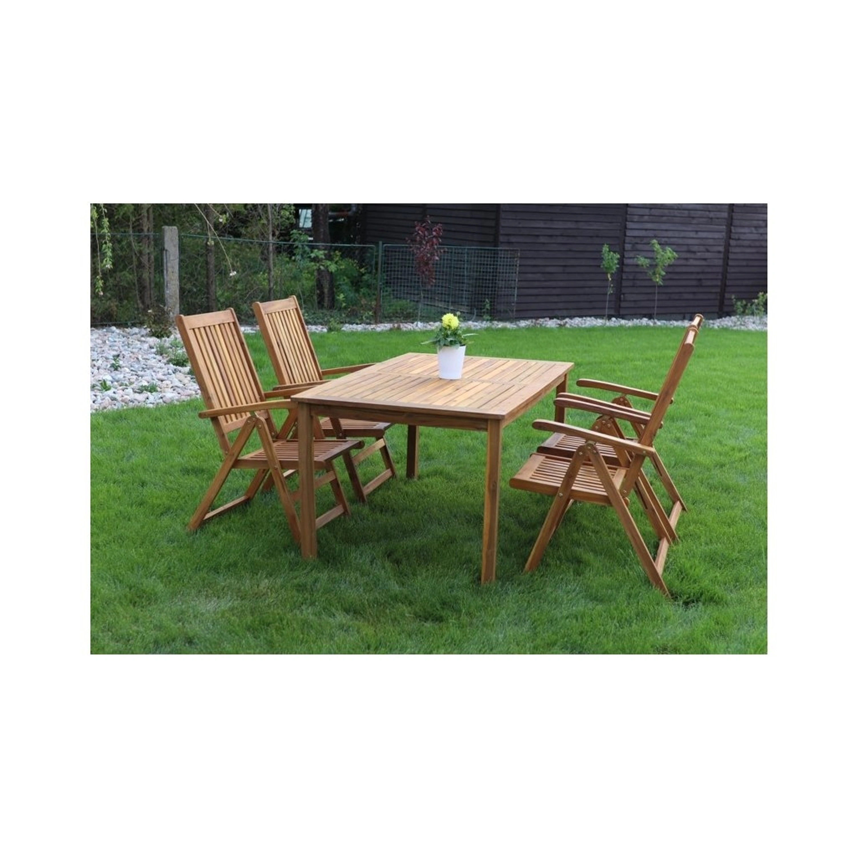 Jedálenský stôl Luc dopĺňajú štyri stoličky Viet vyrobené tiež z akácie. Všetky záhradné stoličky Viet súskladacie. Pri uskladnení po sezóne v zloženom stave nezaberú veľa miesta.