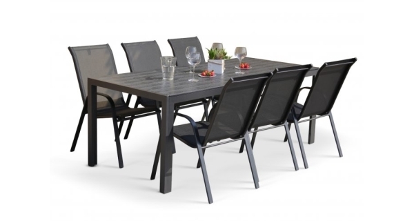 Zostava zahŕňa krásny stôl vyrobený z materiálov, ktoré nevyžadujú zvláštnu údržbu. Konštrukcia z hliníka ošetreného proti hrdzi, doska stola z Artwoodu a adaptéry na nohách pre väčšiu stabilitu. Klasické tvary a čierne prevedenie stola.