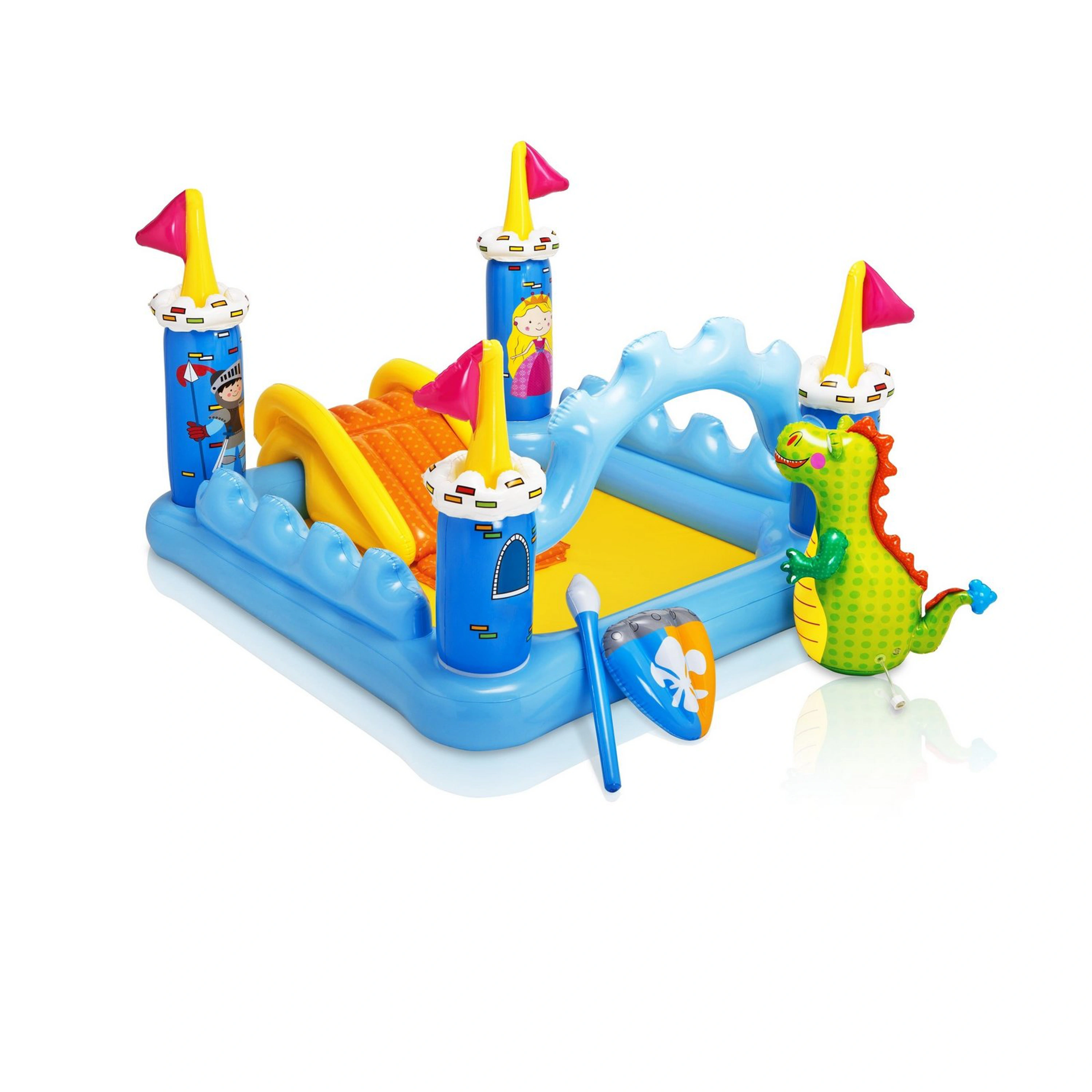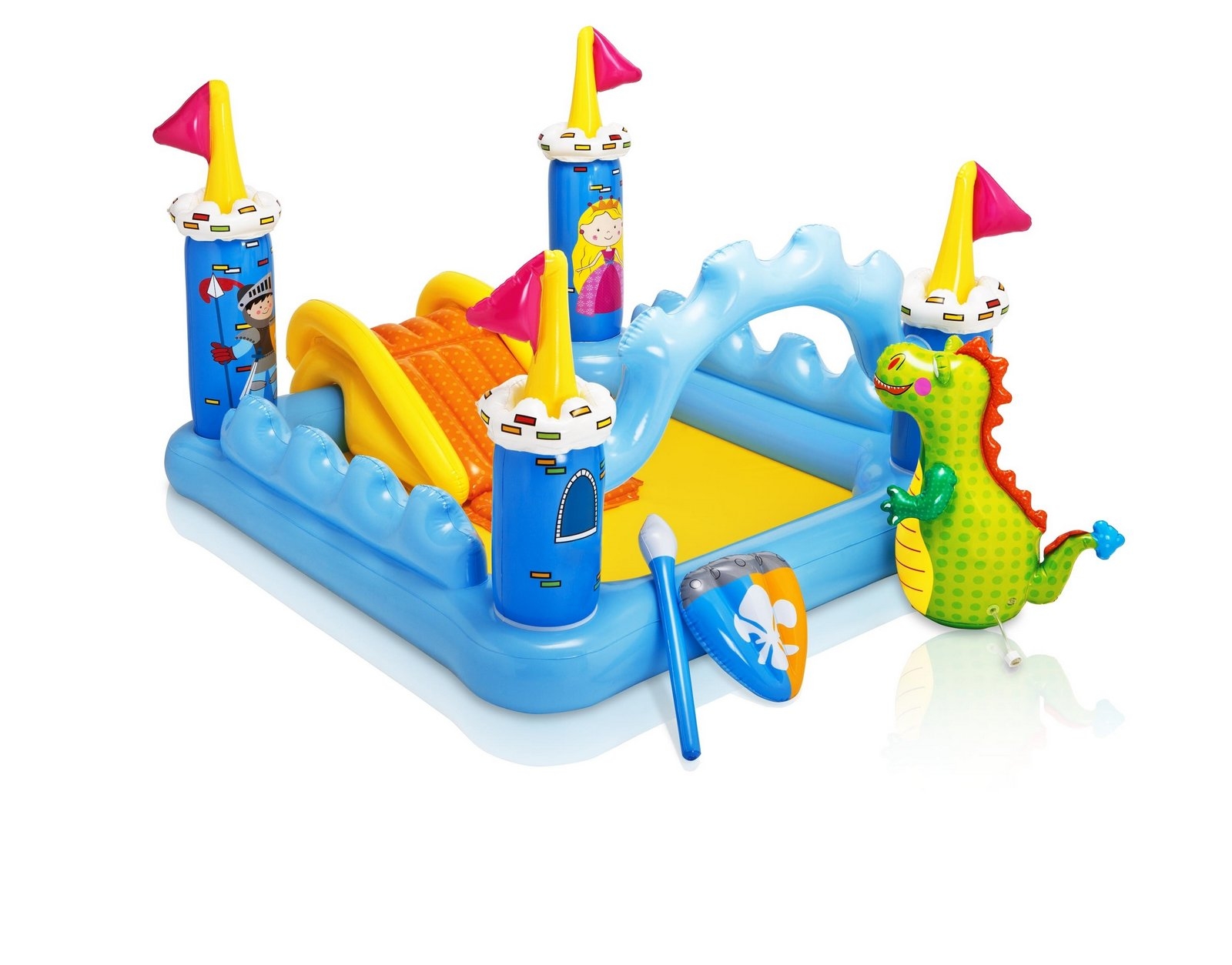 - Príslušenstvo obsahuje: nafukovacieho draka s vodotryskom (pripojiteľný na záhradnú hadicu), štít, kopiu, opravnú sadu a výpustný ventil
