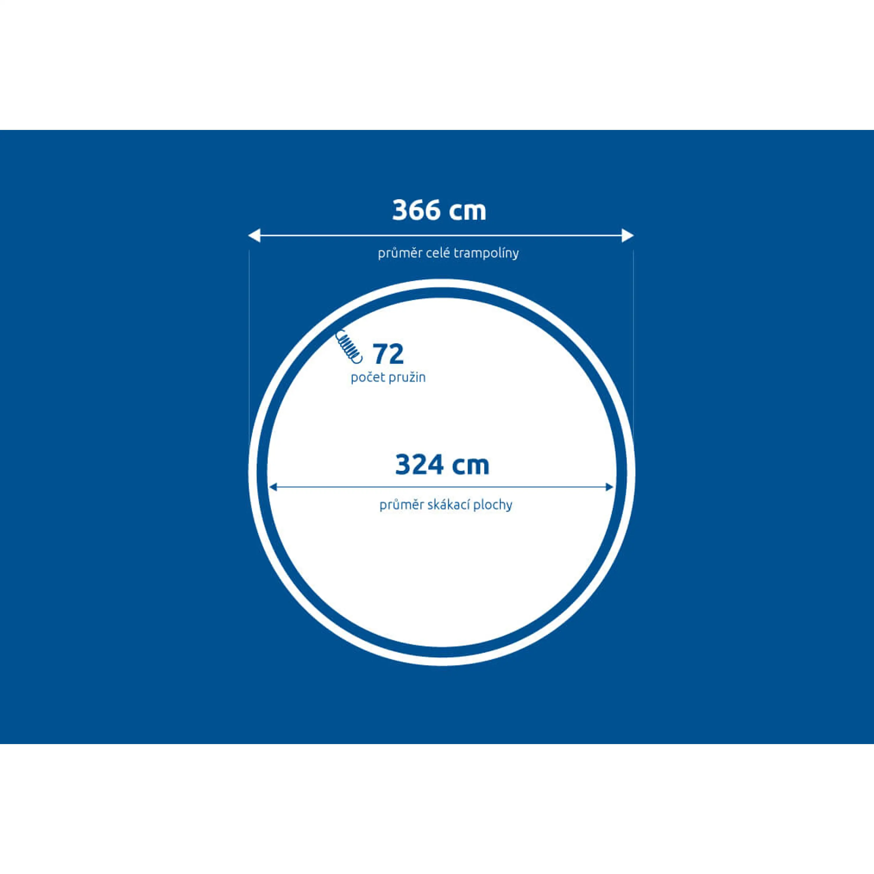 Priemer skákacej plochy: 324 cm (Meria sa po vlákne tkaniny - od jedného okraja k druhému cez stred, tolerancia rozmeru ± 2 cm).