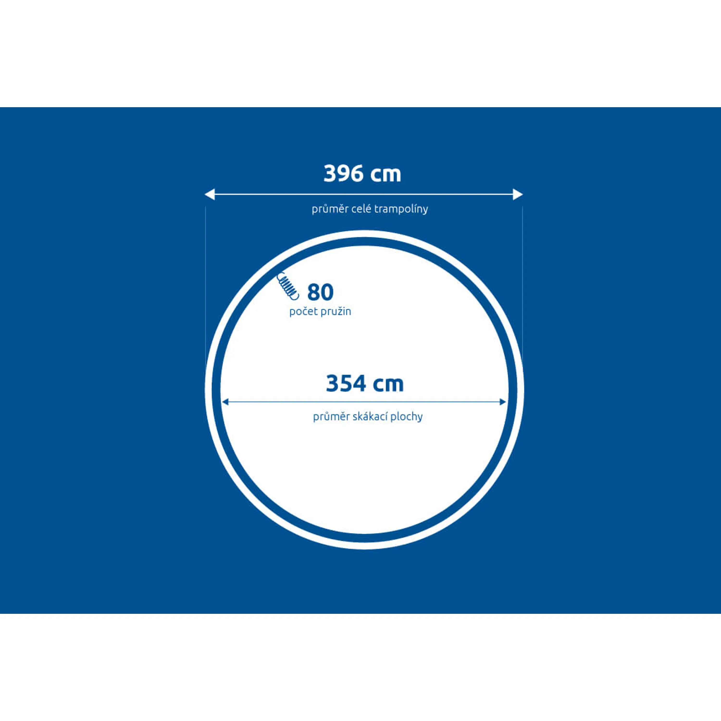 Priemer skákacej plochy: 354 cm (Meria sa po vlákne tkaniny - od jedného okraja k druhému cez stred, tolerancia rozmeru ± 2 cm).
