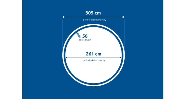 Priemer skákacej plochy: 261 cm (Meria sa po vlákne tkaniny - od jedného okraja k druhému cez stred, tolerancia rozmeru ± 2 cm).