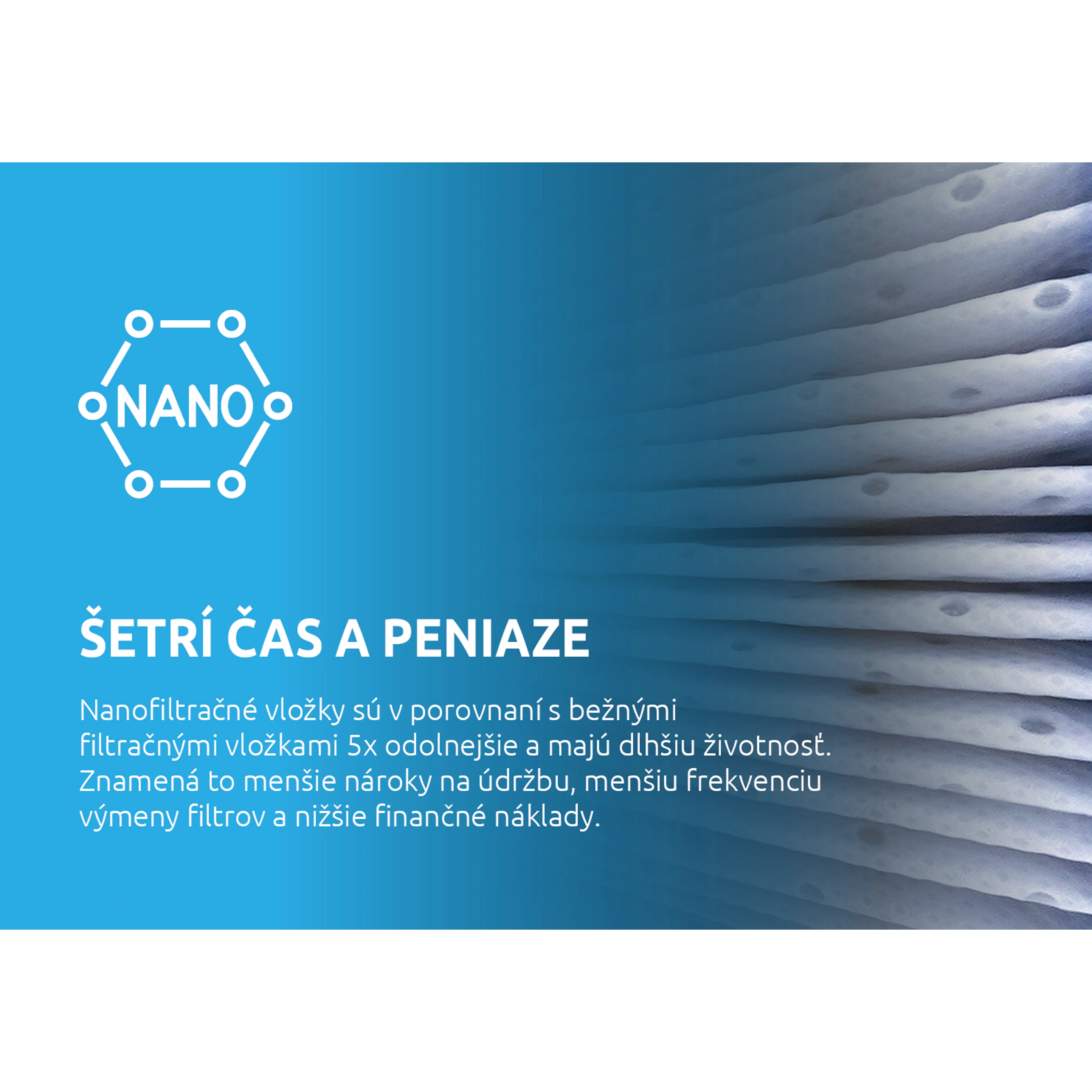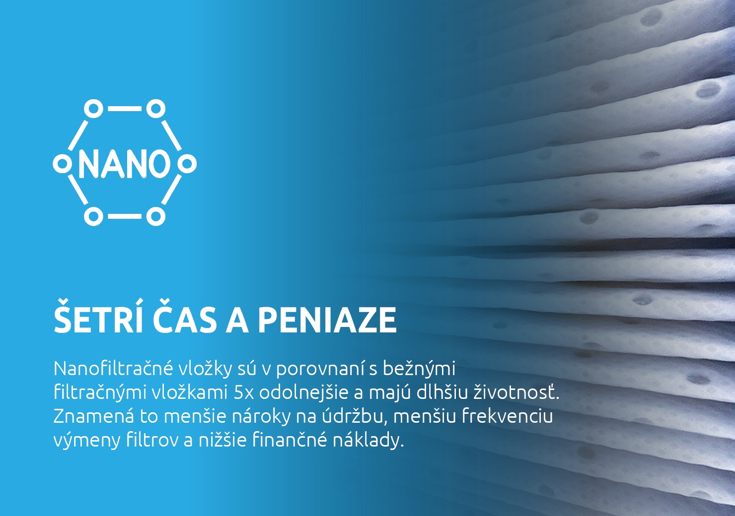 Šetrí čas a peniazeNanofiltračné vložky sú v porovnaní s bežnými filtračnými vložkami odolnejšie a majú 5x dlhšiu životnosť. Znamená to menšie nároky na údržbu, menšiu frekvenciu výmeny filtrov a nižšie finančné náklady. |