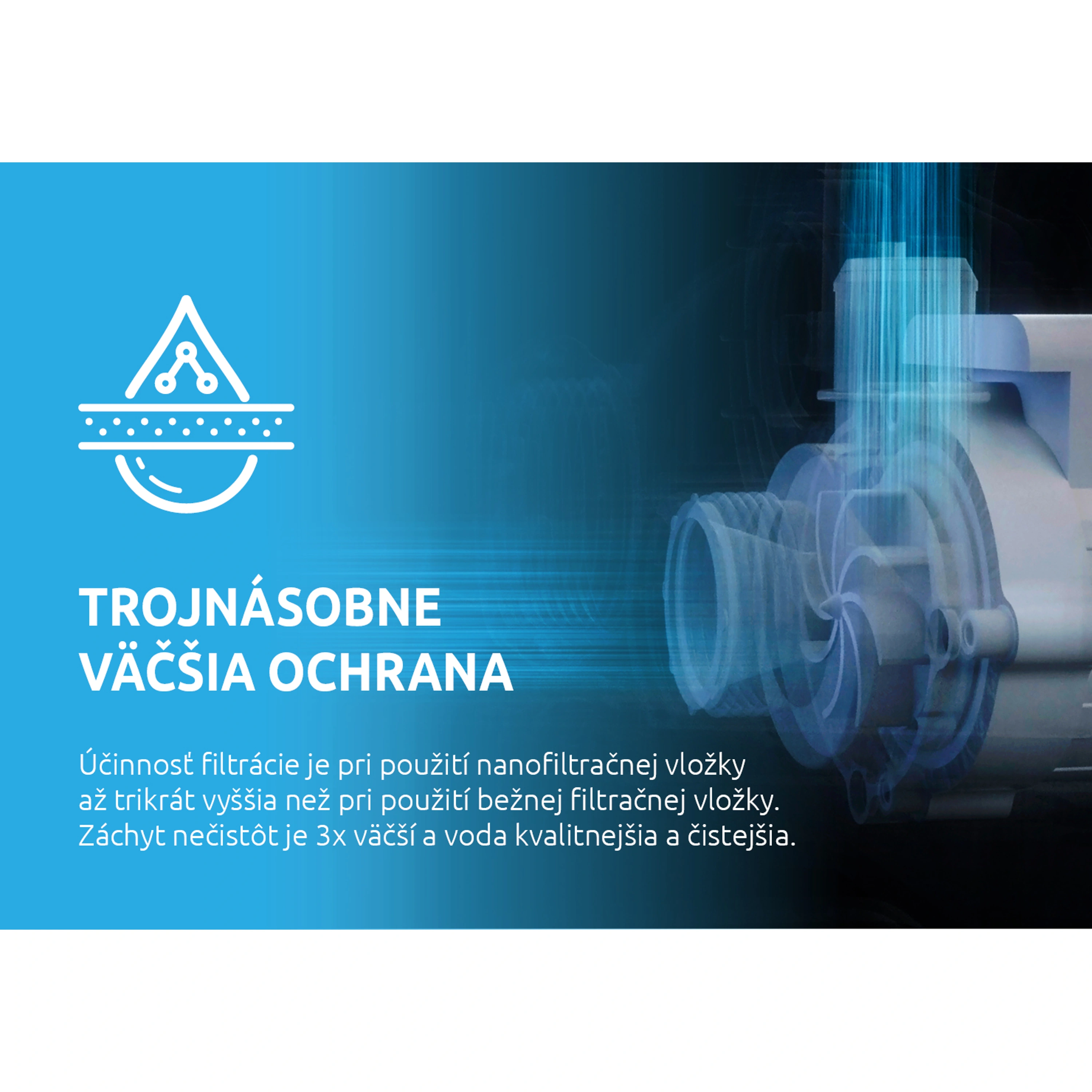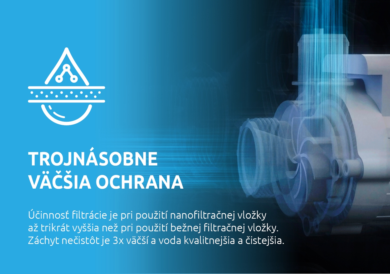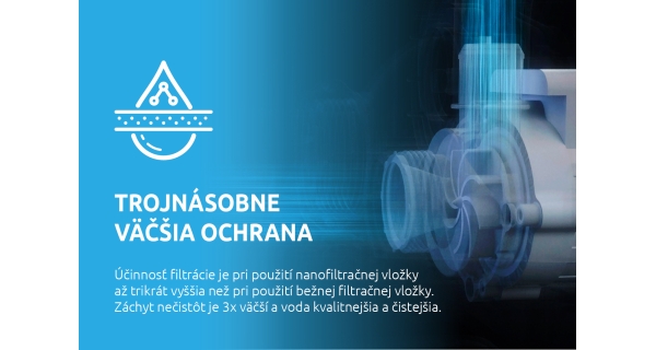 Trojnásobne väčšia ochranaÚčinnosť filtrácie je pri použití nanofiltračnej vložky až trikrát vyššia ako pri použití bežnej filtračnej vložky. Záchyt nečistôt je 3x väčší a voda kvalitnejšia a čistejšia. |