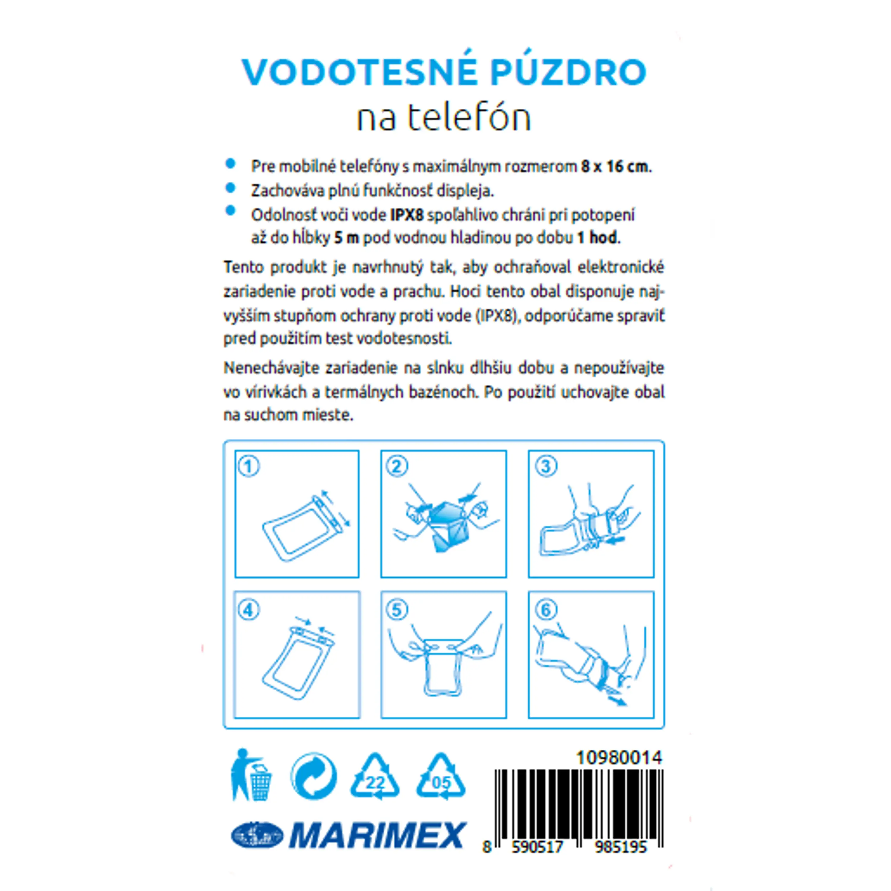 Vodeodolné púzdro na mobil ochráni Váš smartphone pred nepriazňou počasia ako je voda, sneh, ale aj prach. Vhodné pre všetky mobily s maximálnymi rozmermi 8 x 16 cm. Puzdro zachováva plnú funkčnosť displeja. Odolnosť voči vode IPX8 spoľahlivo ochráni mobil pri potopení do hĺbky 5 m pod vodnú hladinu až po dobu 1 hodiny.