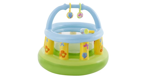 Nafukovacia ohrádka s hrazdičkou . Ohrádka má mäkké nafukovacie dno a okraje , hrazdička má dva motýliky s hrkálkami . Výrobok je vhodný na domáce použitie aj na záhradu .