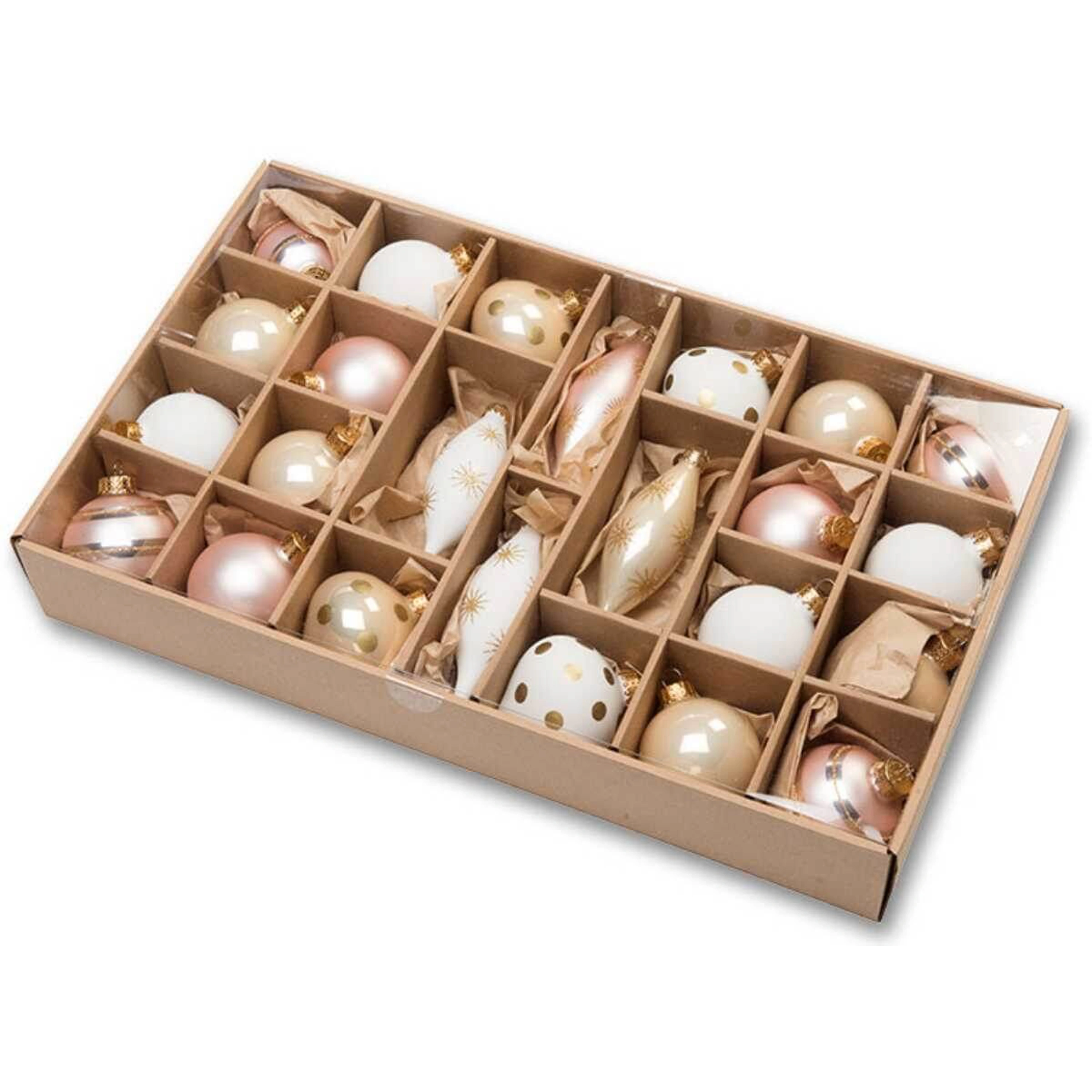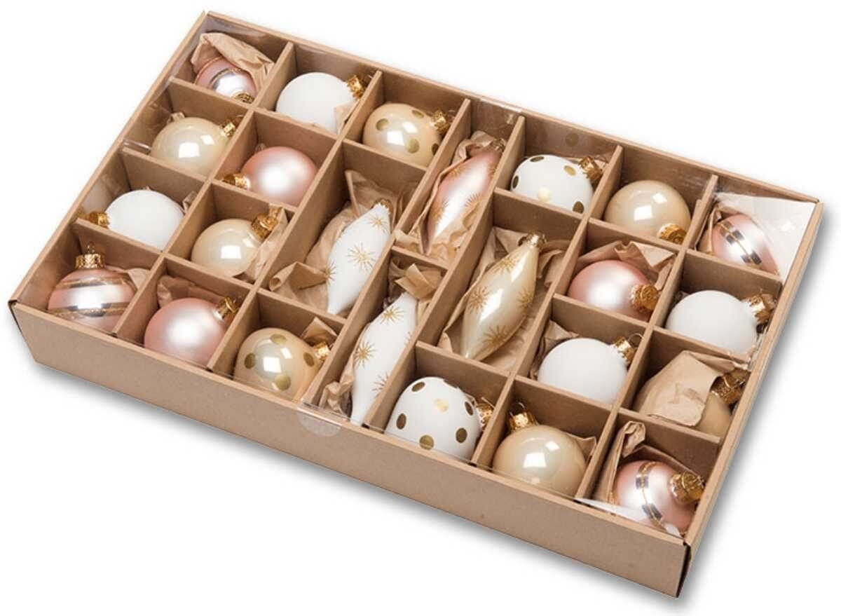 Set obsahuje zlaté, broskyňové a biele kúsky, ktoré povýšia Vianoce na úplne inú úroveň. Exkluzívne kúsky zdobené bodkami, hviezdičkami a decentnými prúžkami (12 ks) dopĺňajú minimalistické kúsky bez zdobenia s matným a lesklým efektom (12 ks).